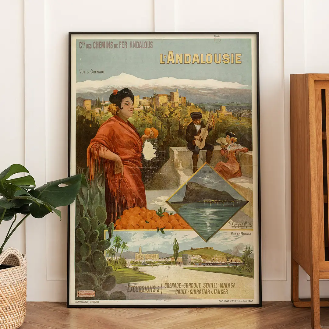 L’Affiche vintage Andalousie « Chemins de Fer Andalous » datant de 1904 illustre l’âge d’or du voyage ferroviaire en Espagne. Dès le premier regard, cette composition transporte le spectateur au cœur de l’Andalousie romantique, entre Grenade, Cordoue, Séville, Malaga et Tanger.