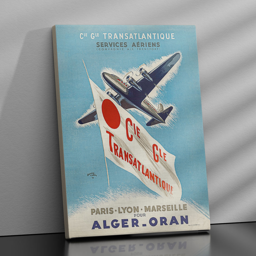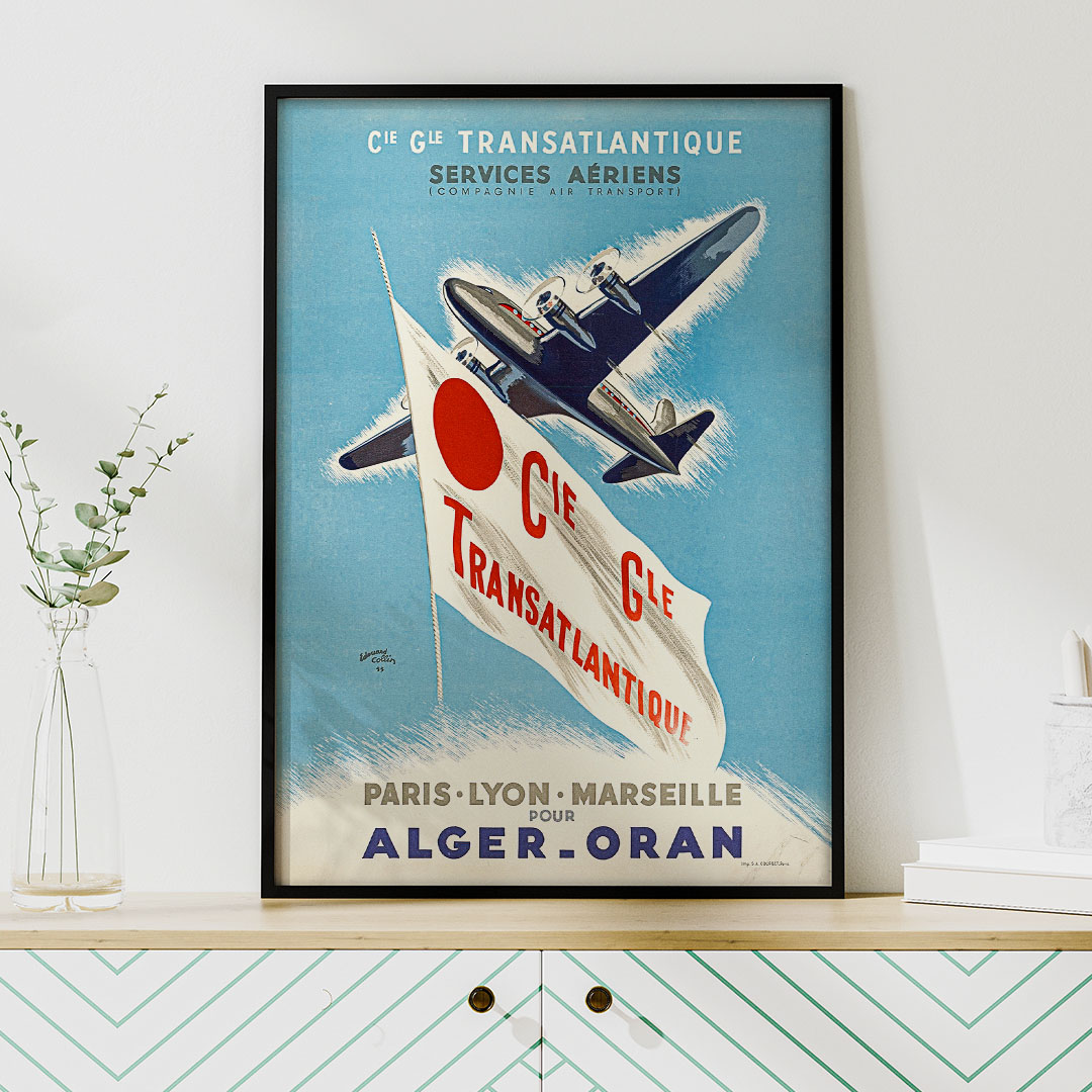 Affiche vintage aviation Algérie – Cie Gle Transatlantique, reproduction Art déco des années 1930 reliant Paris, Lyon et Marseille à Alger et Oran. Illustration aéronautique élégante et historique. Impression premium. Livraison sur toutes les wilayas d’Algérie.