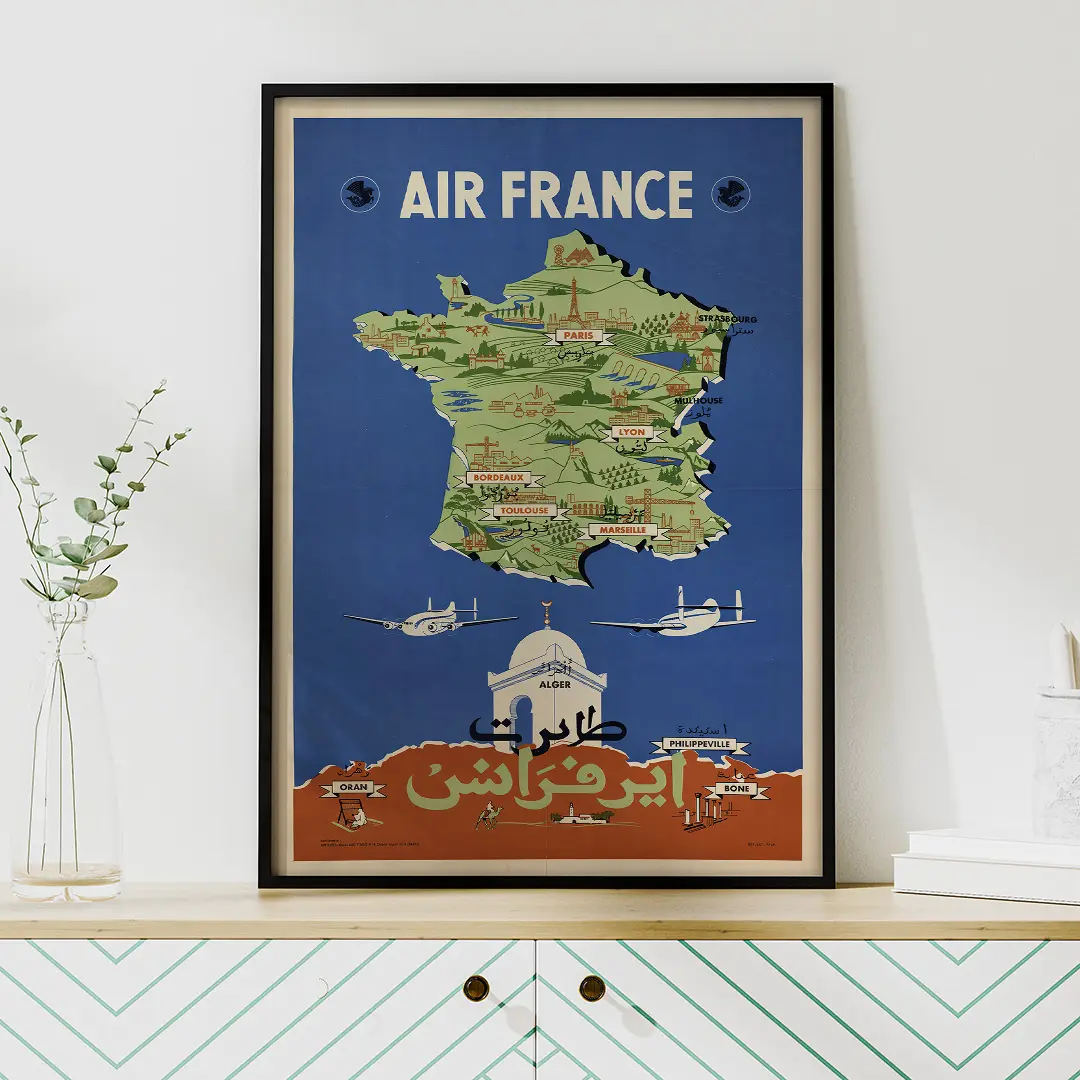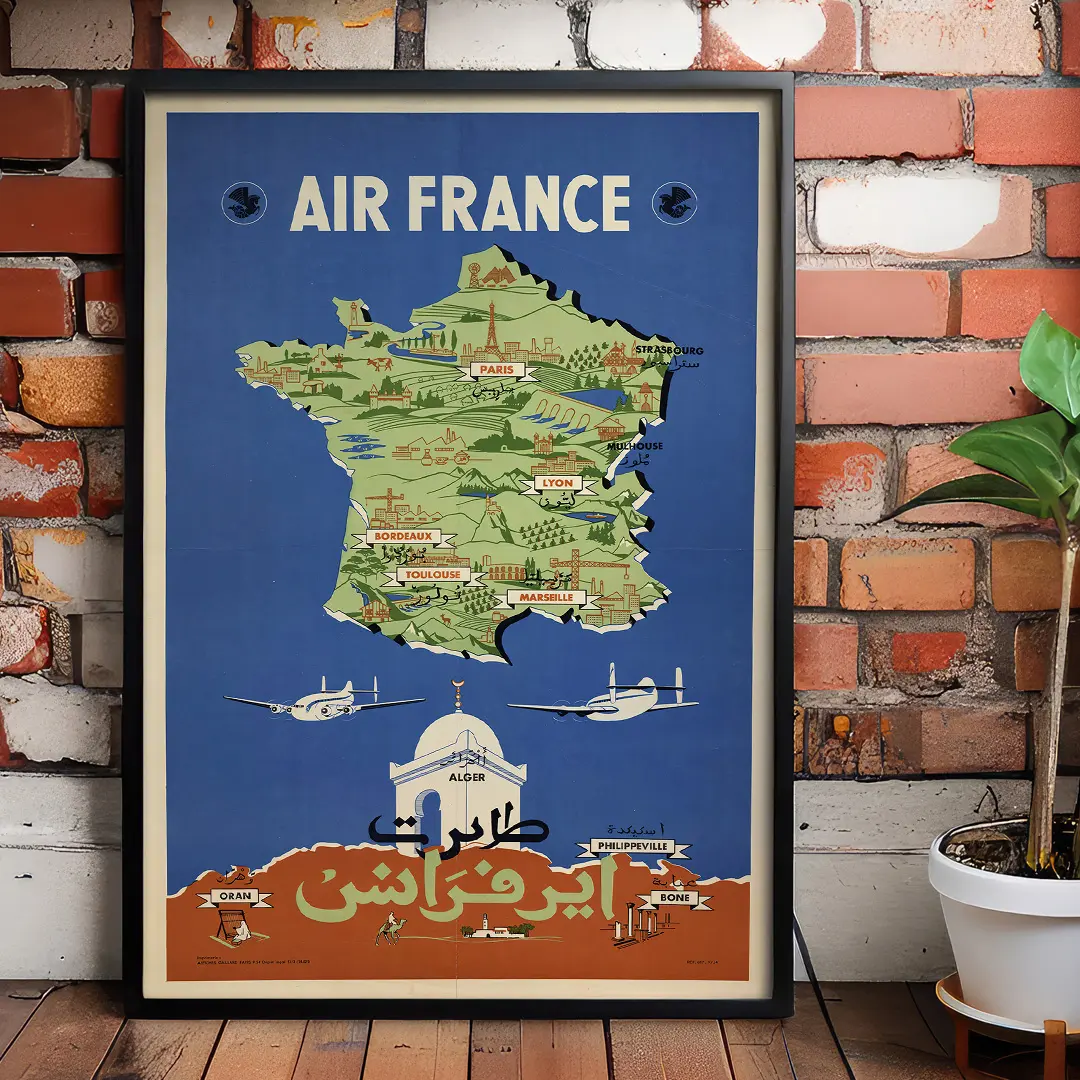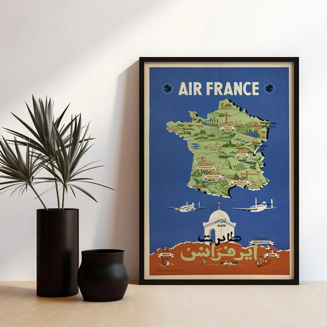 Affiche vintage Air France Afrique du Nord 1954 représentant une carte illustrée de la France et de l’Algérie, avec inscriptions en français et en arabe. Une pièce emblématique du design aéronautique des années 1950. Impression haute qualité sur papier premium. Idéale pour une décoration rétro élégante. Livraison disponible dans toutes les wilayas d’Algérie.