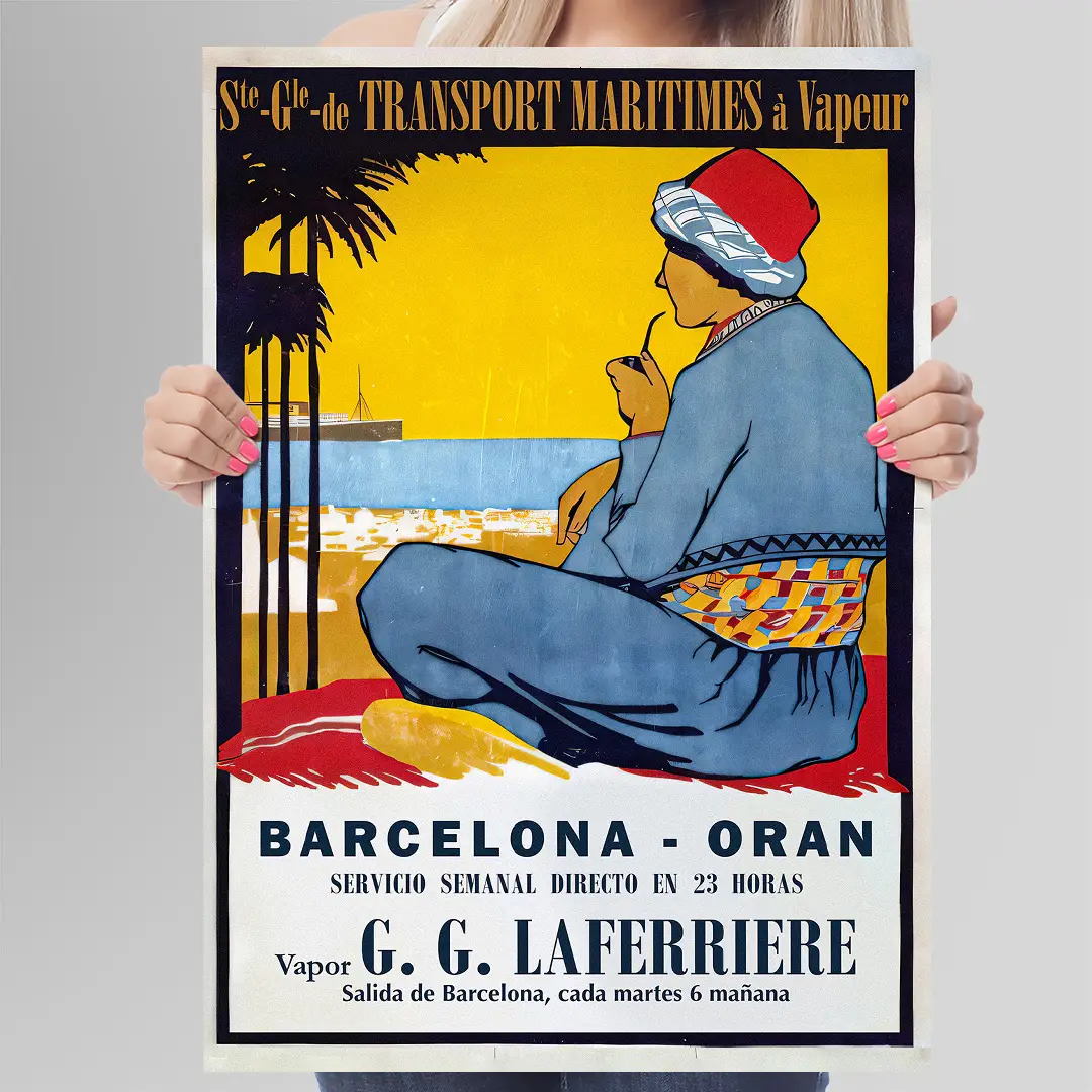 En résumé, cette affiche vintage Barcelona Oran combine patrimoine, design et mémoire méditerranéenne dans une composition forte et intemporelle.