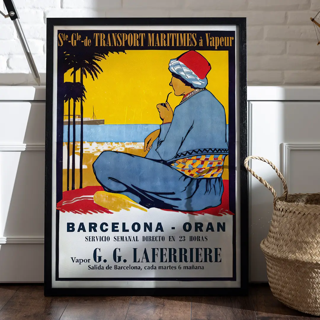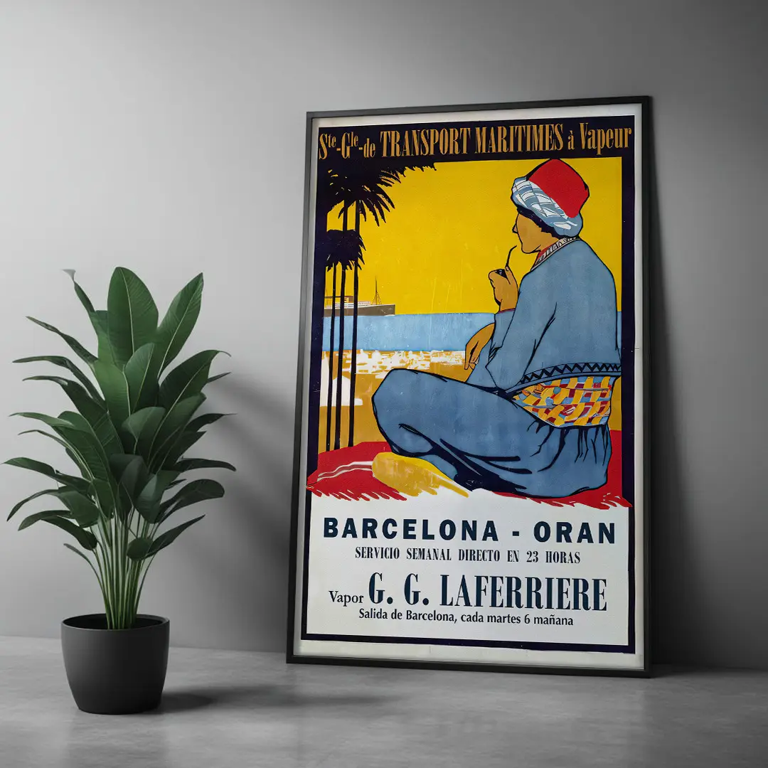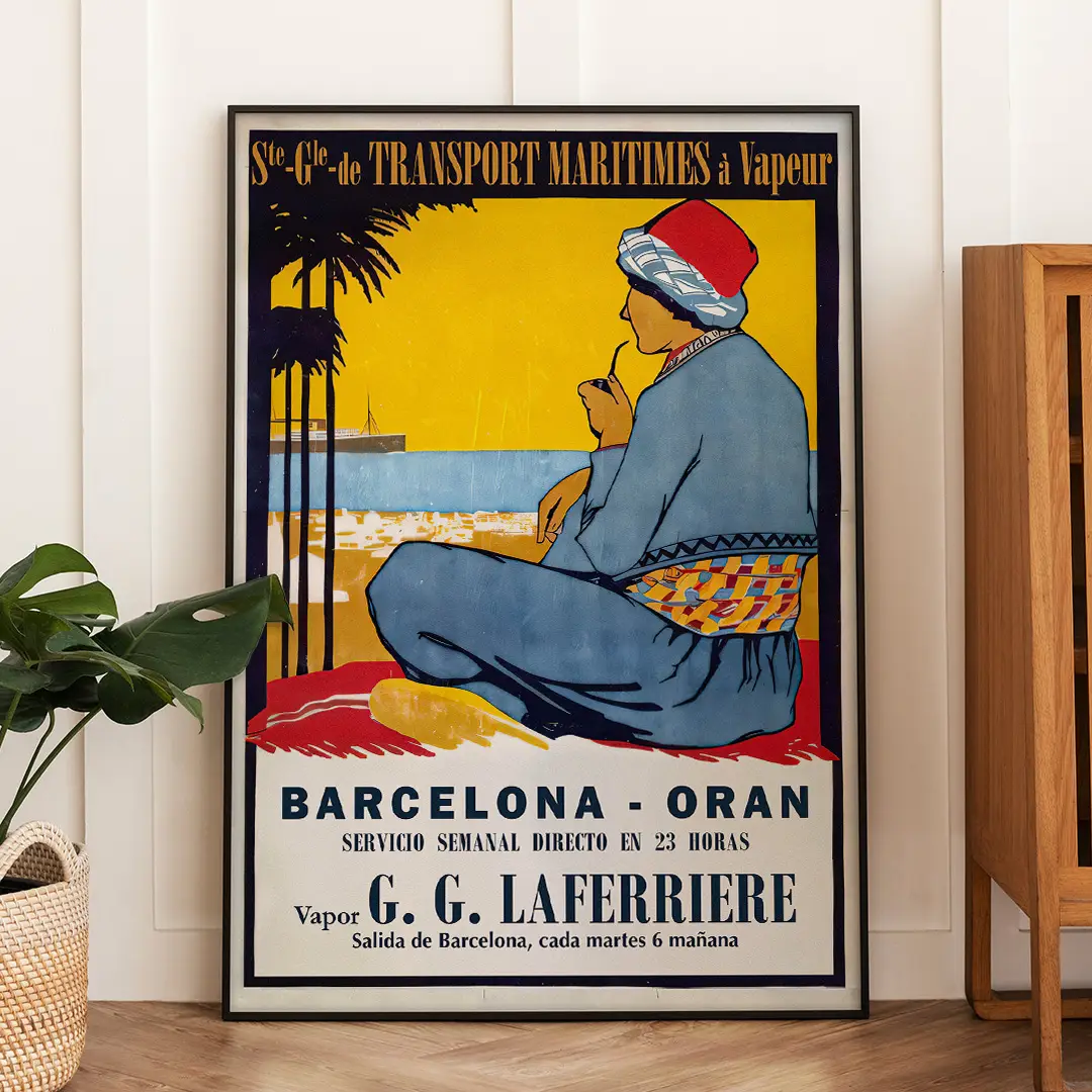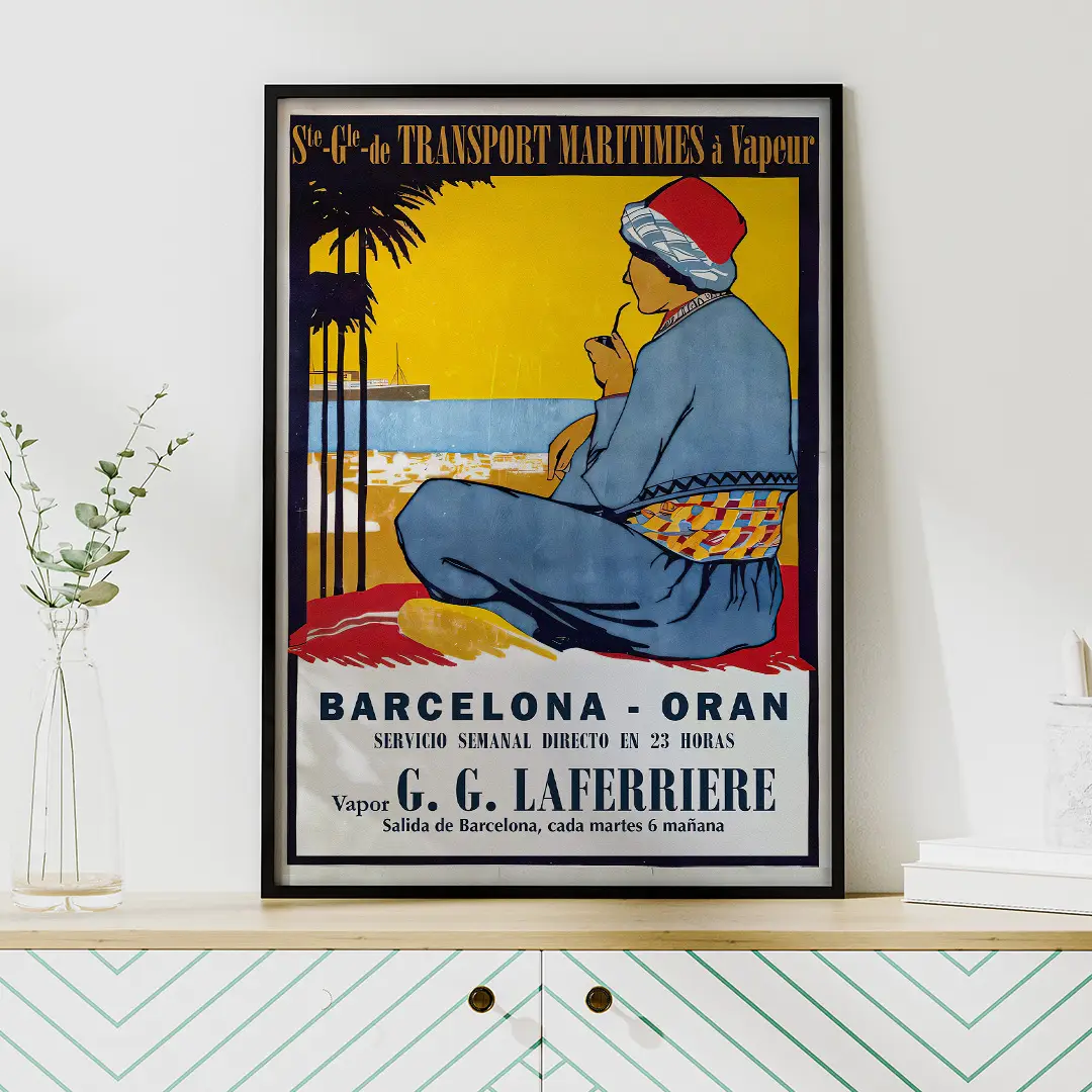 Aujourd’hui, l’affiche vintage Barcelona Oran séduit les amateurs d’art graphique et d’histoire maritime. Elle apporte une touche élégante et chaleureuse à un intérieur. Par exemple, elle s’intègre parfaitement dans un salon, un bureau ou un espace professionnel. En outre, elle constitue une pièce de collection idéale pour les passionnés d’affiches anciennes liées à l’Algérie.