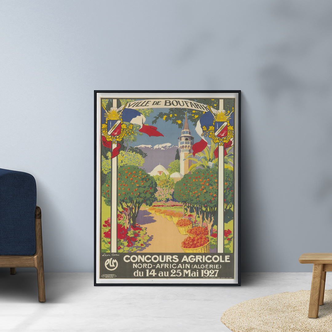 Découvrez une pièce rare de l’histoire visuelle algérienne : l’affiche « Boufarik – Concours agricole Nord-Africain », créée en 1927 par le peintre orientaliste Léon Carré et imprimée par Baconnier frères à Alger. Commandée pour le concours agricole organisé du 14 au 25 mai 1927, cette œuvre met en valeur la richesse agricole de la région de Boufarik, réputée pour ses agrumes.
