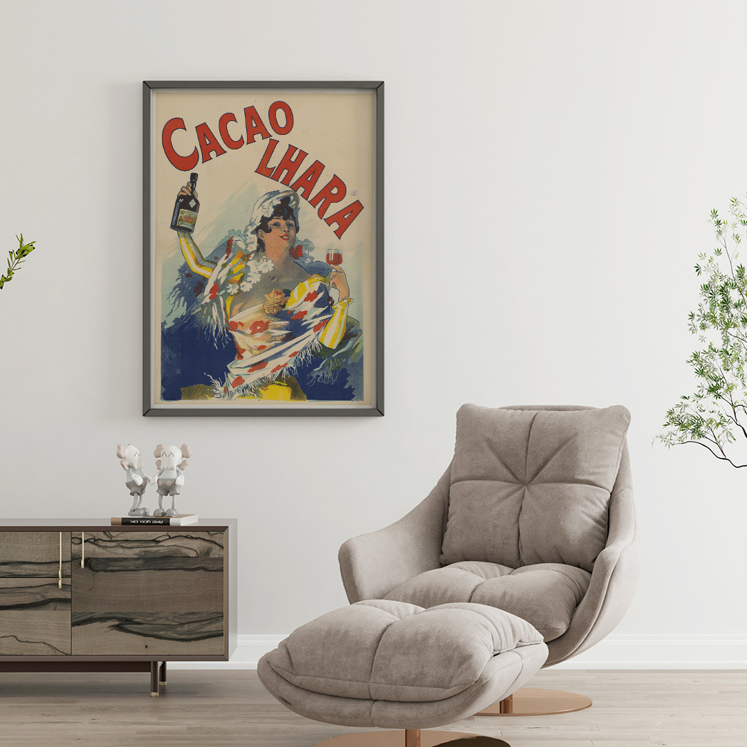 Affiche vintage Cacao Lhara – F. Mugnier (1889), illustration raffinée d’une femme tenant une bouteille et un verre, récompensée par la Médaille d’or à l’Exposition Universelle. Idéale pour une décoration rétro ou vintage. Disponible du A4 au A1, en cadre ou toile prête à accrocher.