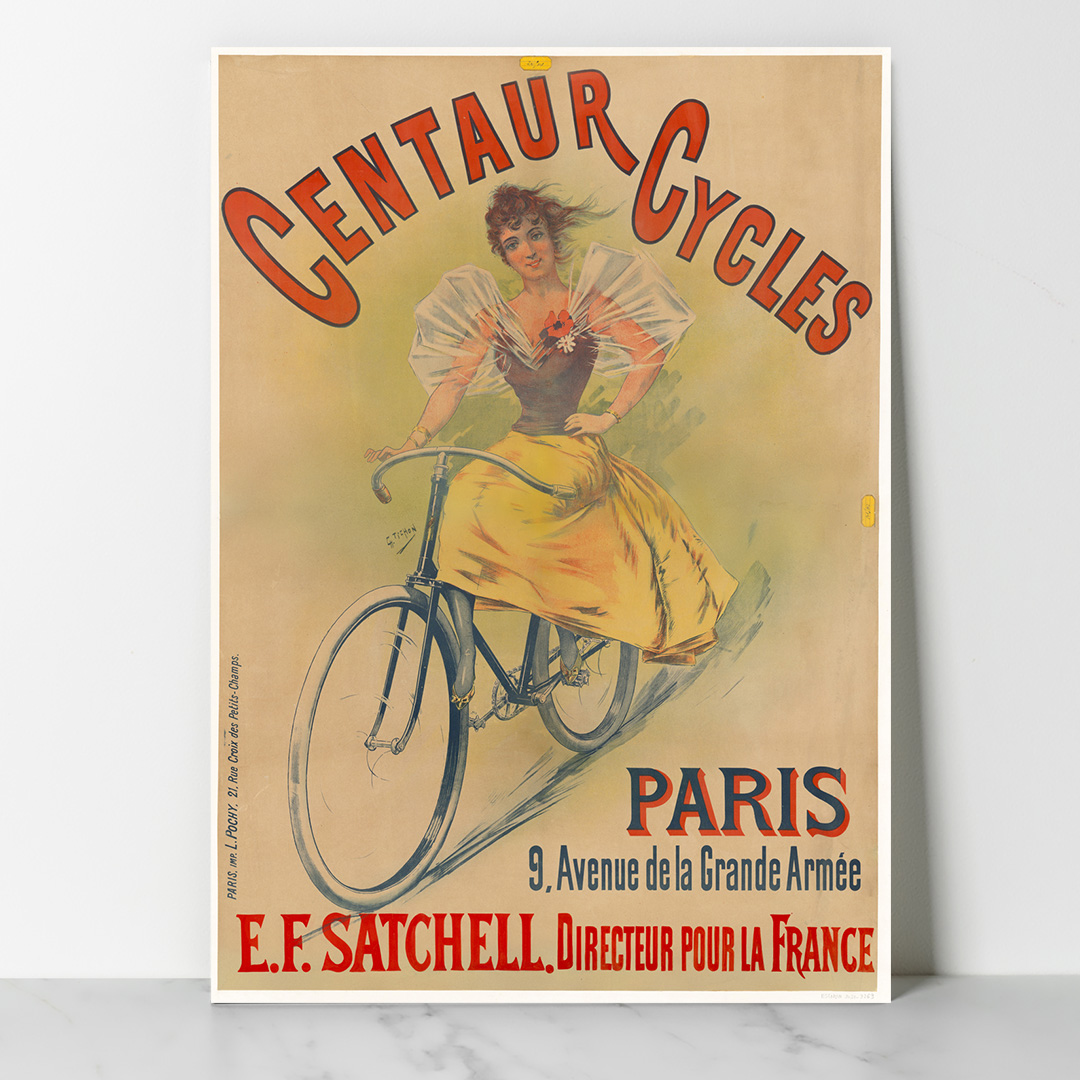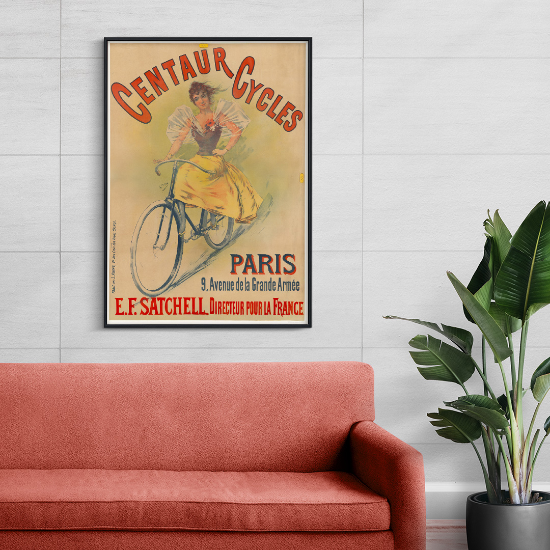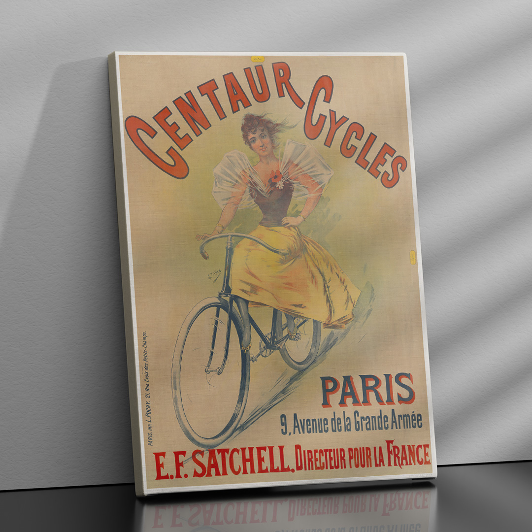 L’affiche vintage Centaur Cycles – Paris, 9, avenue de la Grande Armée (1898) est un exemple remarquable de la publicité du tournant du XXᵉ siècle. Elle met en scène une femme élégante sur un vélo, illustrant à la fois le style Art Nouveau et l’essor du cyclisme urbain à Paris. Le graphisme raffiné et les couleurs subtiles captent immédiatement le regard, transformant cette reproduction en un véritable objet décoratif et historique.