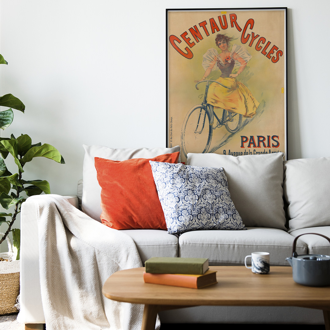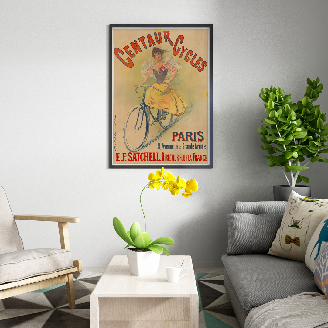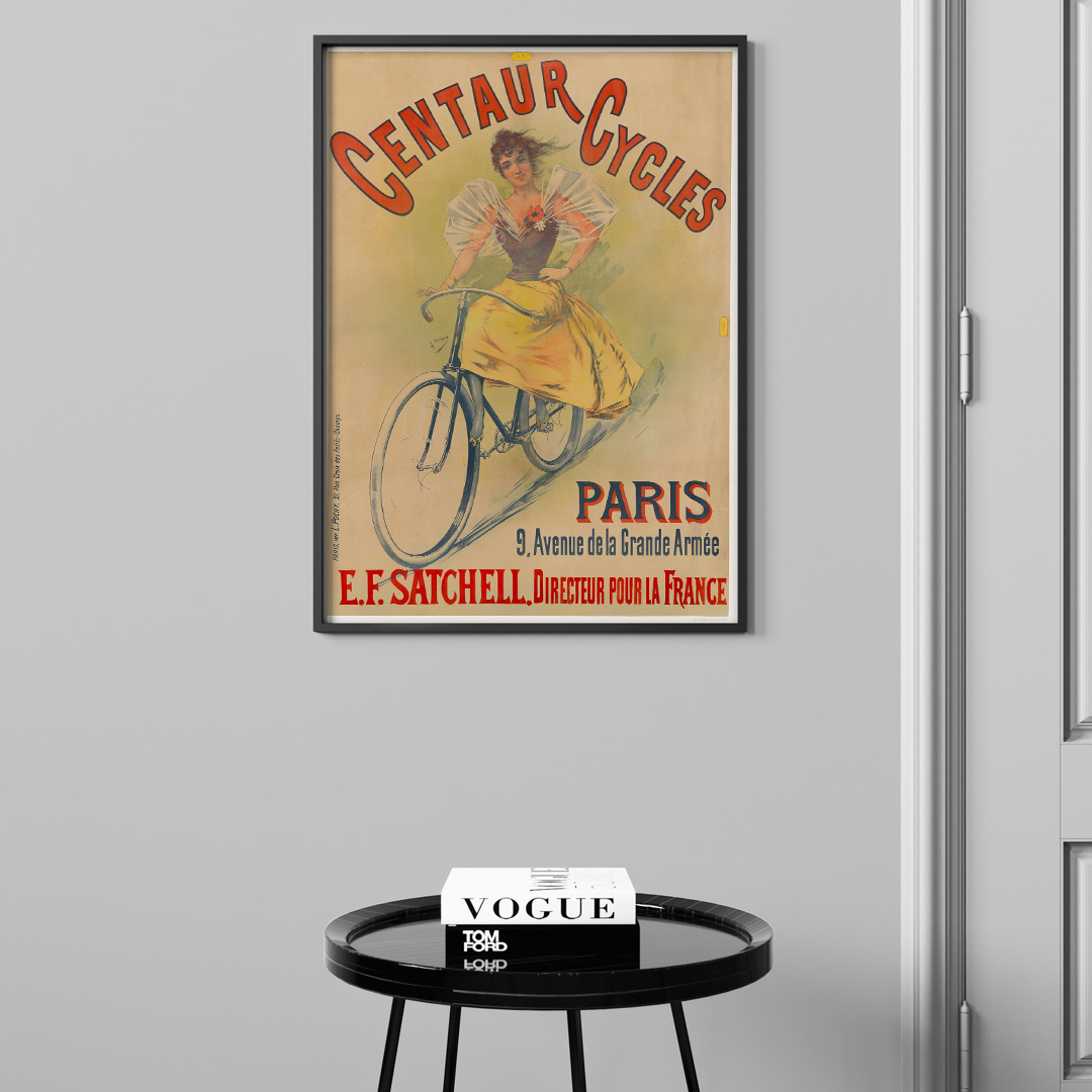 L’affiche vintage Centaur Cycles – Paris, 9, avenue de la Grande Armée (1898) est un exemple remarquable de la publicité du tournant du XXᵉ siècle. Elle met en scène une femme élégante sur un vélo, illustrant à la fois le style Art Nouveau et l’essor du cyclisme urbain à Paris. Le graphisme raffiné et les couleurs subtiles captent immédiatement le regard, transformant cette reproduction en un véritable objet décoratif et historique.