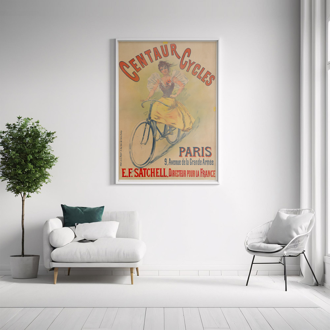 Affiche vintage Centaur Cycles – Paris, 9, avenue de la Grande Armée (1898), illustration élégante d’une femme à vélo par Charles Tichon. Idéale pour une décoration rétro ou un intérieur vintage. Disponible du A4 au A1, en cadre ou toile prête à accrocher.