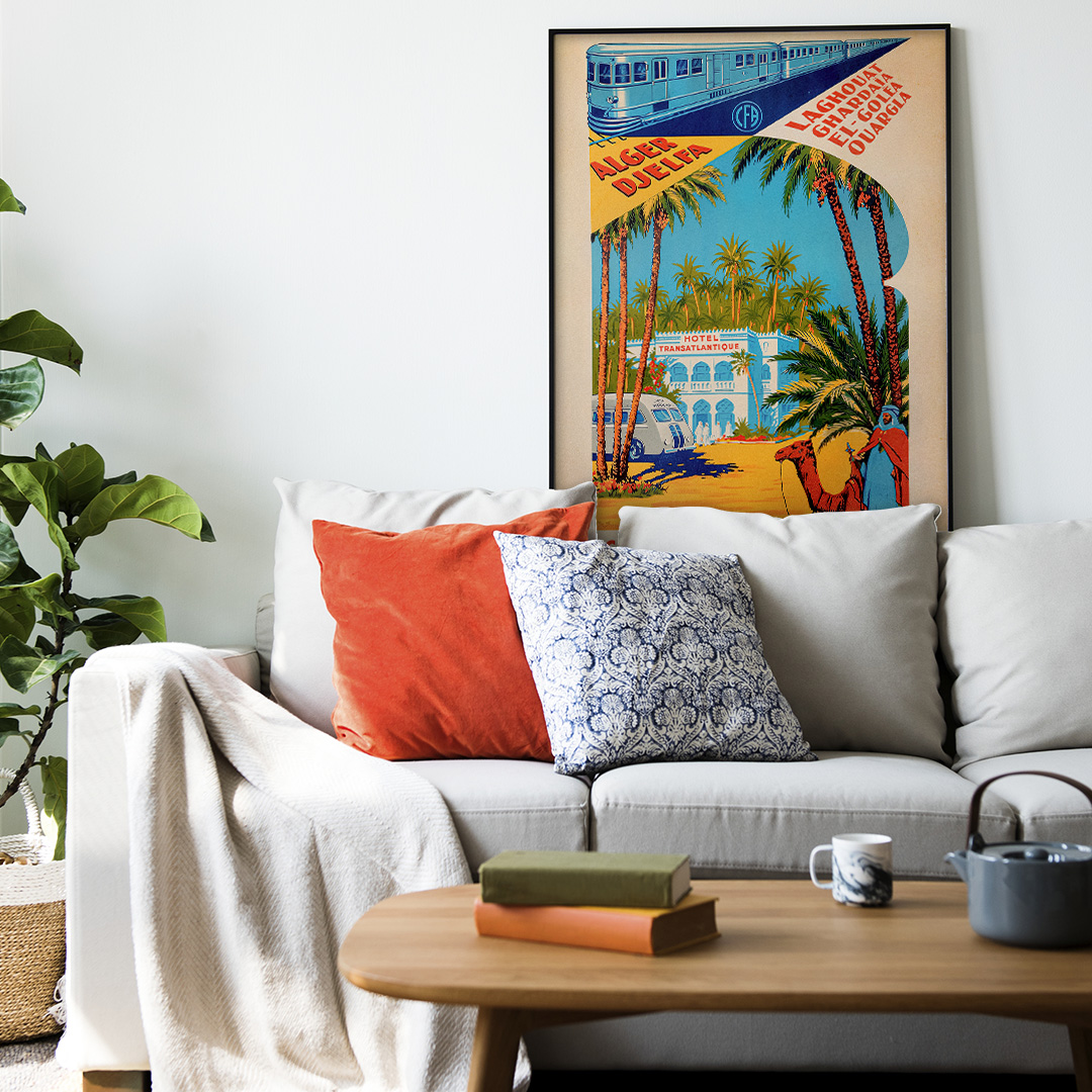 Cette affiche vintage des Chemins de fer Algériens évoque le voyage vers le Sahara. Une pièce décorative forte, chargée d’histoire et d’élégance.