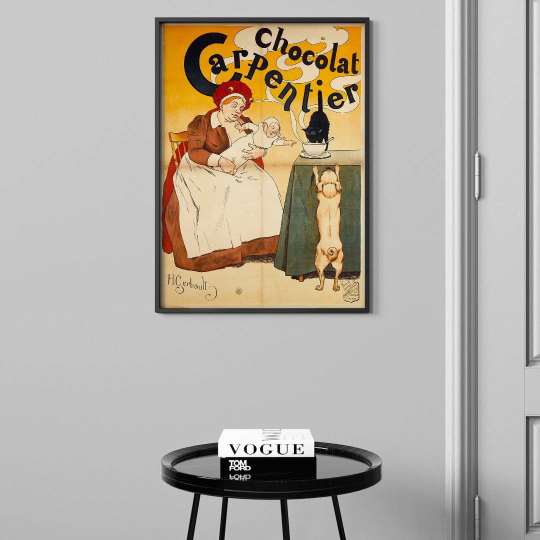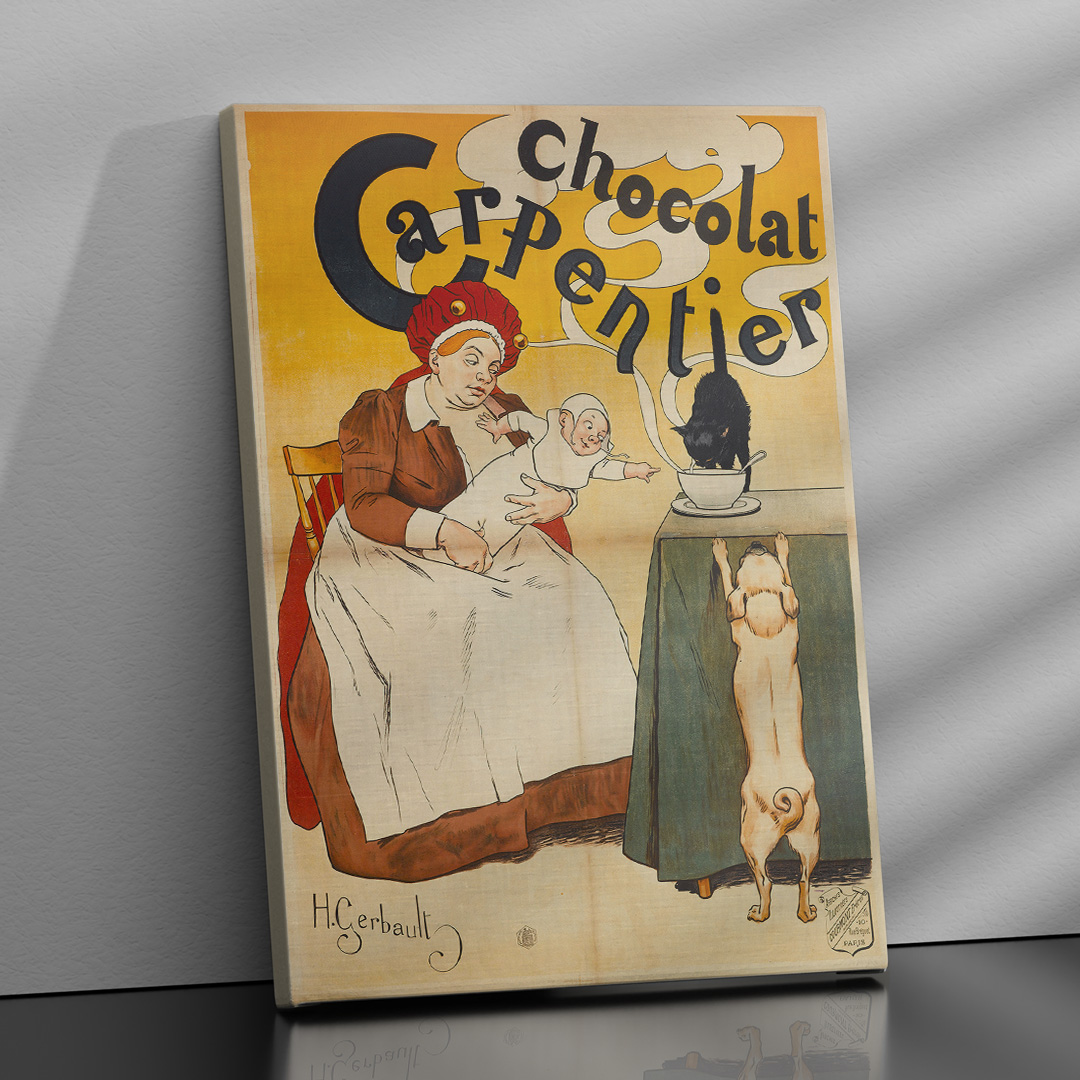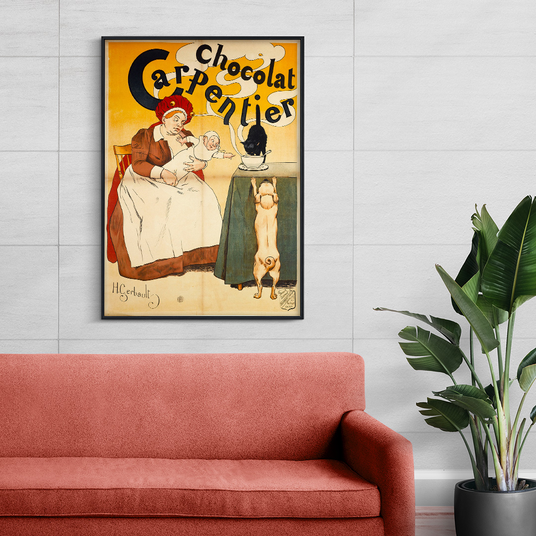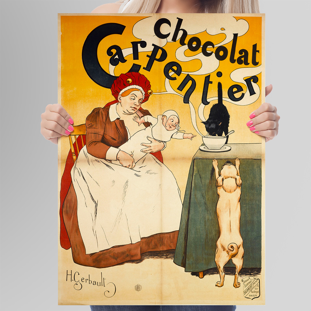 Affiche vintage Chocolat Carpentier – Henri Gerbault (1897). Illustration pleine de charme avec une femme, un bébé, un chat et un chien autour du chocolat. Disponible du A4 au A1, en cadre ou toile prête à accrocher. Idéale pour une décoration rétro ou vintage.