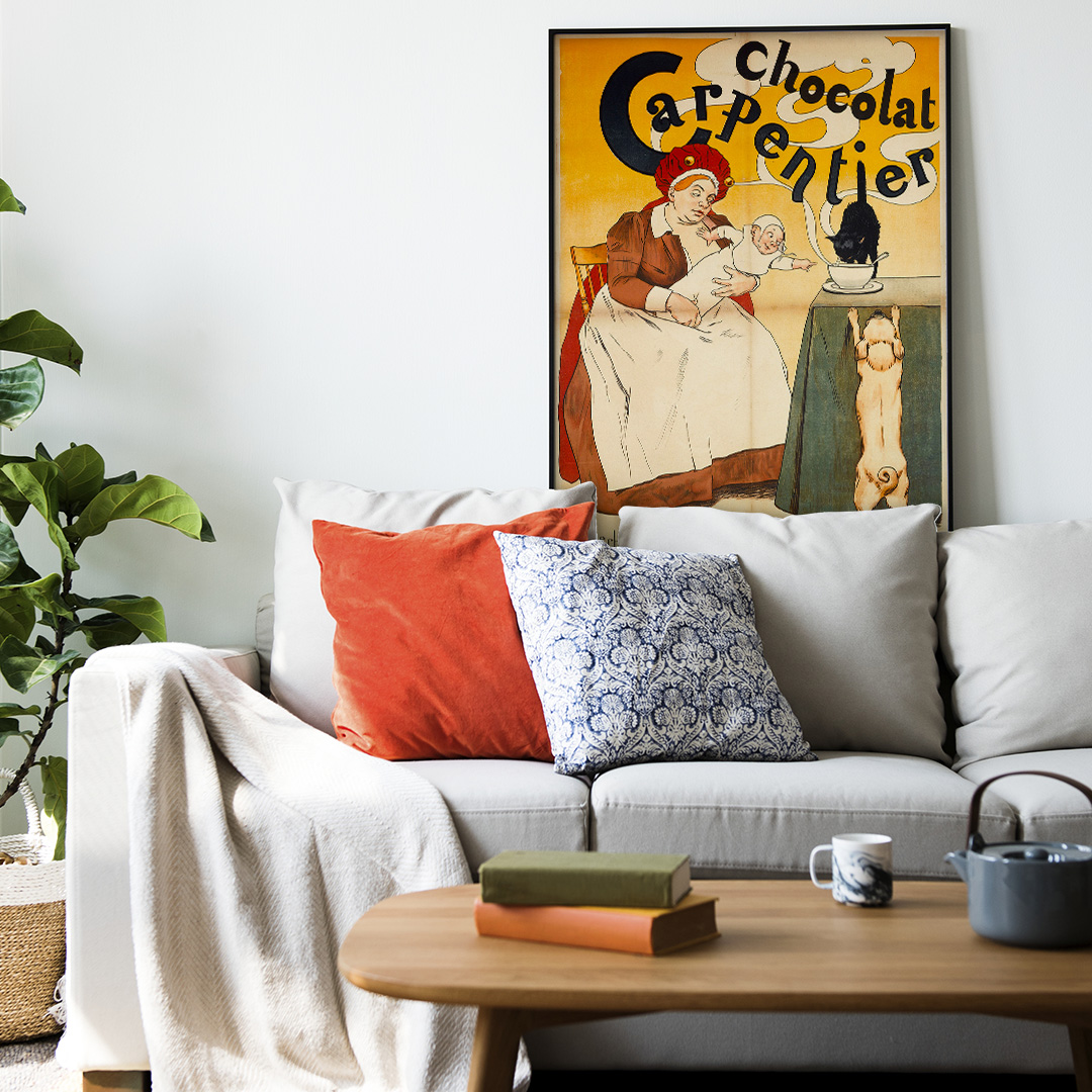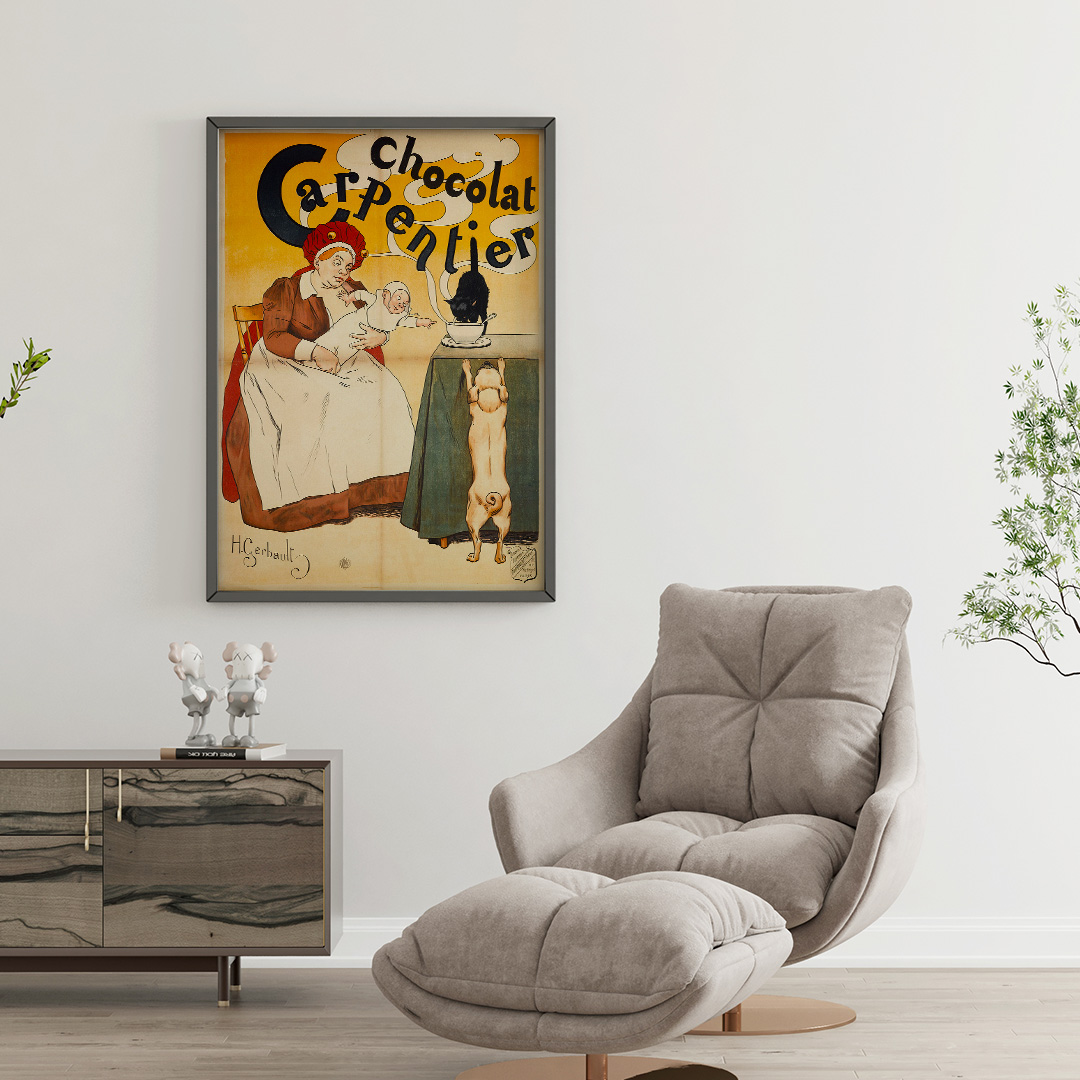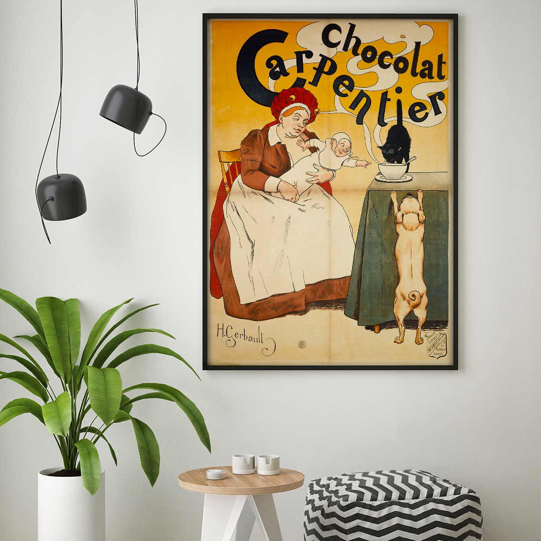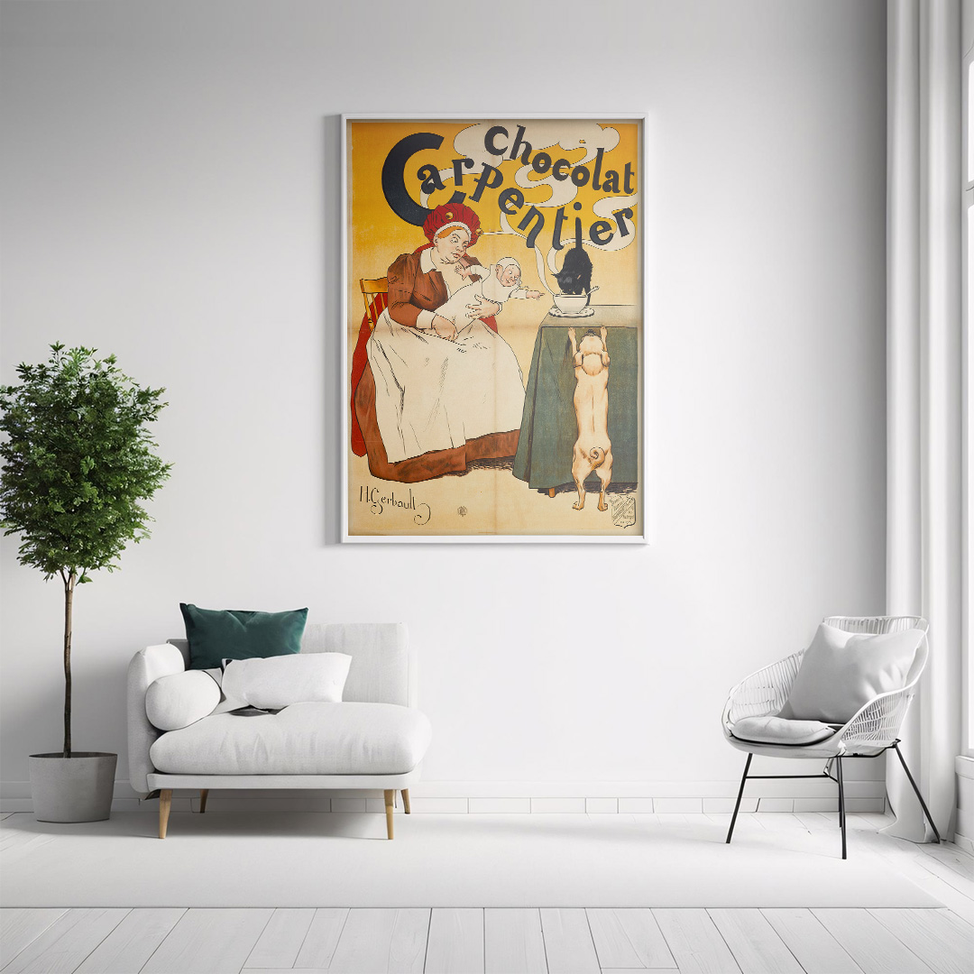 Affiche vintage Chocolat Carpentier – Henri Gerbault (1897). Illustration pleine de charme avec une femme, un bébé, un chat et un chien autour du chocolat. Disponible du A4 au A1, en cadre ou toile prête à accrocher. Idéale pour une décoration rétro ou vintage.