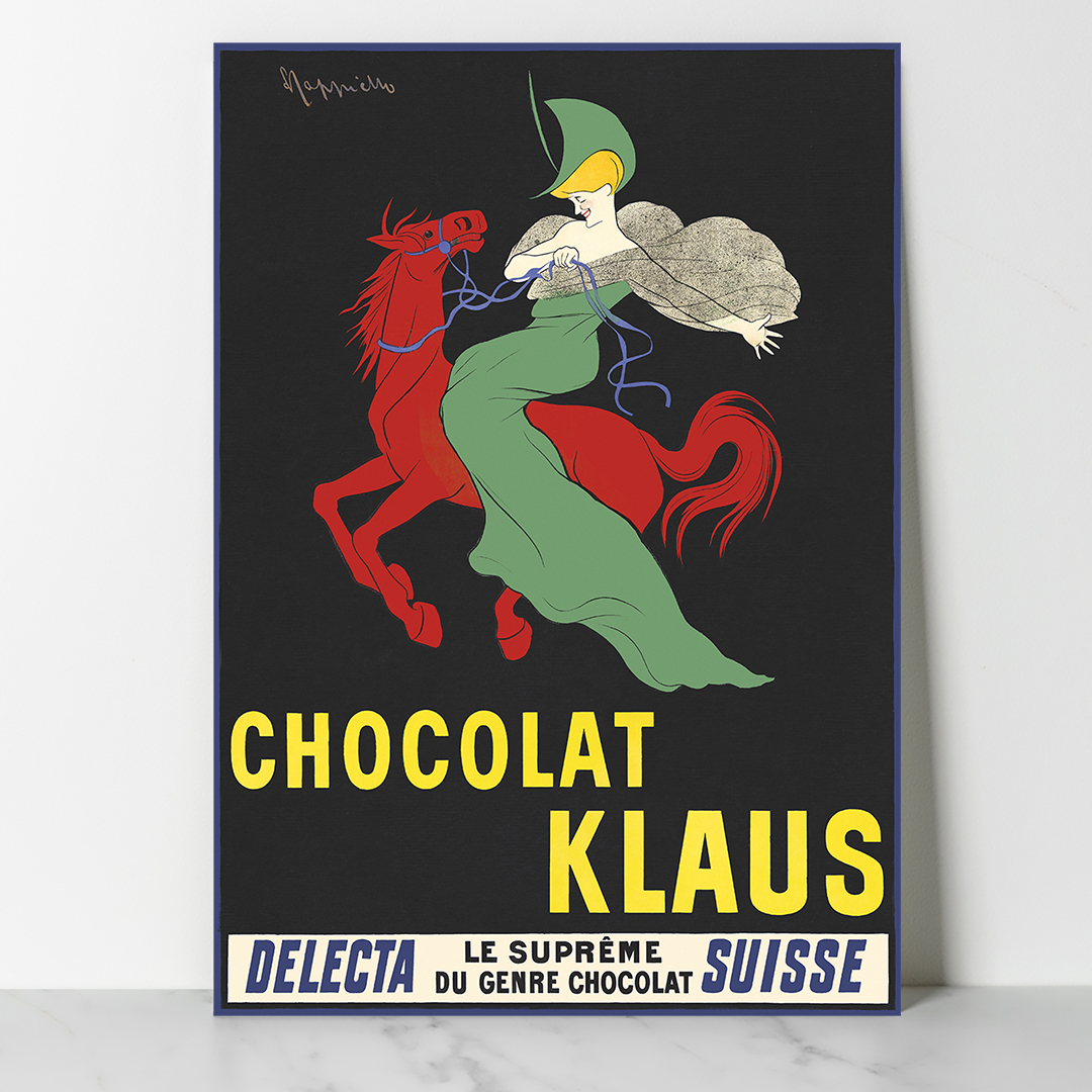 L’affiche « Chocolat Klaus », conçue en 1903 par Leonetto Cappiello, s’impose comme l’une des plus célèbres créations publicitaires du début du XXᵉ siècle. On y découvre un cheval rouge flamboyant qui bondit avec énergie sur un fond noir profond, accompagné du nom de la marque en lettres jaunes éclatantes. Cette composition audacieuse, à la fois simple et percutante, illustre parfaitement le style Cappiello, reconnu pour sa capacité à créer des images fortes, immédiatement mémorisables et accessibles à tous.