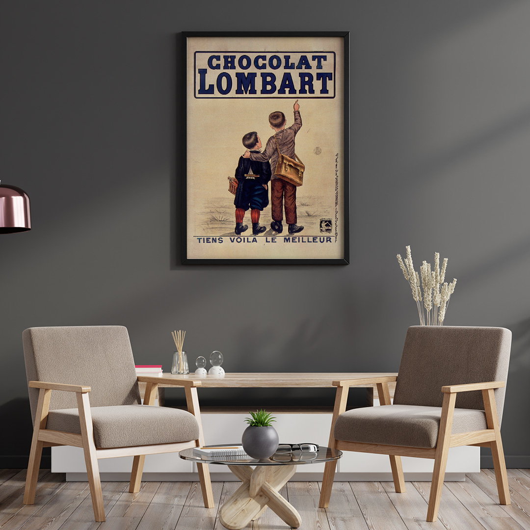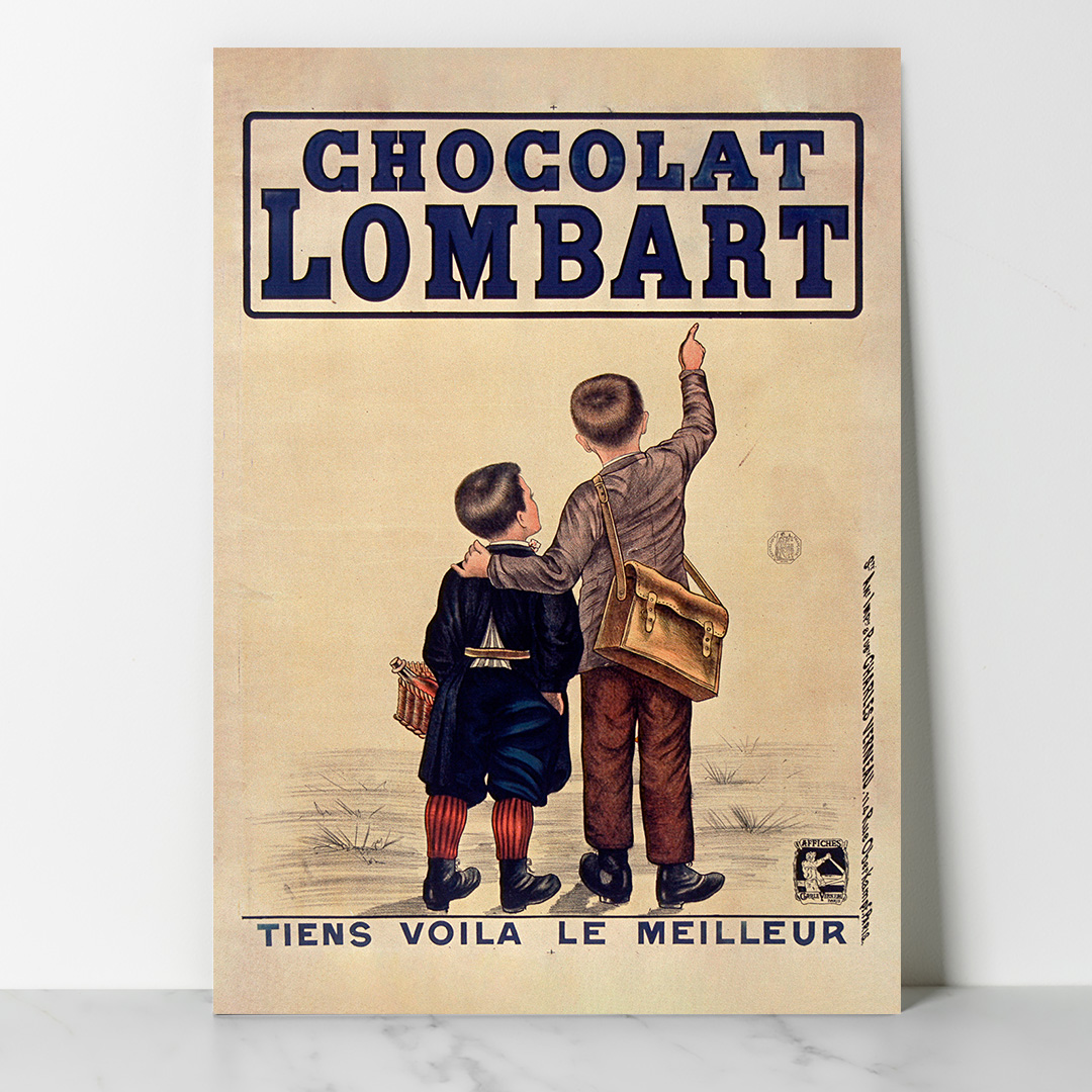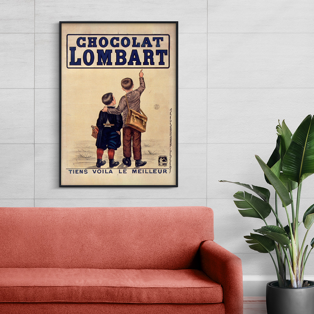 Affiche vintage Chocolat Lombart – Tiens voilà le meilleur (1890), illustration raffinée et colorée typique de la Belle Époque. Elle sublime tout intérieur rétro ou vintage. Disponible du A4 au A1, en cadre ou toile prête à accrocher.