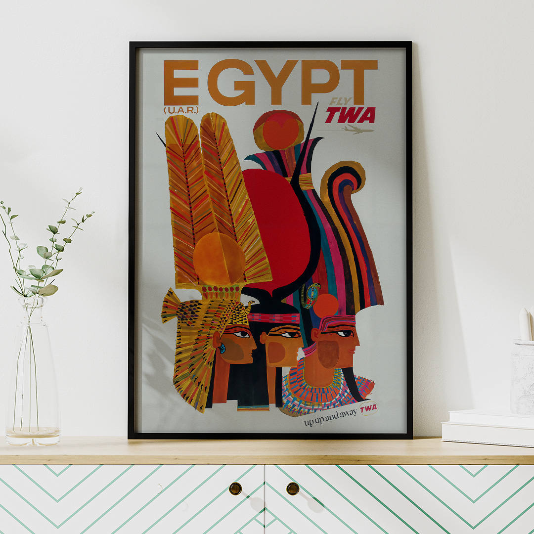L’affiche vintage Fly TWA Egypt met en scène des profils inspirés de l’art égyptien antique, réinterprétés dans un style graphique mid-century reconnaissable. Les formes géométriques, les couleurs chaudes et le slogan emblématique « Up up and away TWA » évoquent l’âge d’or du transport aérien international.