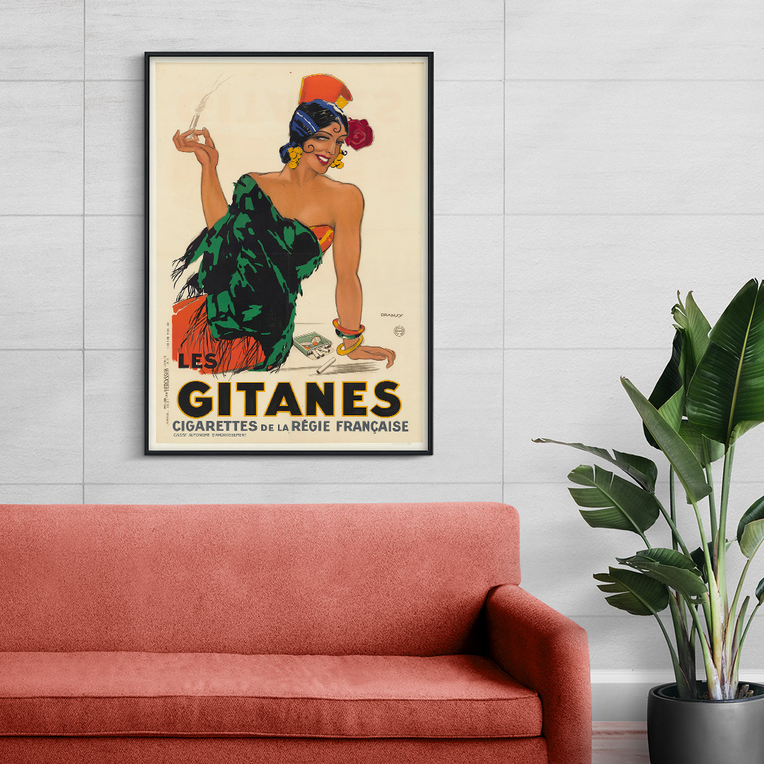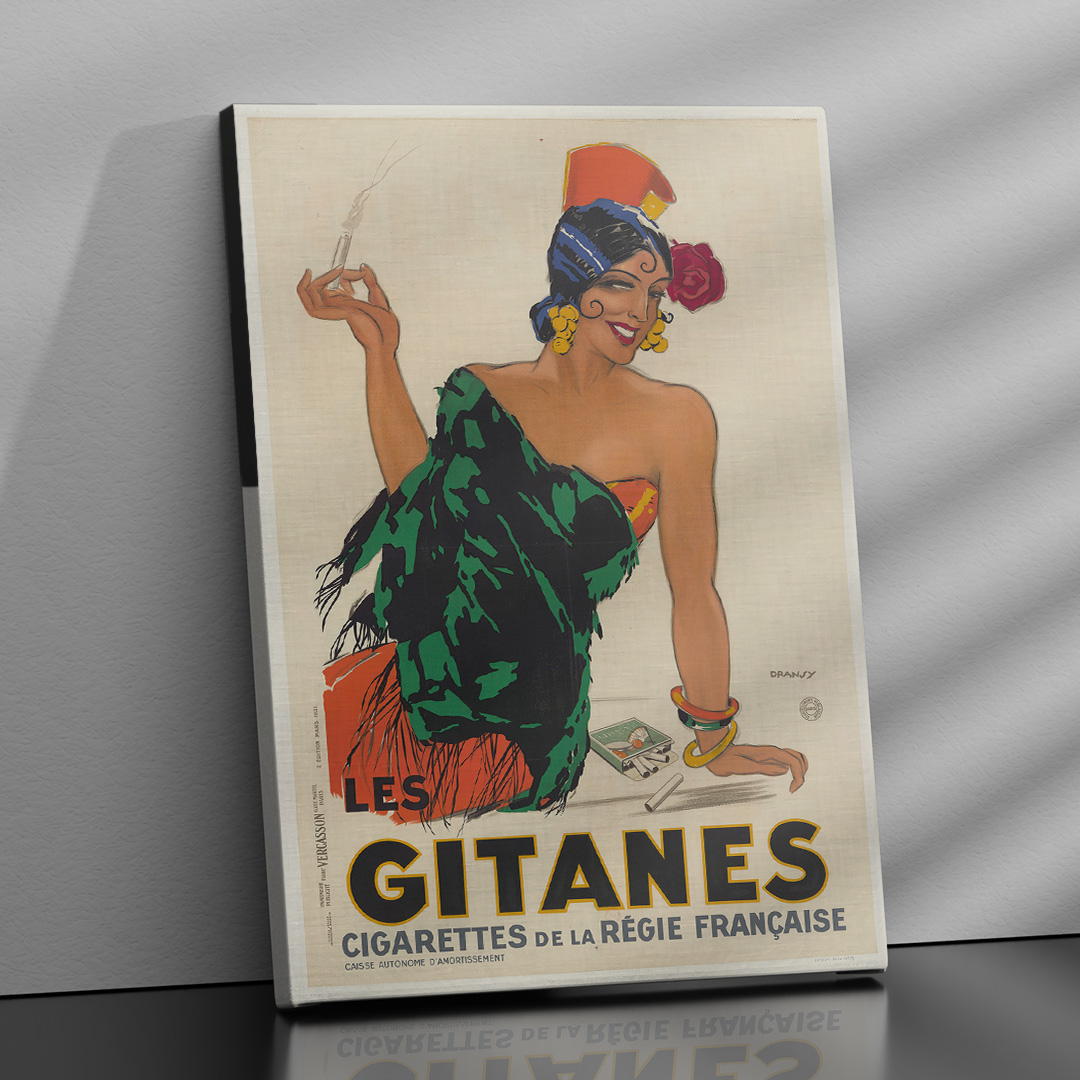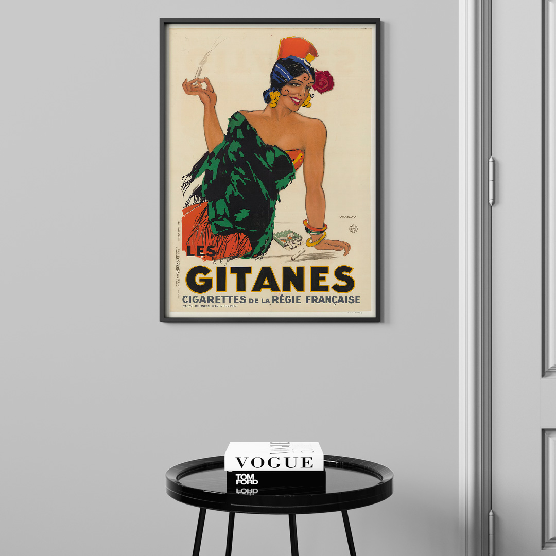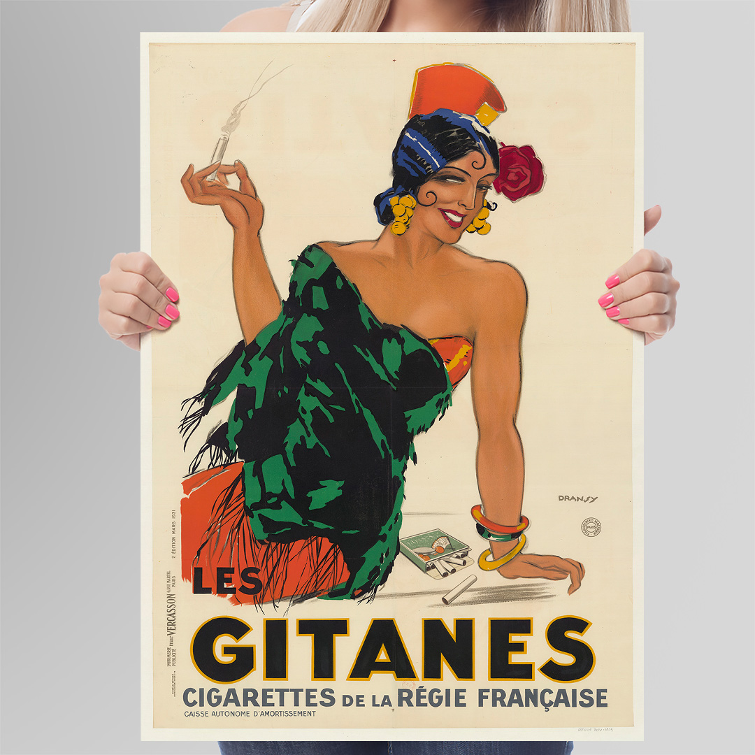 Affiche vintage Gitanes signée Dransy, un classique Art déco français des années 1920. Une danseuse gitane élégante, un fond bleu iconique et un charme intemporel. Idéale pour une déco au style rétro et raffiné.
