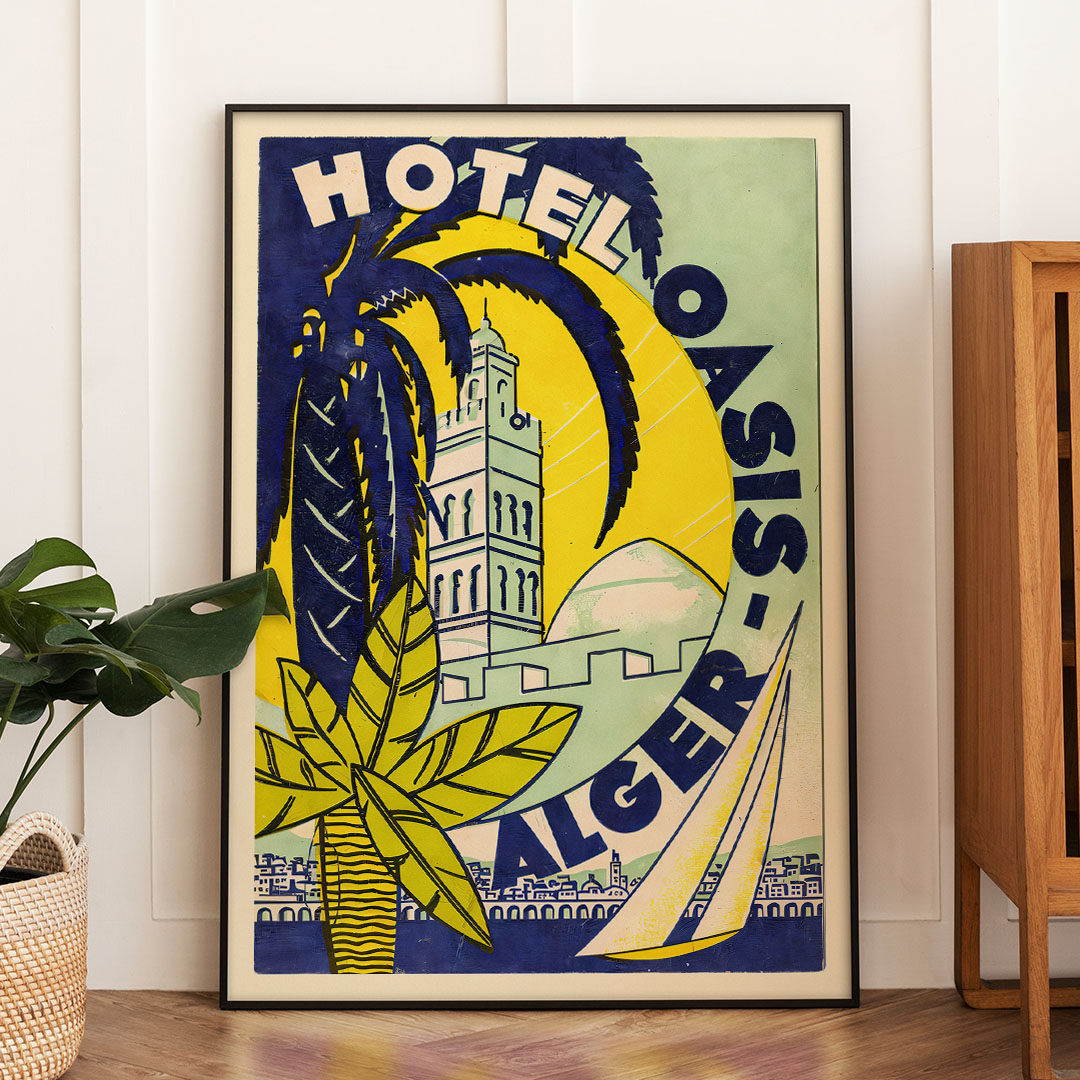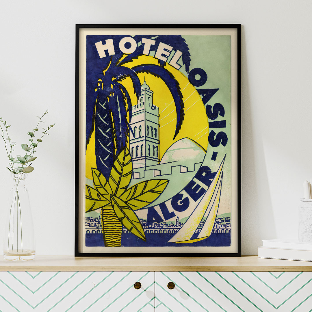 Cette affiche vintage d’Alger Hôtel Oasis est une excellente idée cadeau pour les amateurs de décoration rétro, d’histoire algérienne ou de graphisme ancien.