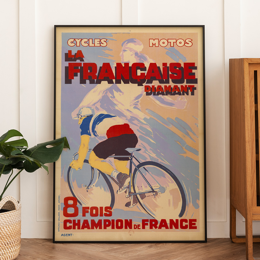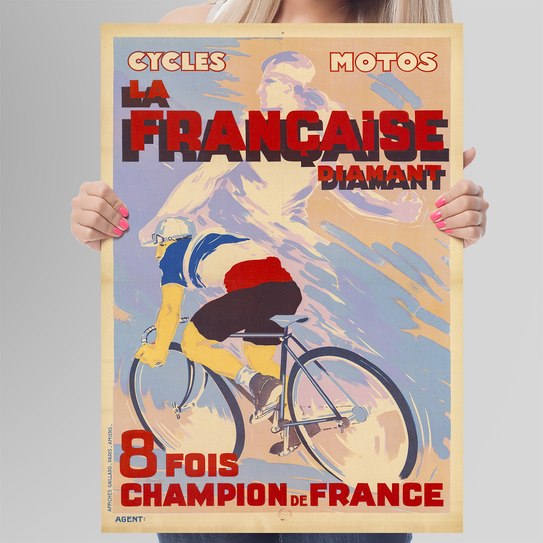 Affiche vintage La Française Diamant, 8 fois championne de France. Pièce décorative et historique pour les amateurs de cyclisme et de style rétro.