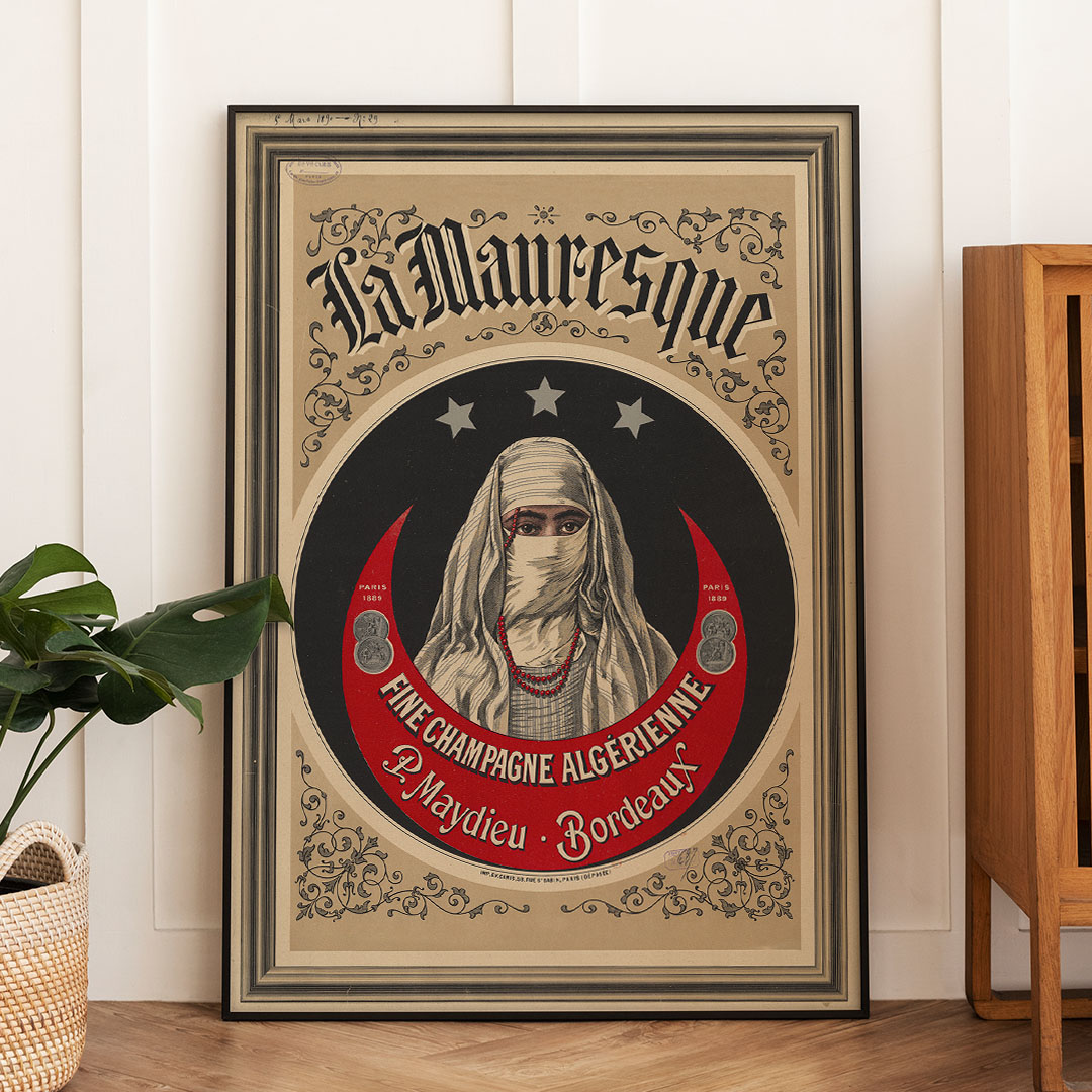 Cette affiche vintage Algérie La Mauresque – Fine champagne algérienne est une reproduction d’une affiche publicitaire, illustrée de la fin du XIXᵉ siècle. Elle fait partie des grandes lithographies publicitaires qui ont marqué l’histoire du graphisme et de la publicité coloniale.