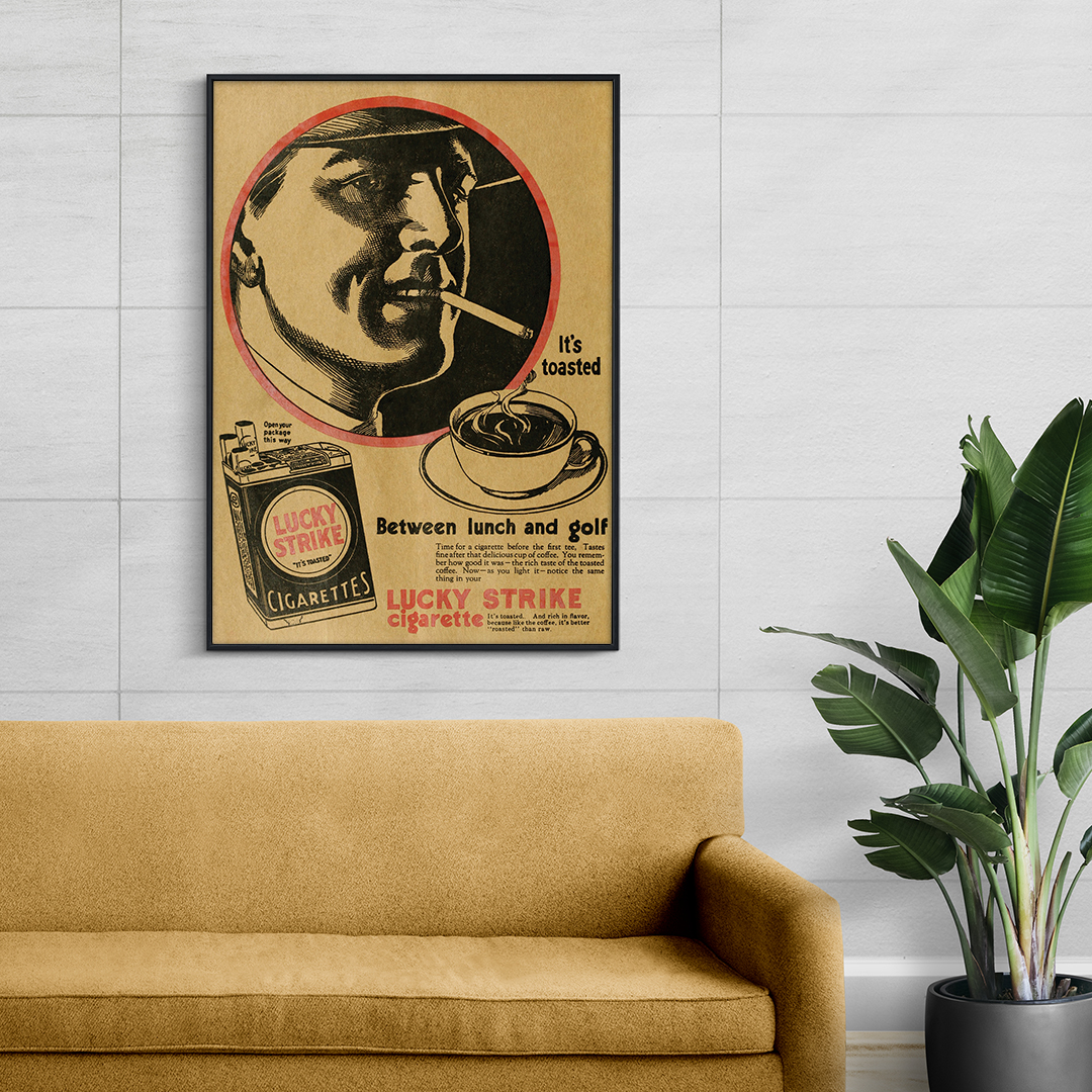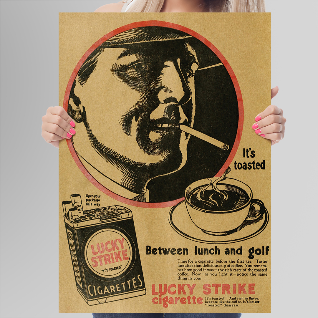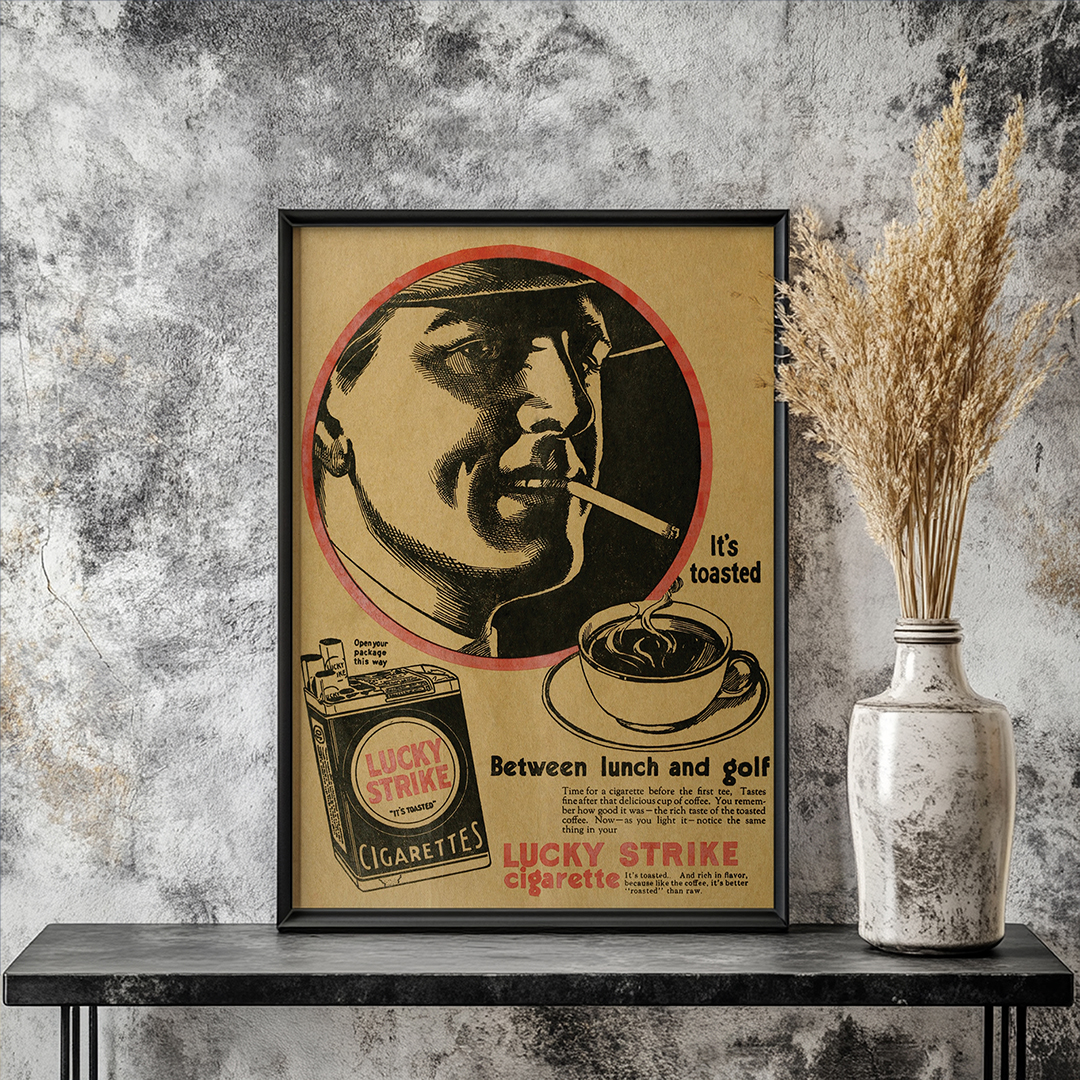 Au centre, un portrait masculin en cercle rouge attire le regard. L’homme, cigarette aux lèvres, incarne la confiance et le style de l’époque. À ses côtés, une tasse de café fumant et un paquet de Lucky Strike complètent la composition. Le slogan “It’s toasted” met en avant le procédé de fabrication unique qui différenciait la marque. La phrase “Between Lunch and Golf” évoque quant à elle un moment de détente, associant la cigarette à l’art de vivre raffiné.