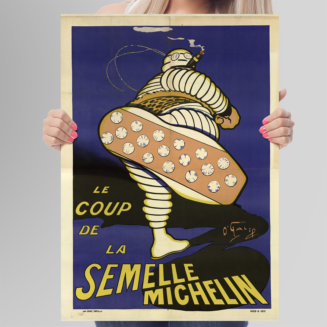L’affiche vintage Michelin Le coup de la semelle Michelin (1912) illustre avec force l’ingéniosité graphique d’O’Galop et le génie publicitaire du début du XXᵉ siècle. Dès le premier regard, cette composition iconique capte l’attention par son humour visuel et sa mise en scène percutante de Bibendum, figure emblématique de la marque.