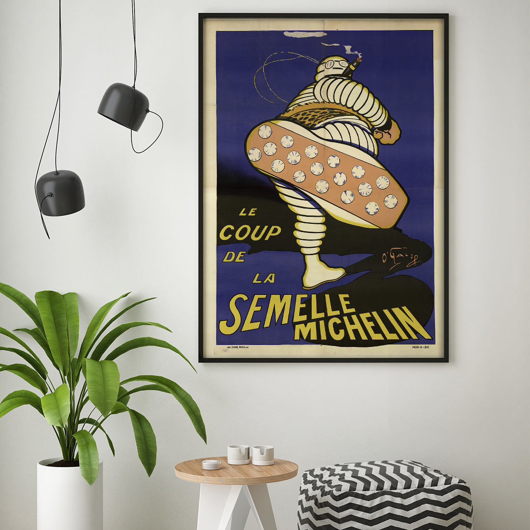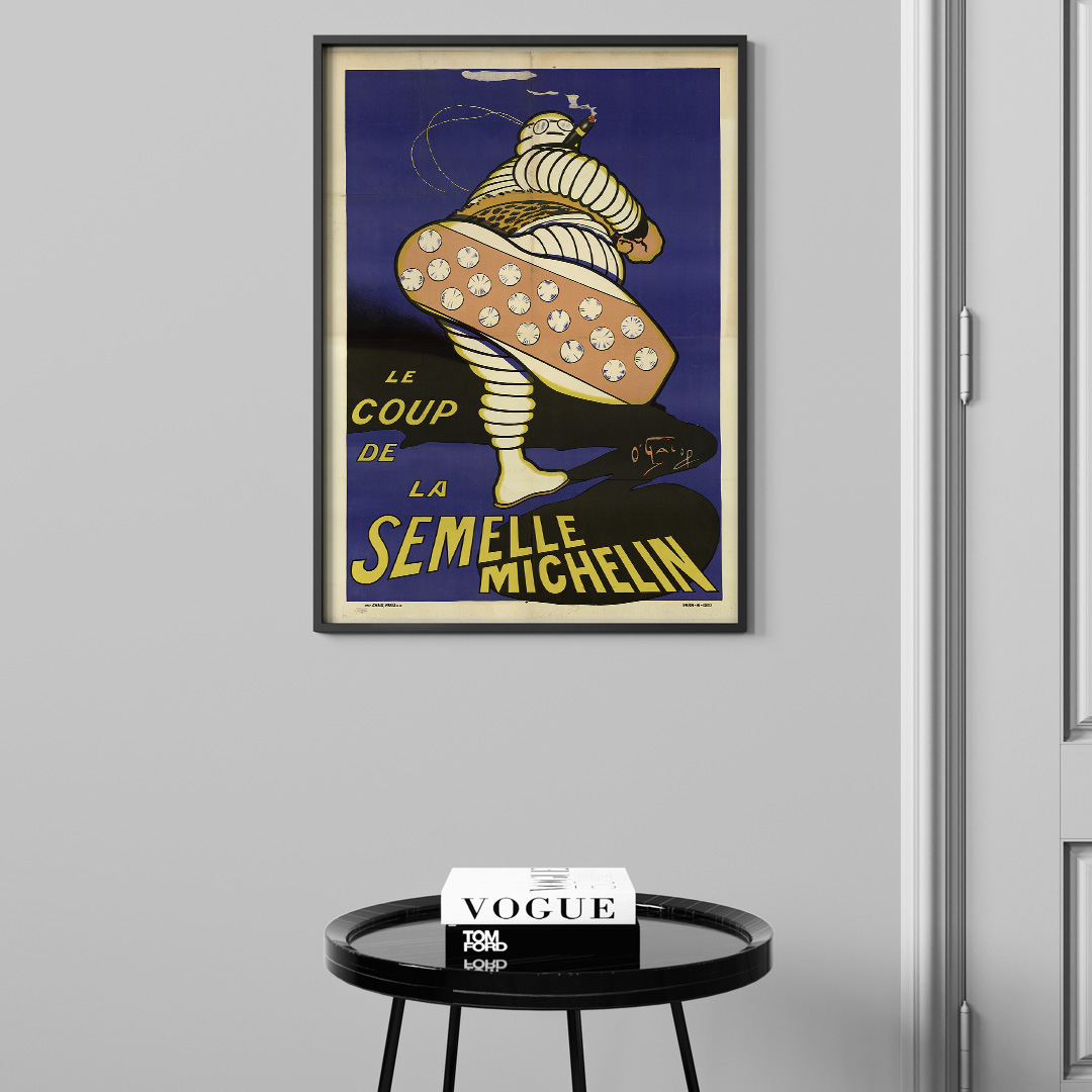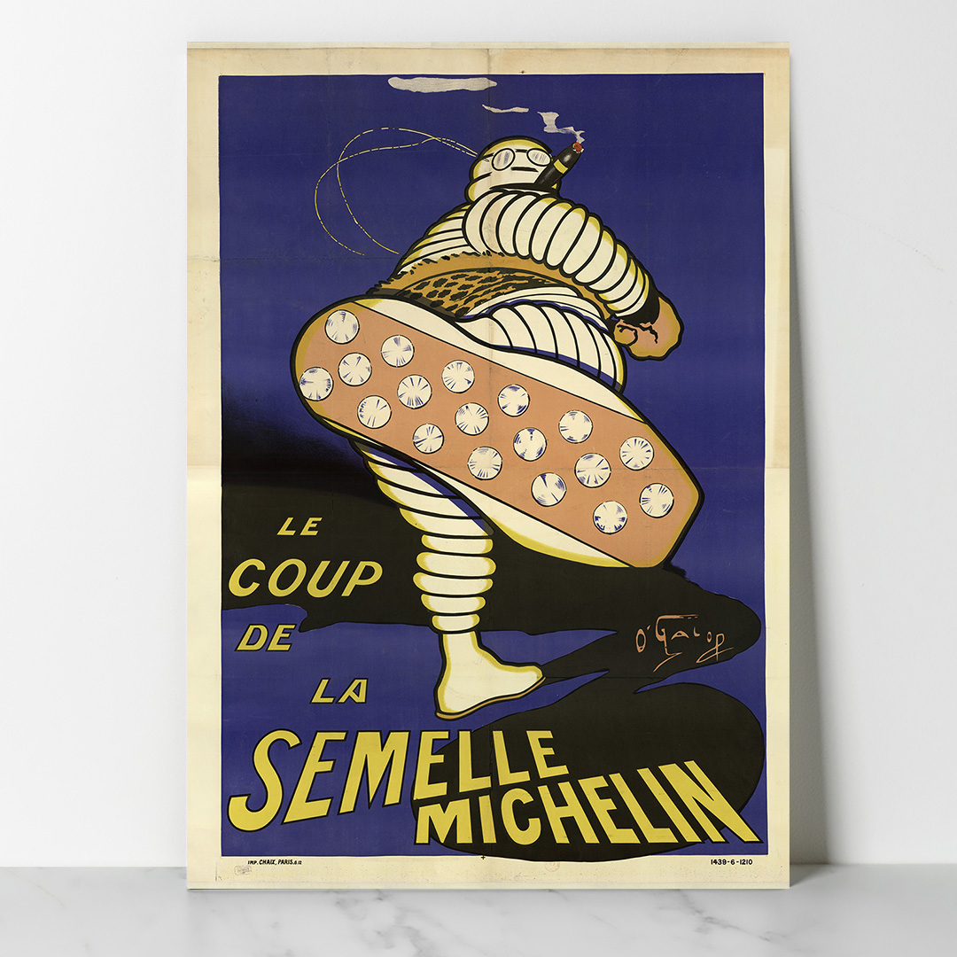 Affiche vintage Michelin Le coup de la semelle (1912), illustration emblématique d’O’Galop mettant en scène Bibendum avec humour et puissance graphique. Elle évoque l’élégance publicitaire d’époque et renforce le cachet d’une décoration rétro authentique. Disponible du A4 au A1, avec cadre en verre ou toile montée sur châssis prête à accrocher.