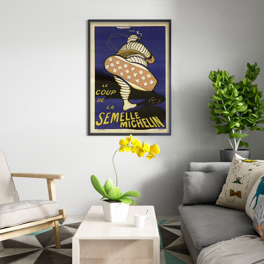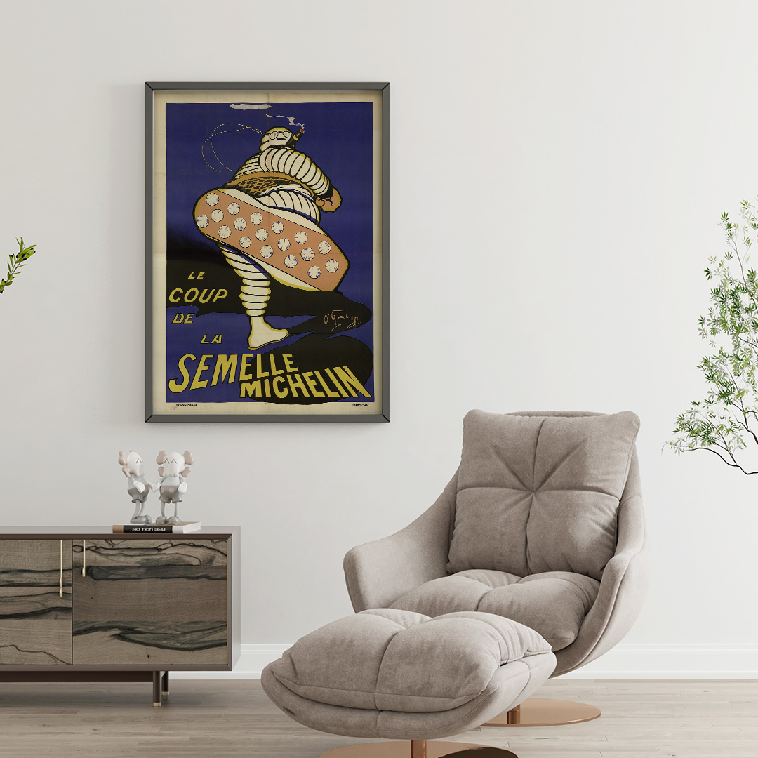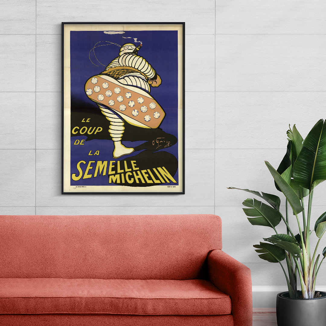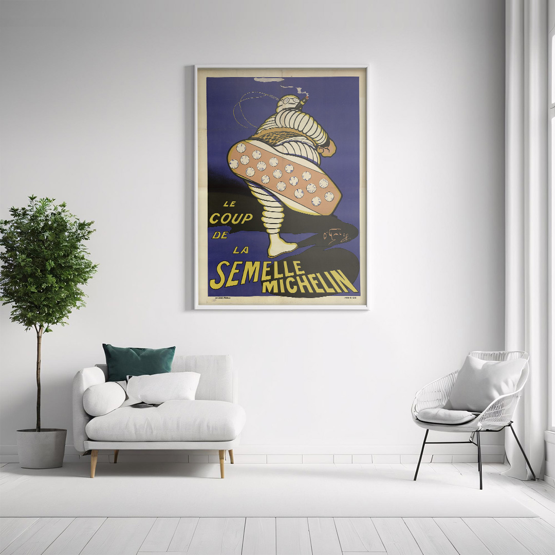 Affiche vintage Michelin Le coup de la semelle (1912), illustration emblématique d’O’Galop mettant en scène Bibendum avec humour et puissance graphique. Elle évoque l’élégance publicitaire d’époque et renforce le cachet d’une décoration rétro authentique. Disponible du A4 au A1, avec cadre en verre ou toile montée sur châssis prête à accrocher.