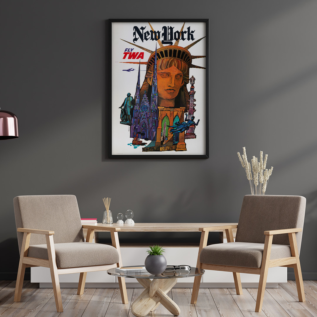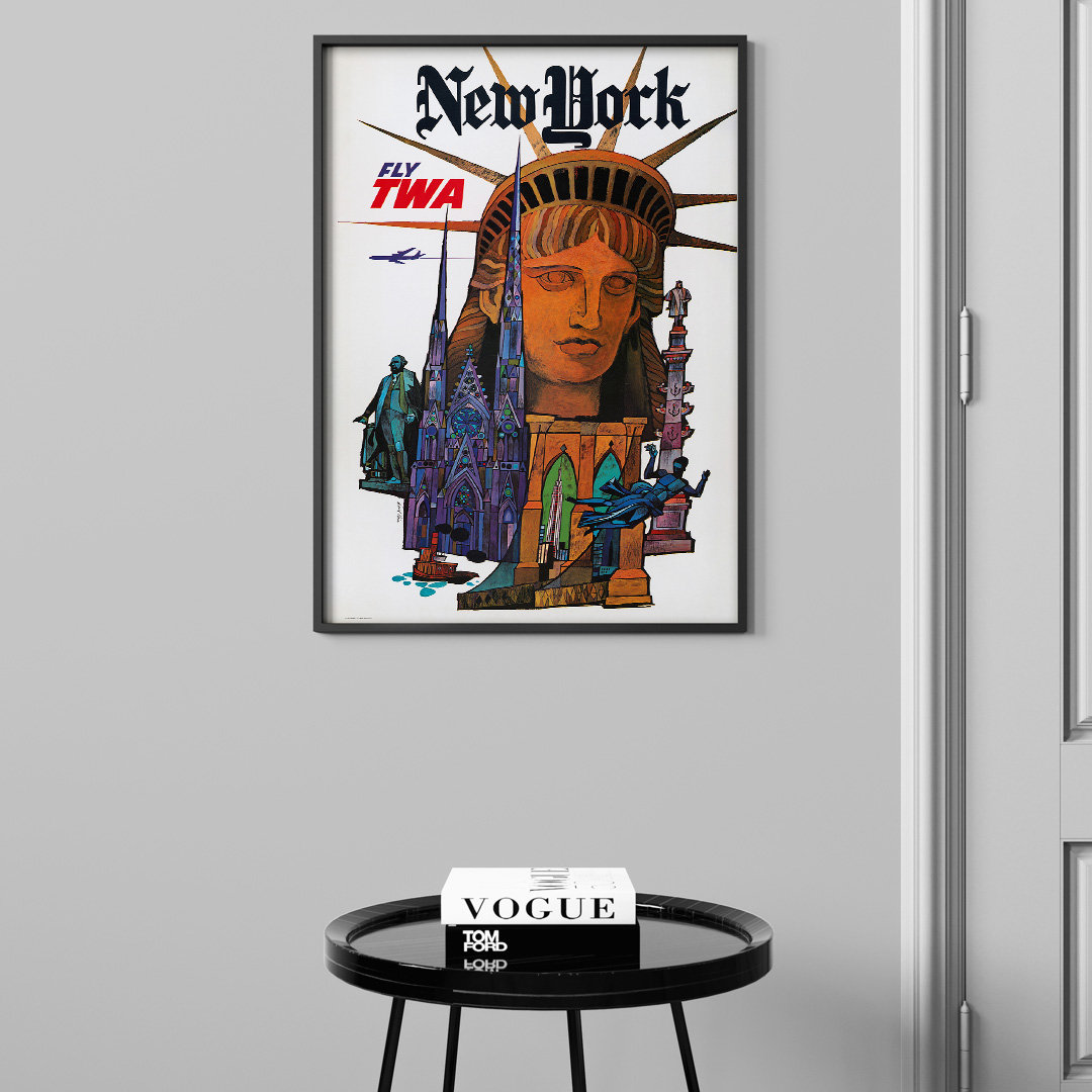 Affiche vintage New York Fly TWA, un classique de l’aviation américaine. Inspirée par la ville de New York et la prestigieuse compagnie TWA, cette affiche capture tout l’esprit du voyage et du rêve américain.