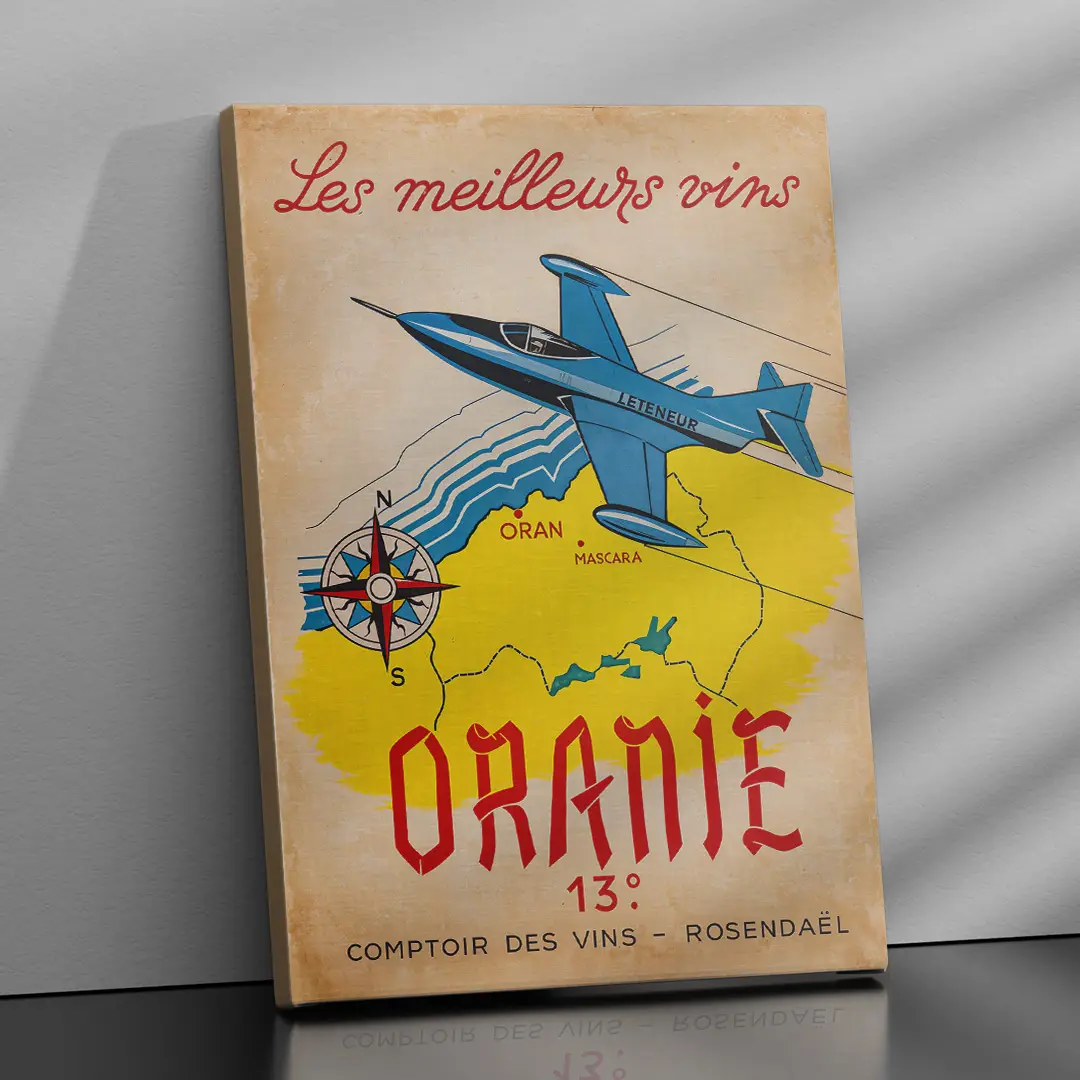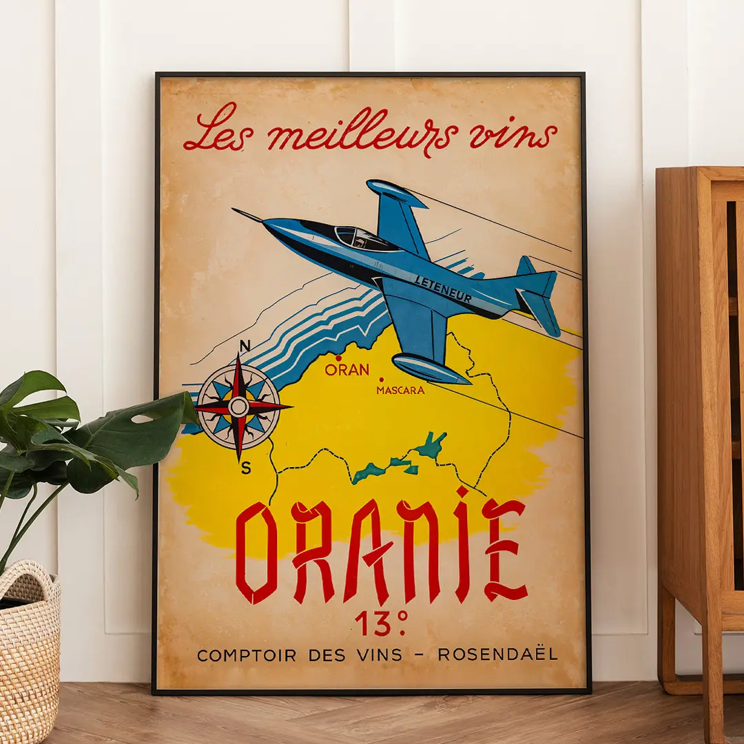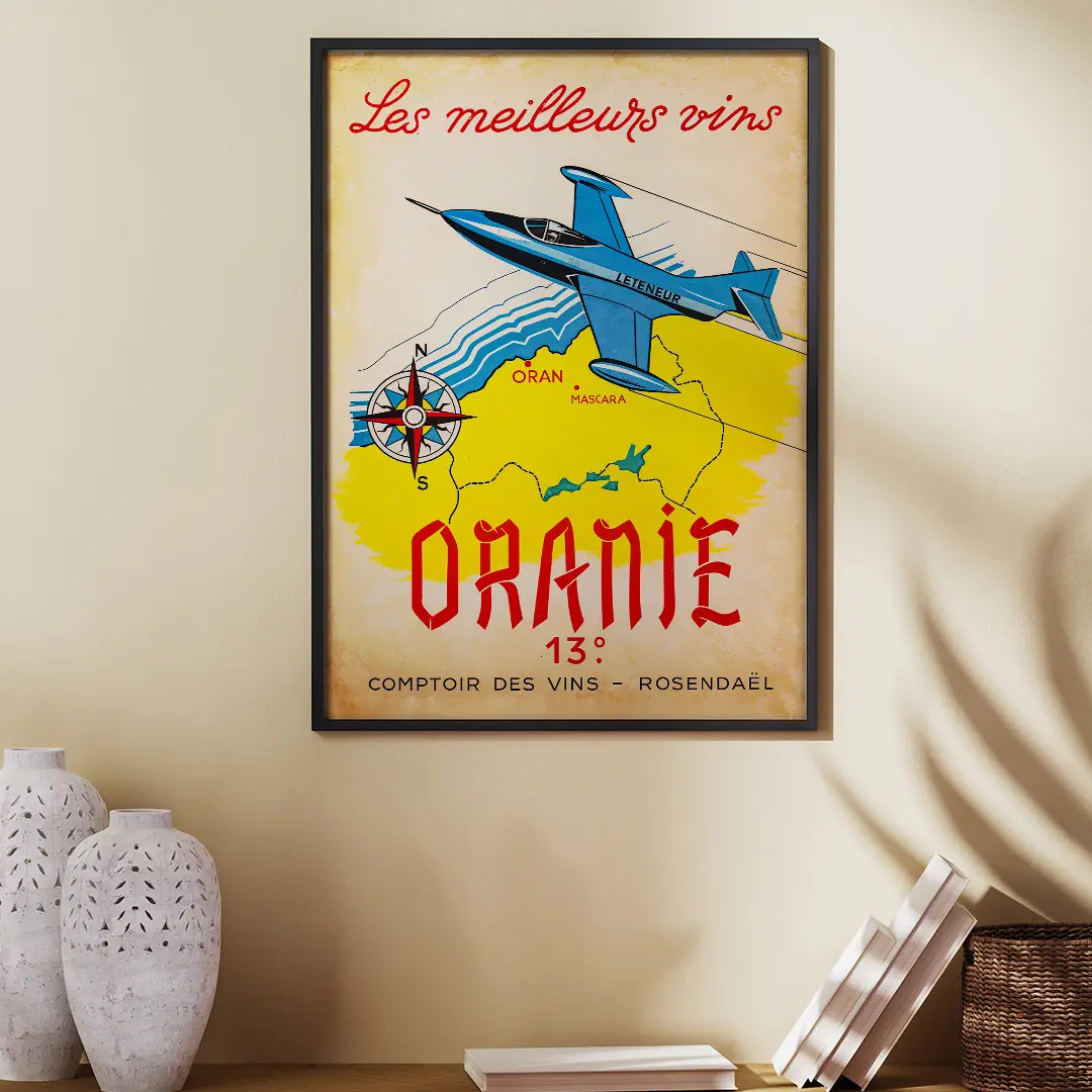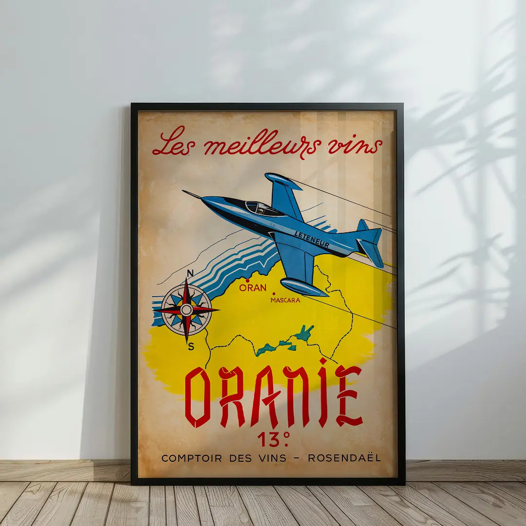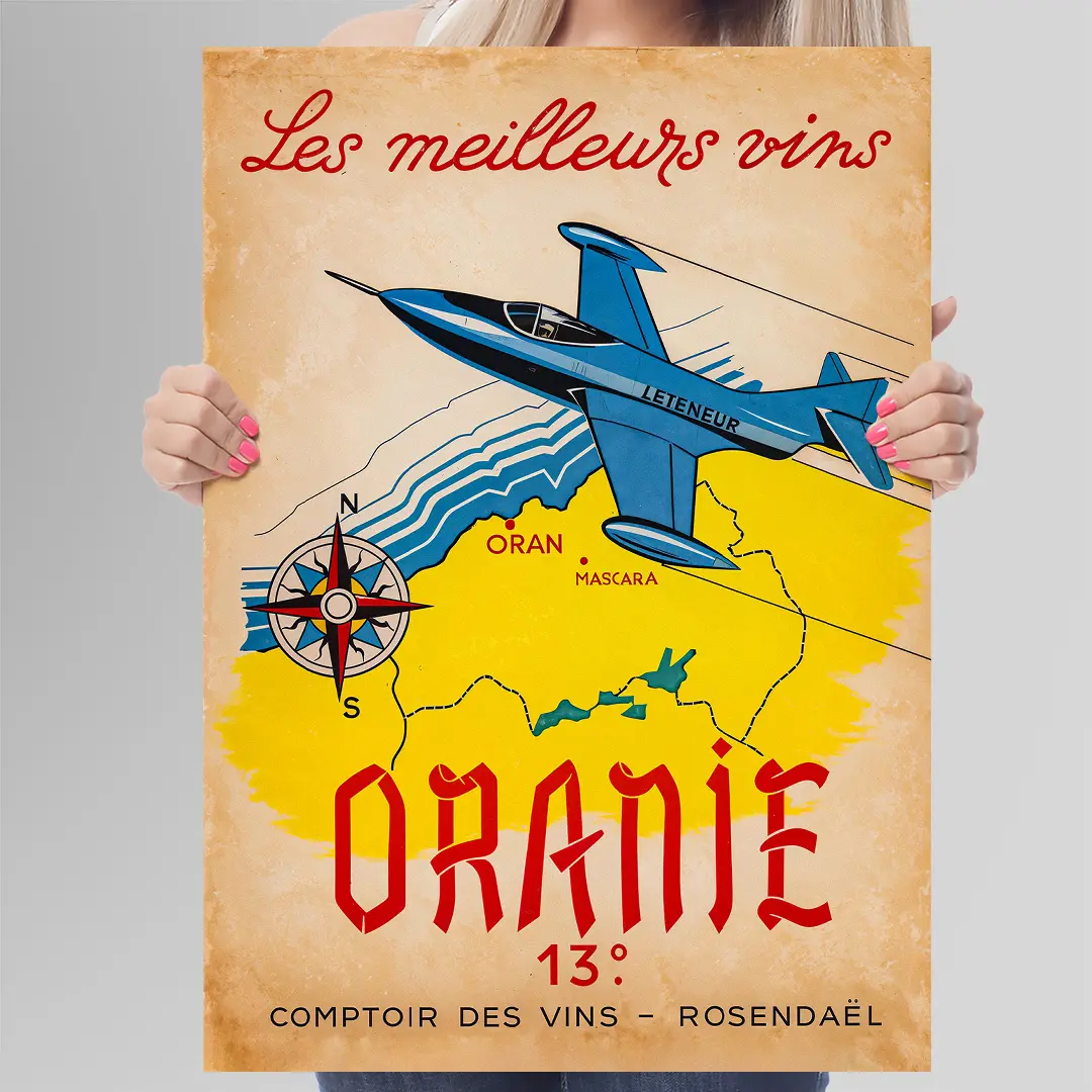 Cette affiche vintage met en lumière l’âge d’or de la viticulture en Oranie, lorsque l’Algérie figurait parmi les plus grands producteurs de vin au monde. Entre tradition agricole et modernité aérienne, elle raconte une époque où Oran et ses environs rayonnaient à l’international.
