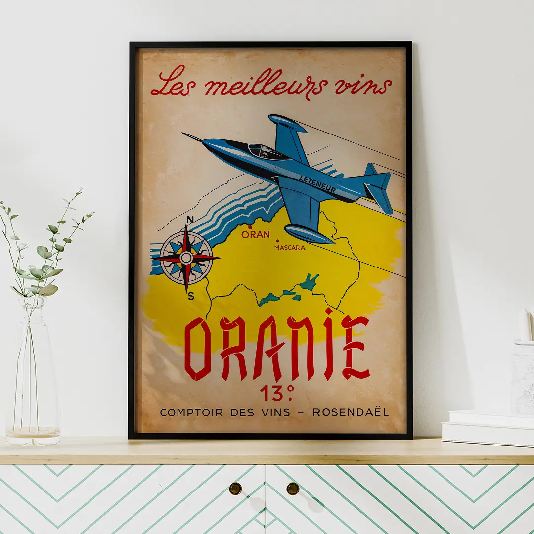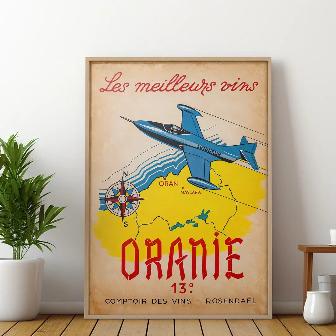 Le contraste entre tradition et modernité rend cette œuvre encore plus intéressante. D’un côté, la viticulture représente un savoir-faire ancien. De l’autre, l’avion évoque une époque tournée vers l’avenir. Par conséquent, cette affiche vintage Oranie possède une forte valeur symbolique.