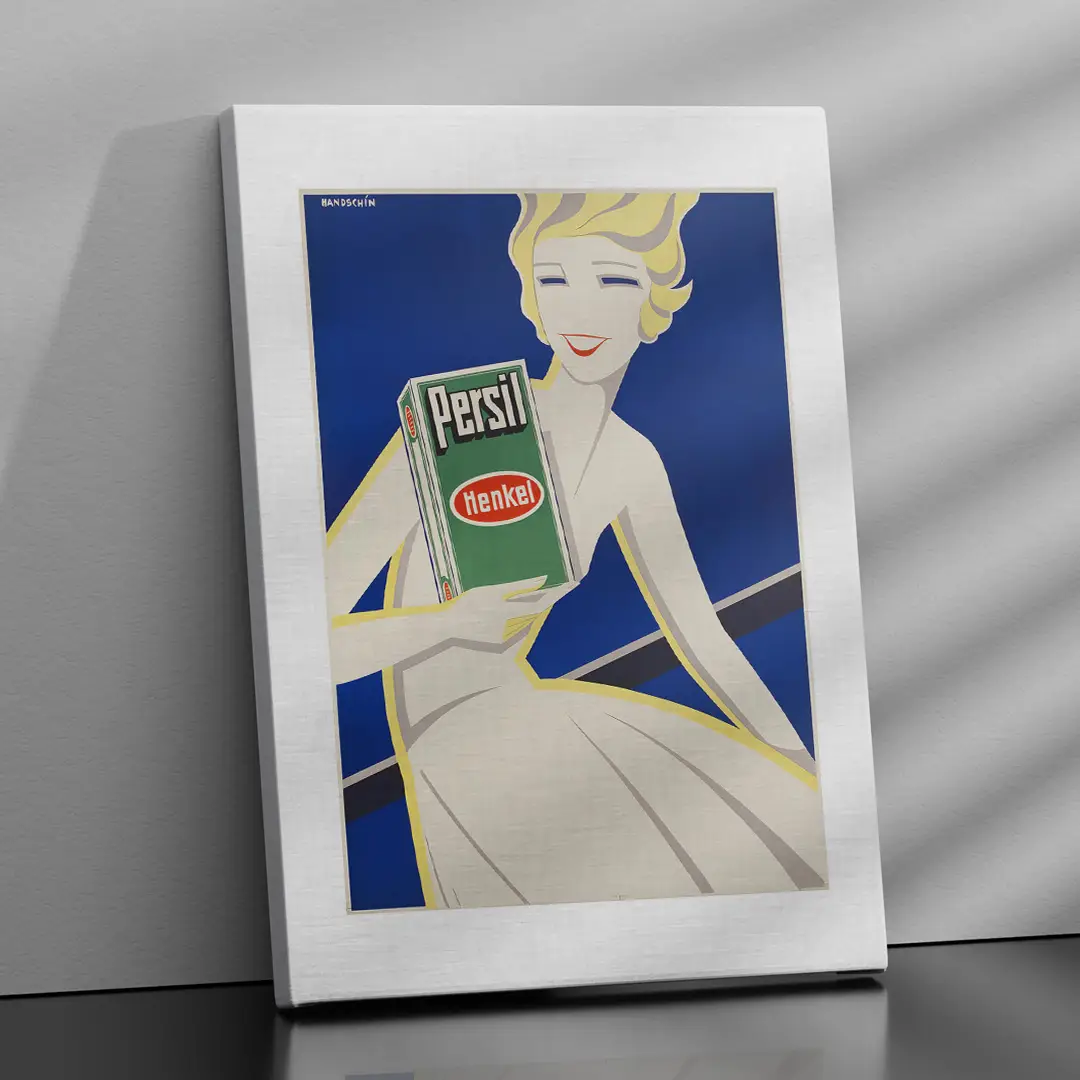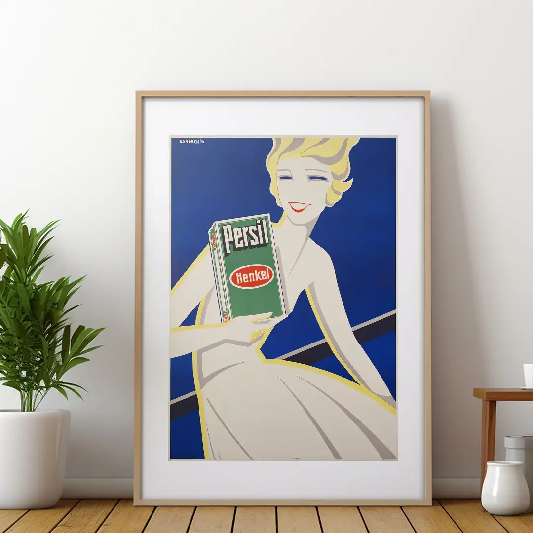 Apportez une touche d’élégance moderniste à votre intérieur avec cette reproduction de l’affiche publicitaire mythique pour Persil (Henkel), créée par l’artiste Johannes Handschin. Cette œuvre capture parfaitement l’esthétique lumineuse des années 50, mettant en scène une figure féminine stylisée sur un fond bleu profond. Une pièce de décoration murale idéale pour les amateurs de design rétro, de publicités anciennes et d’art graphique minimaliste. Un classique intemporel qui illumine instantanément une cuisine, une buanderie ou un salon contemporain.