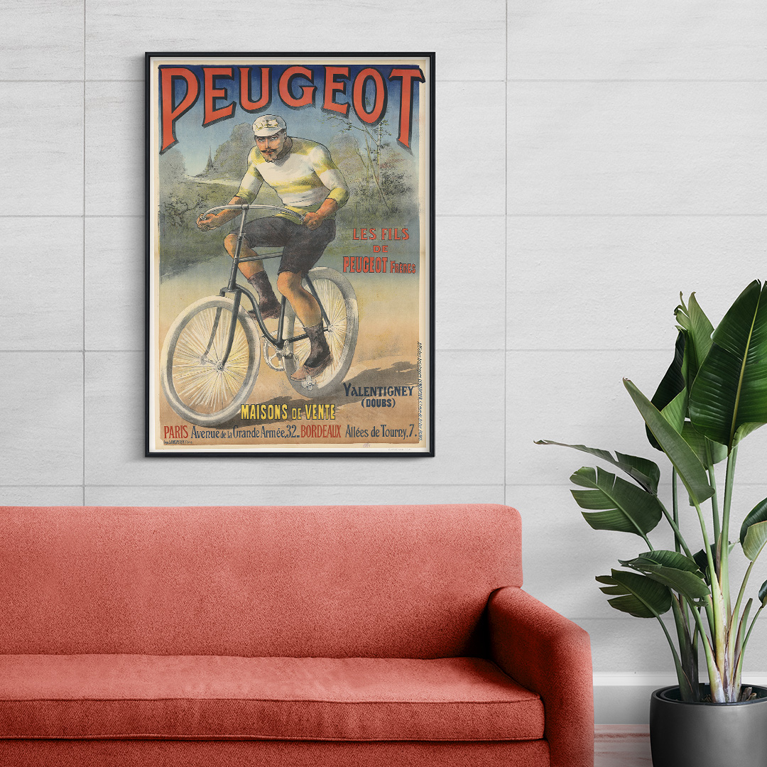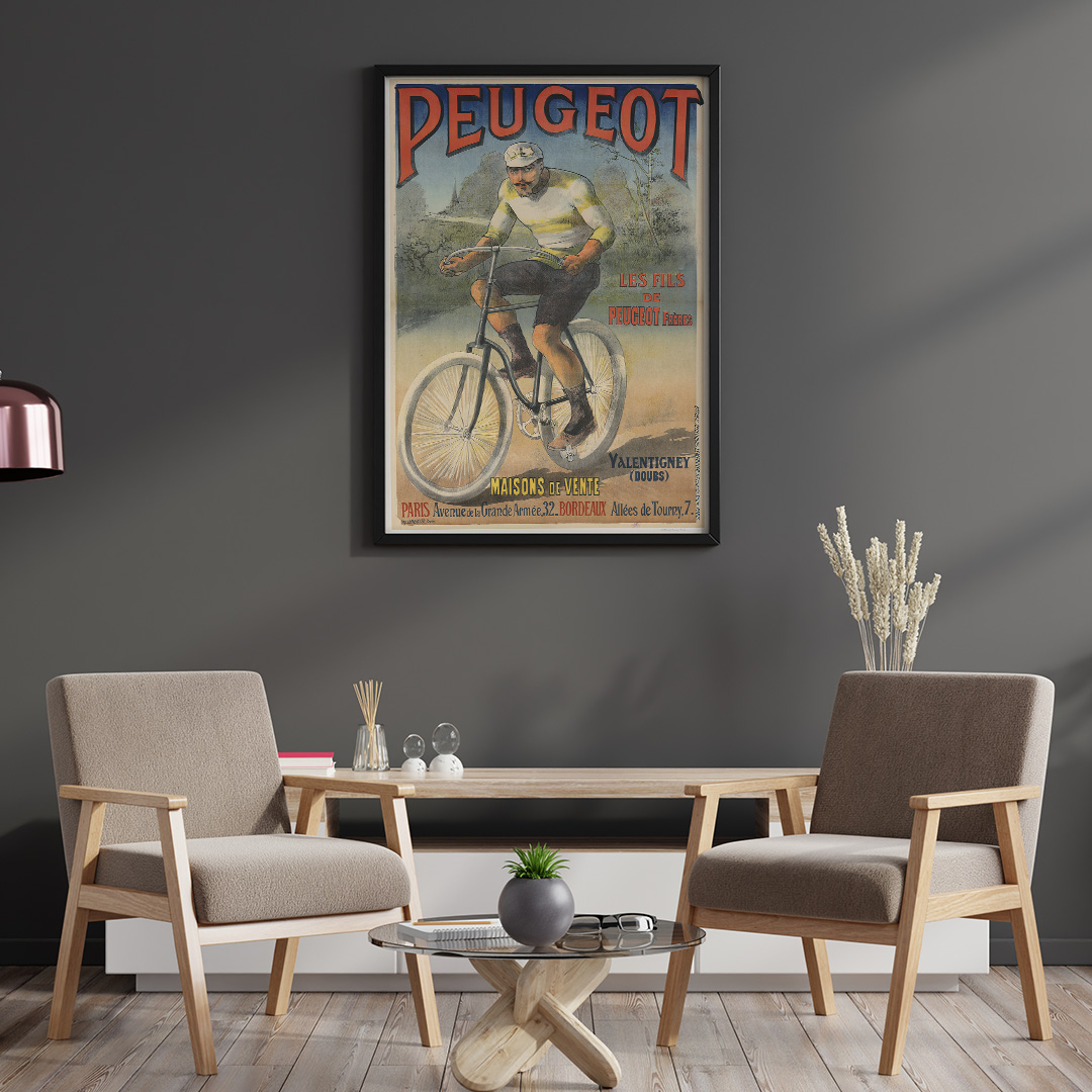 Grâce à son charme intemporel, cette affiche Peugeot vintage s’intègre harmonieusement dans différents univers décoratifs. Ainsi, elle trouve naturellement sa place dans un salon au style industriel, mais également dans un bureau rétro ou une bibliothèque élégante. Par ailleurs, elle apporte une ambiance culturelle raffinée tout en conservant une grande sobriété visuelle.
