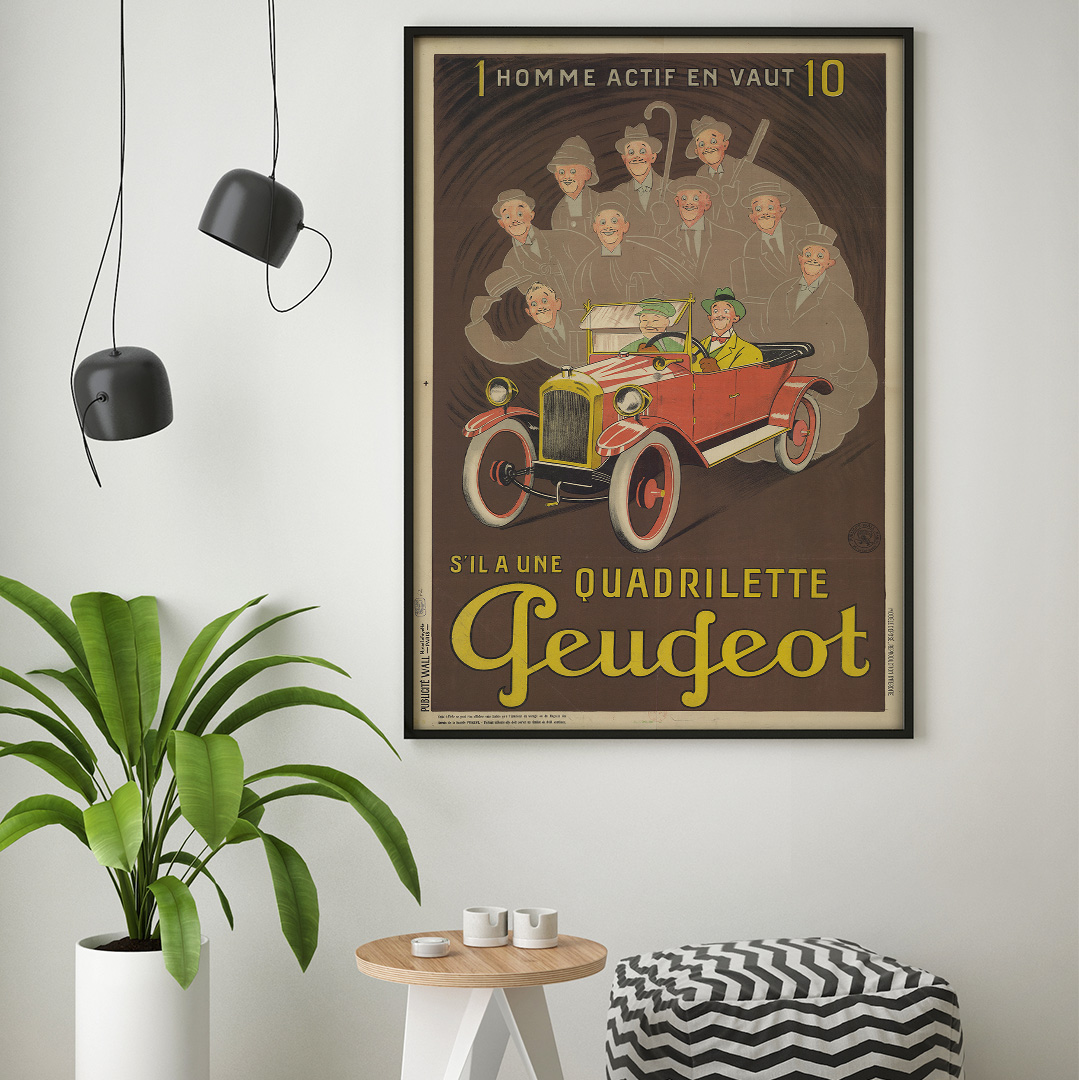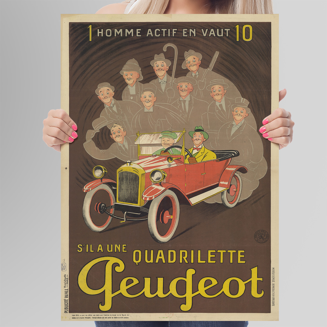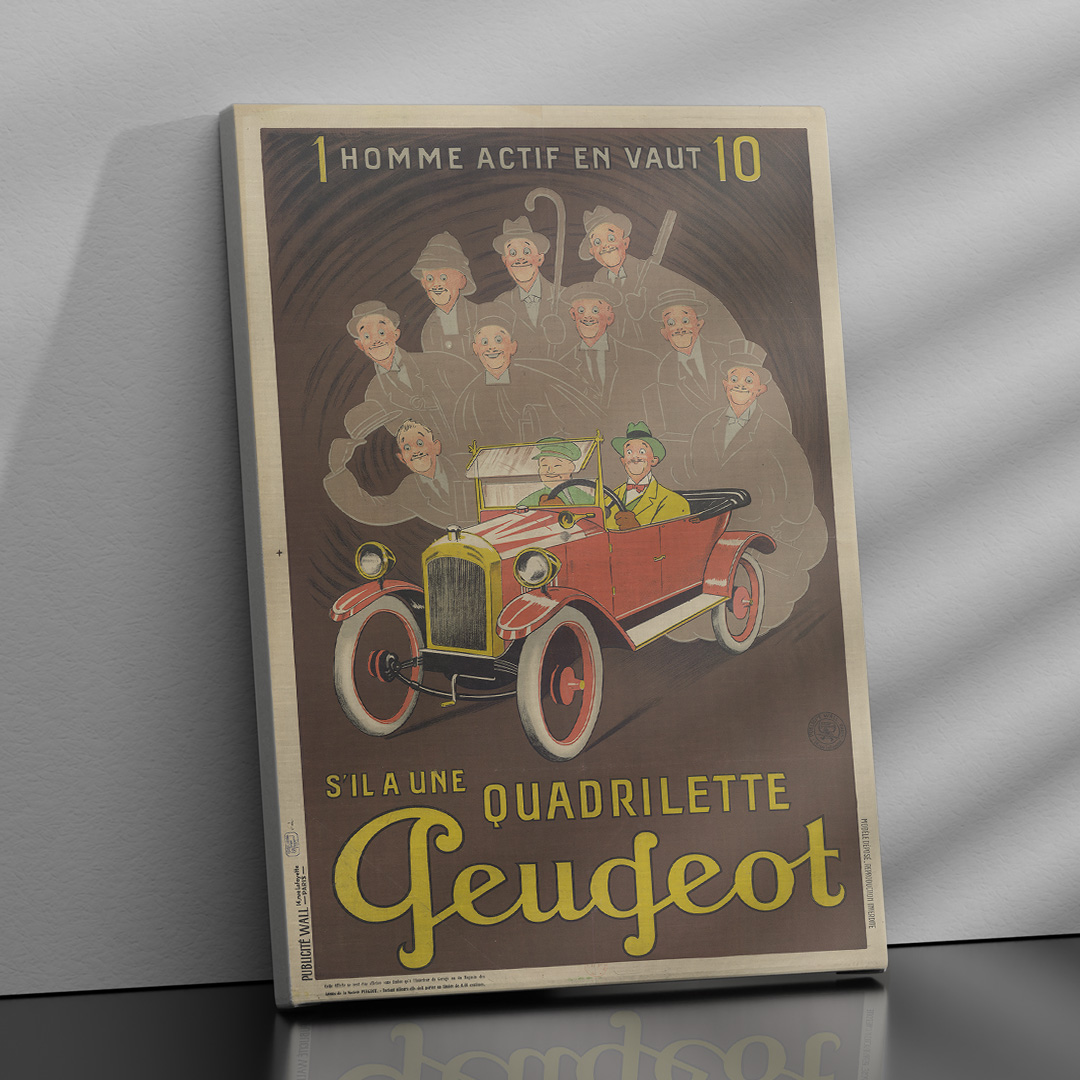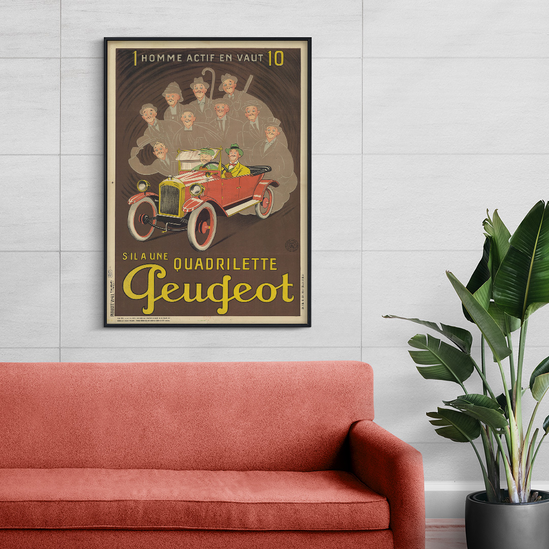 L’affiche vintage 1 homme actif en vaut 10 montre la célèbre Quadrilette Peugeot de 1925. Elle apporte immédiatement un charme rétro et authentique à votre intérieur. Ce modèle attire les passionnés d’automobiles anciennes et les amateurs de décoration vintage.