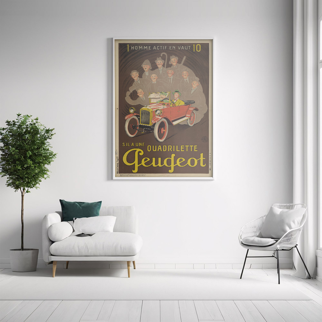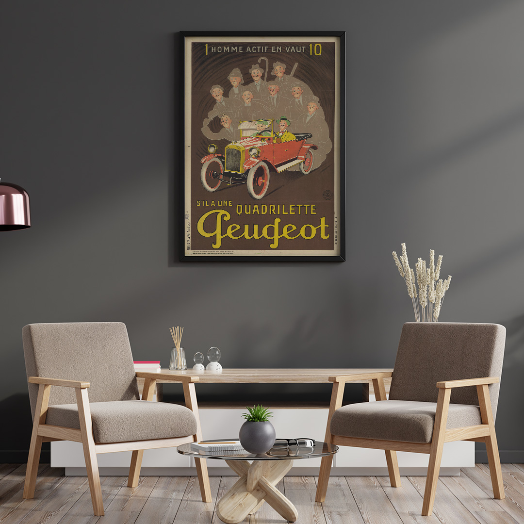 Affiche vintage Peugeot 1925 « 1 Homme Actif en Vaut 10 ». Style rétro et charme authentique, parfaite pour décorer salons, bureaux ou cafés au style vintage.
