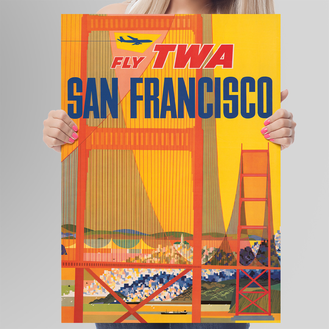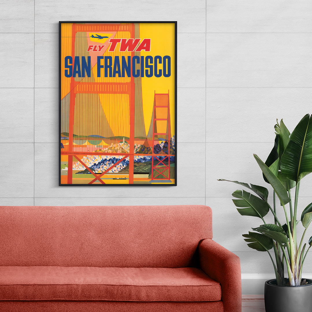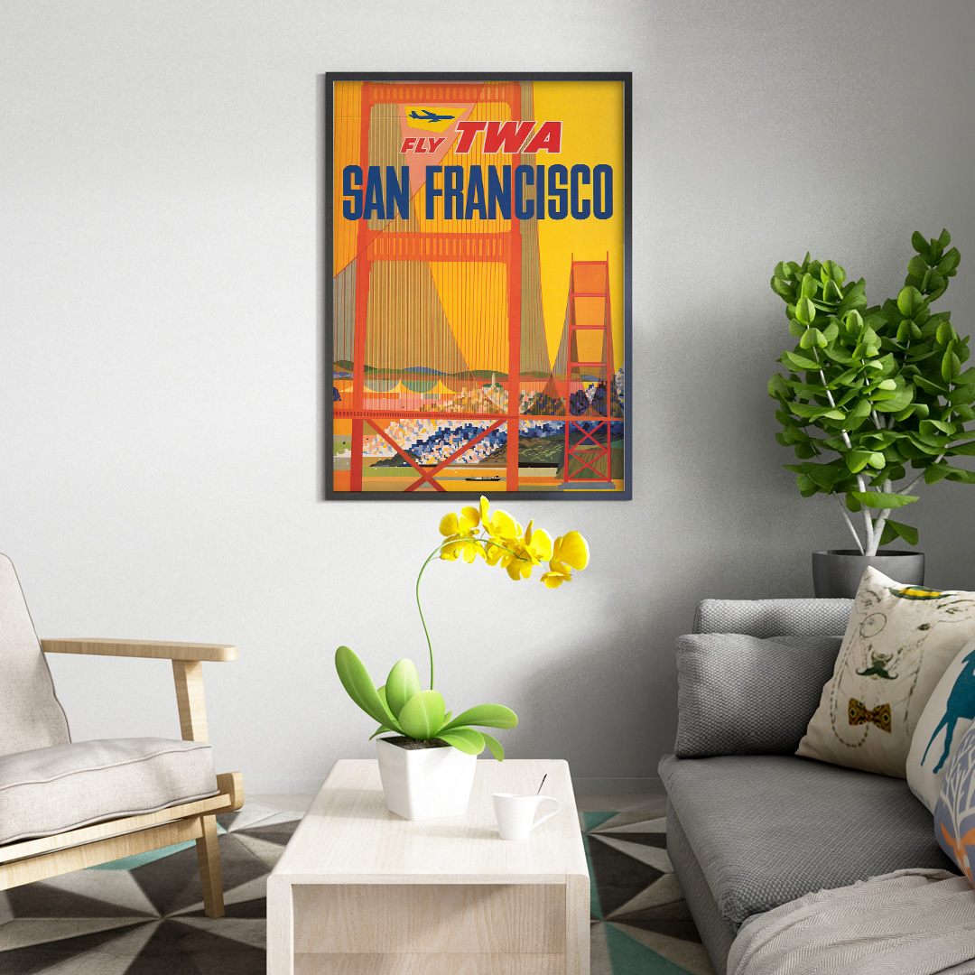 En exclusivité en Algérie sur Dzeco.art, cette affiche vintage San Francisco Fly TWA est une pièce emblématique du patrimoine visuel américain, parfaite pour les amoureux du voyage et du design.