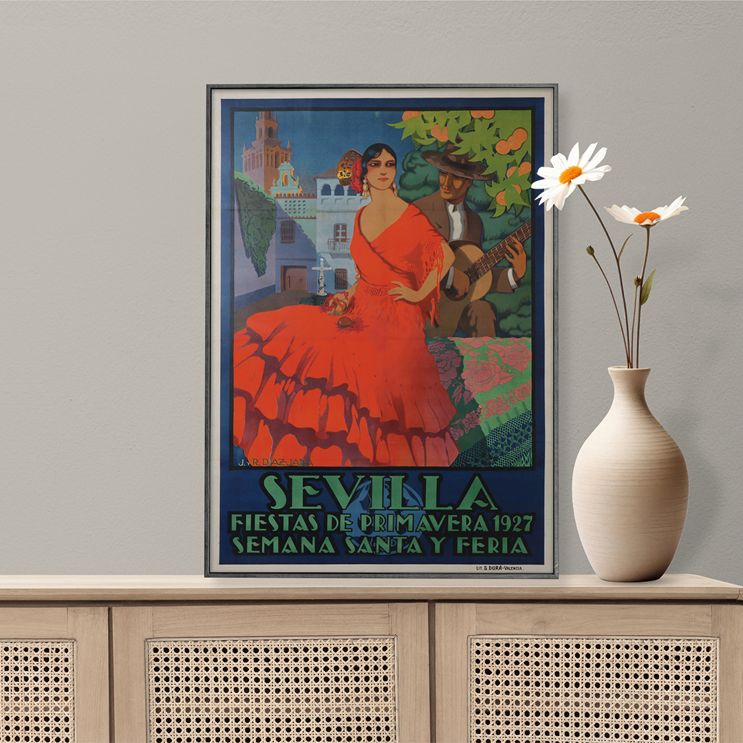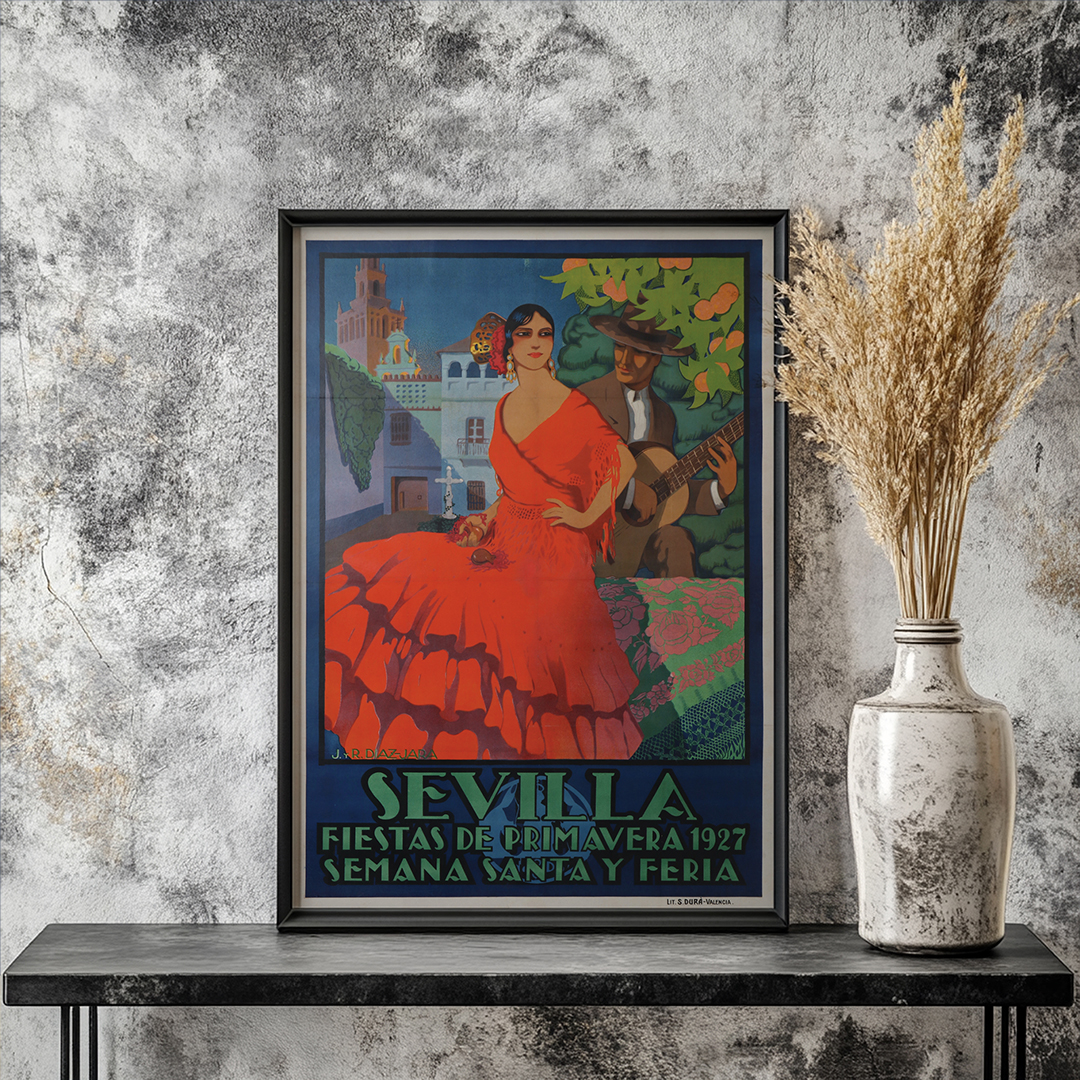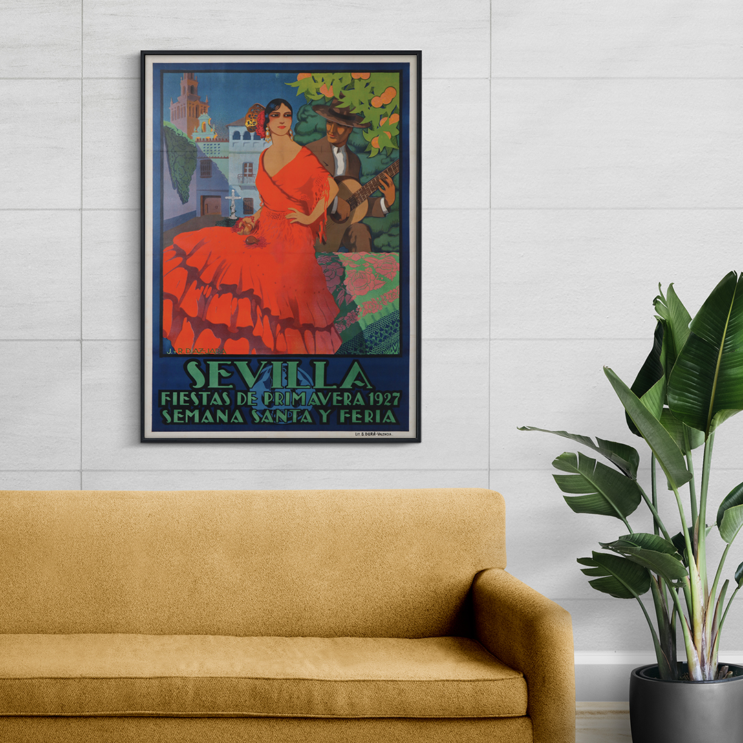 L’affiche vintage Sevilla Fiestas de Primavera 1927 capture la beauté de Séville dans les années 1920. Couleurs vives, ambiance festive et charme andalou en font une pièce d’art déco incontournable. Disponible sur papier ou toile, avec plusieurs formats et cadres au choix chez Dzeco.art.