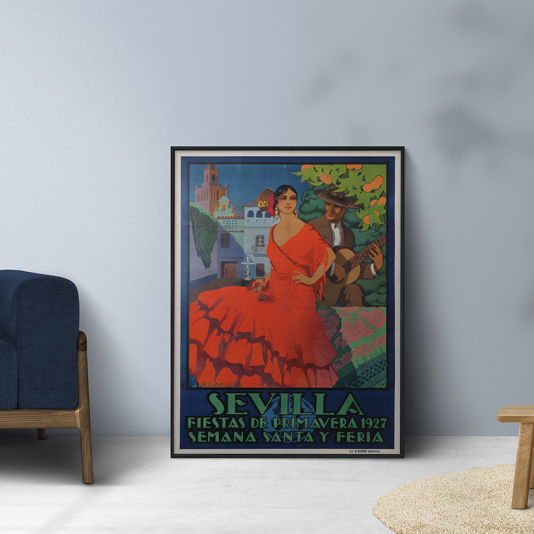Chez Dzeco.art, cette affiche vintage Sevilla Fiestas de Primavera 1927 est disponible en quatre tailles, du A4 au A1. Vous pouvez choisir entre deux finitions :