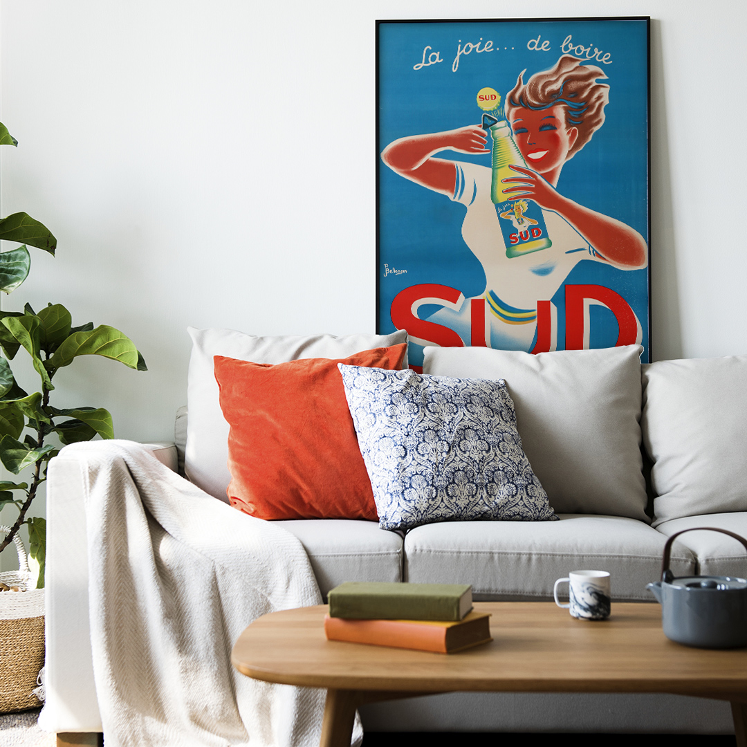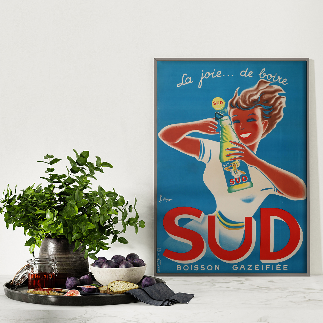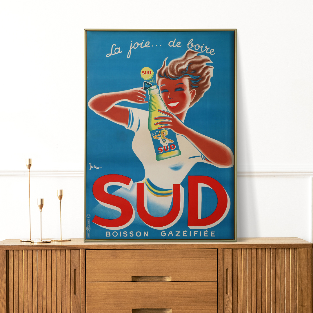 L’affiche « La joie de boire SUD » dépasse son rôle promotionnel. Elle incarne l’optimisme d’une époque et illustre l’habileté des artistes publicitaires à transformer un produit en véritable expérience visuelle. Exposée dans un intérieur moderne ou rétro, elle apporte couleur, énergie et authenticité.