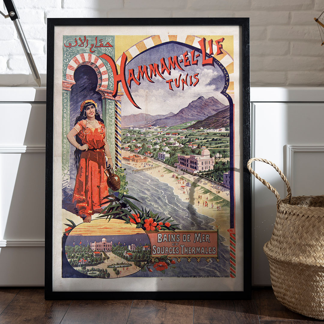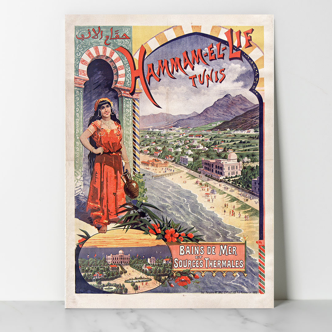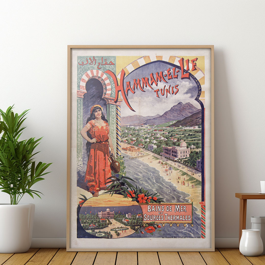 Affiche vintage Hammam-el-Lif (1895) par Emile Levy, représentant les bains de mer et sources thermales de Tunisie, impression sur verre ou toile sur châssis bois, formats A4 à A1.