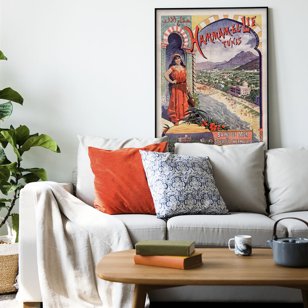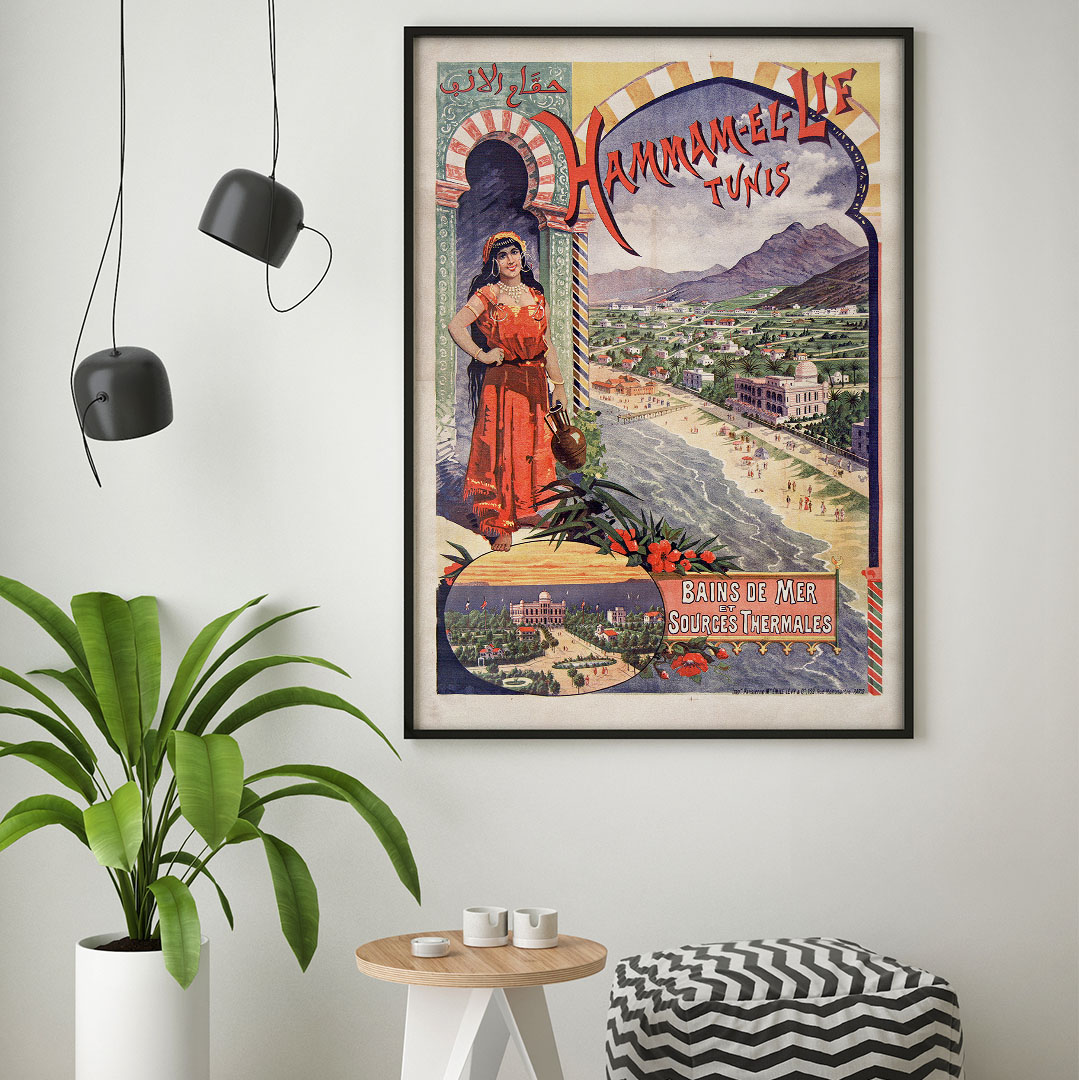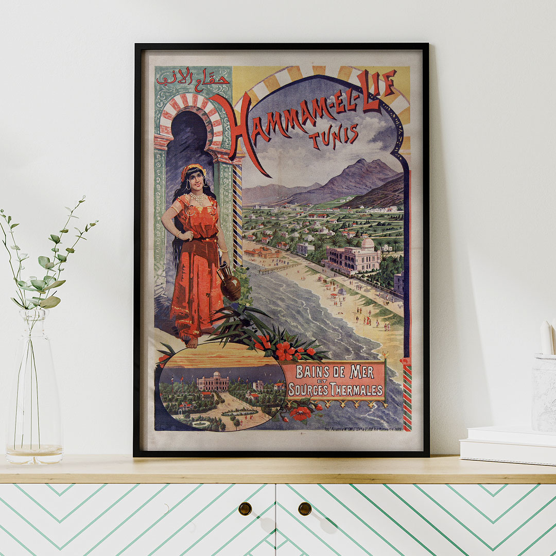 Affiche vintage Hammam-el-Lif (1895) par Emile Levy, représentant les bains de mer et sources thermales de Tunisie, impression sur verre ou toile sur châssis bois, formats A4 à A1.