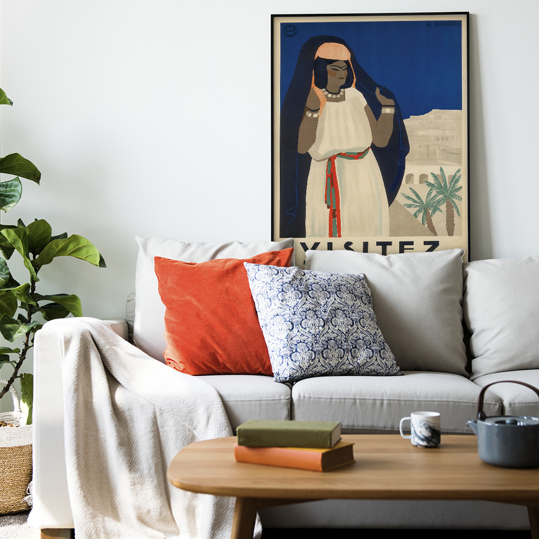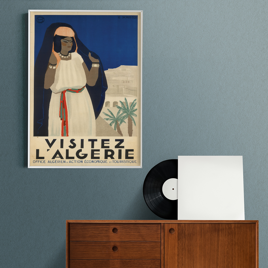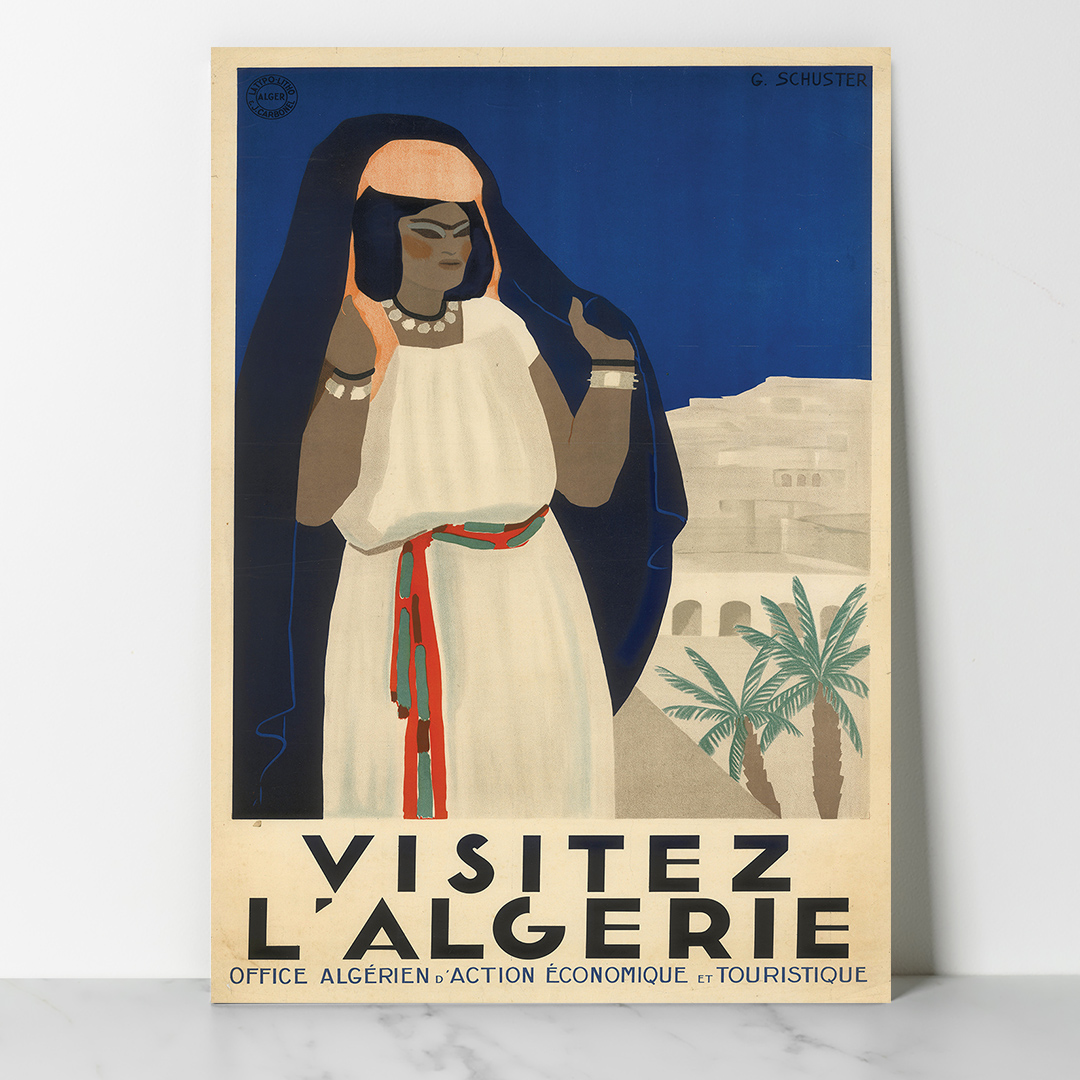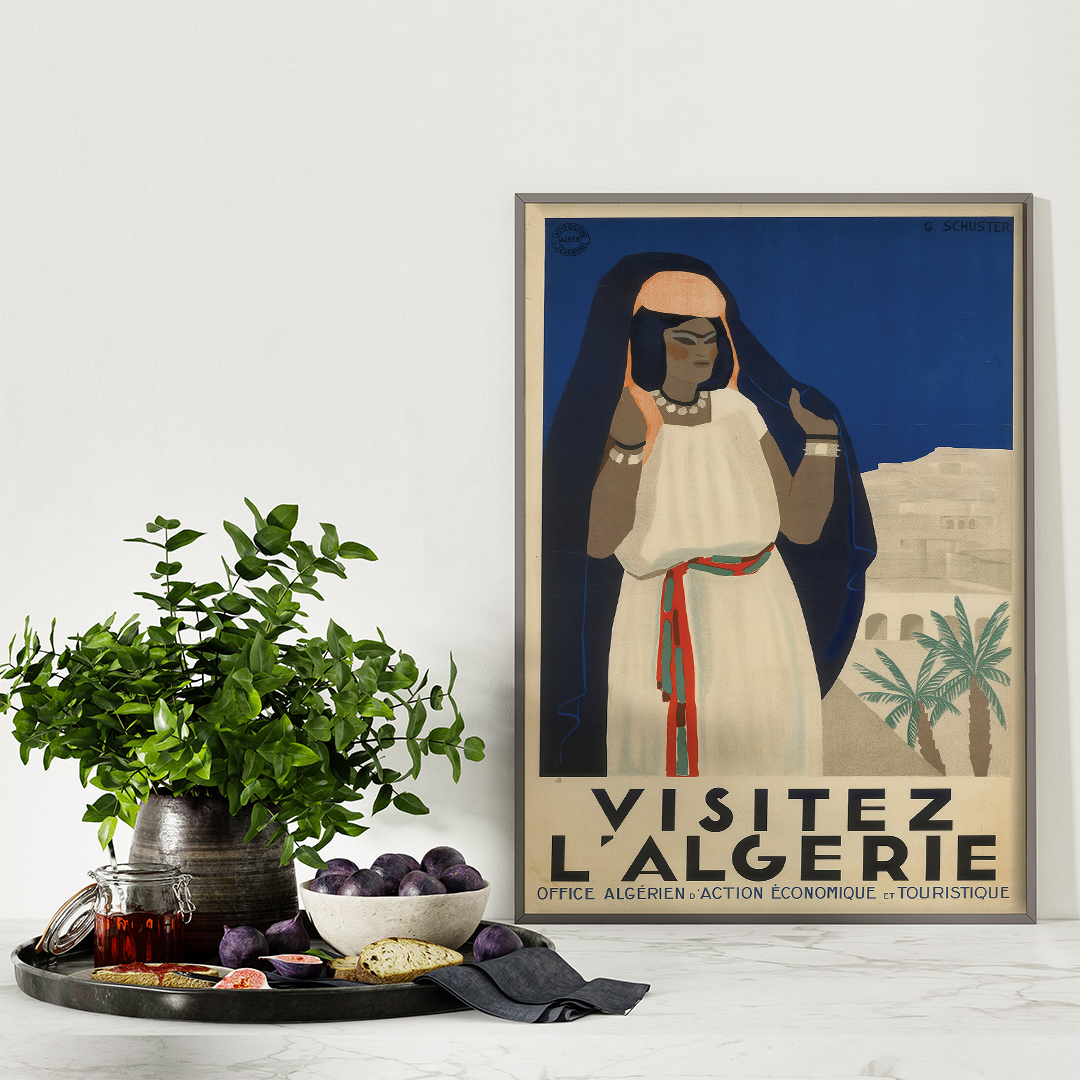 Cette affiche vintage Algérie Visitez l’Algérie (années 1930, G. Schuster) incarne l’élégance art déco et l’exotisme méditerranéen. Elle met en scène une femme algérienne en habit traditionnel, symbole de voyage, d’histoire et de décoration rétro raffinée. Idéale pour passionnés et collectionneurs.