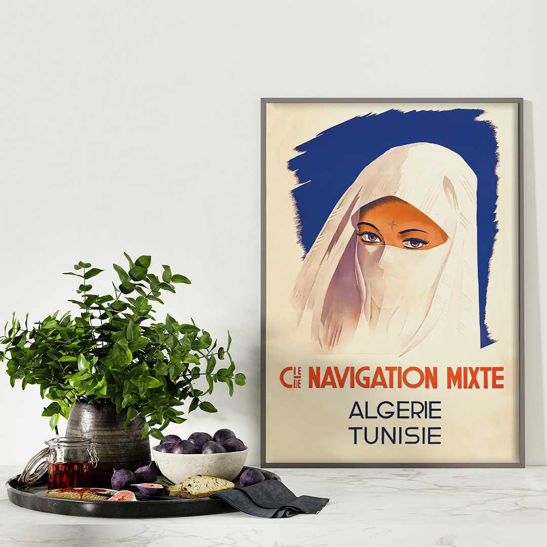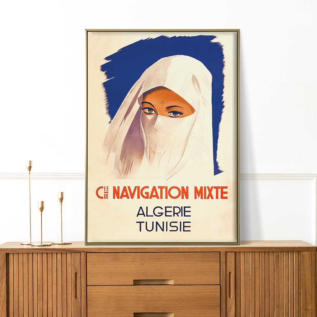 Cette affiche vintage Algérie Tunisie des années 1950, signée Maurice Dard, fut créée pour la Compagnie de Navigation Mixte. La figure d’une femme en haïk blanc symbolise exotisme et mystère. En décoration murale rétro, elle apporte élégance, authenticité et une touche méditerranéenne unique.
