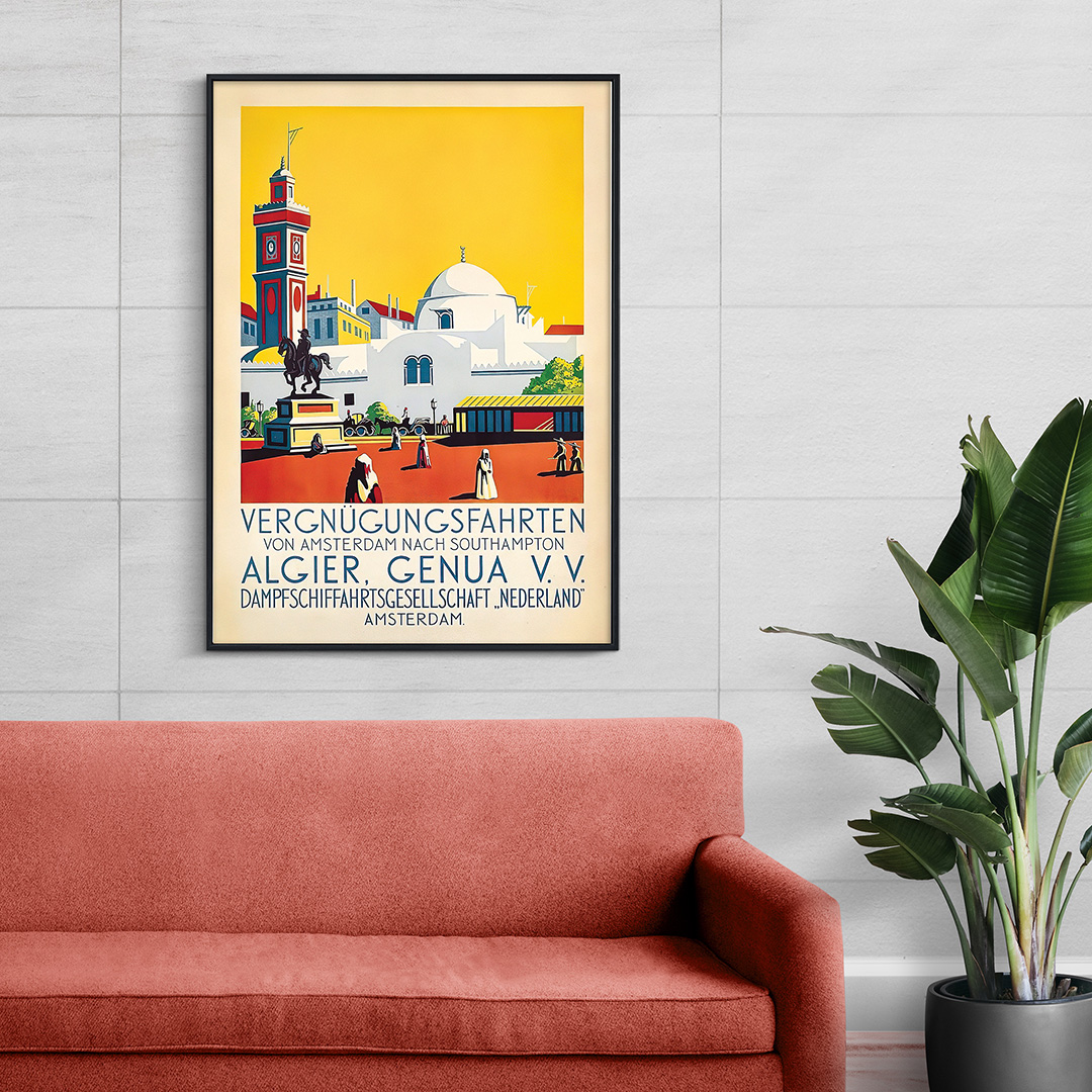 Cette magnifique affiche Algérie vintage intitulée “Algier, Vergnügungsfahrten” nous transporte dans les années 1930, à l’époque dorée des croisières méditerranéennes. Réalisée dans un style Art Déco élégant, elle met en valeur la ville d’Alger, joyau lumineux du littoral nord-africain. L’artiste y capture la beauté du port, les façades blanches et la lumière dorée du soleil, symboles d’un Orient rêvé et accueillant.