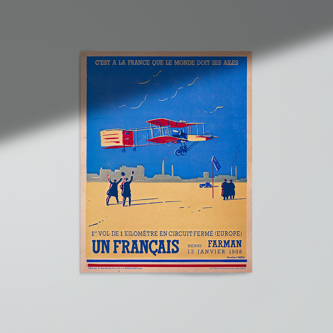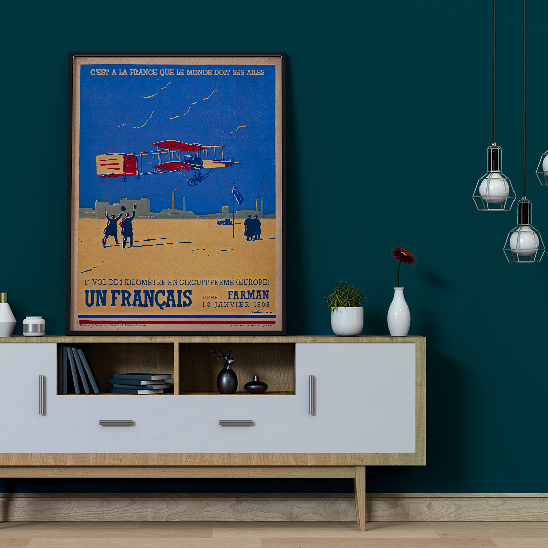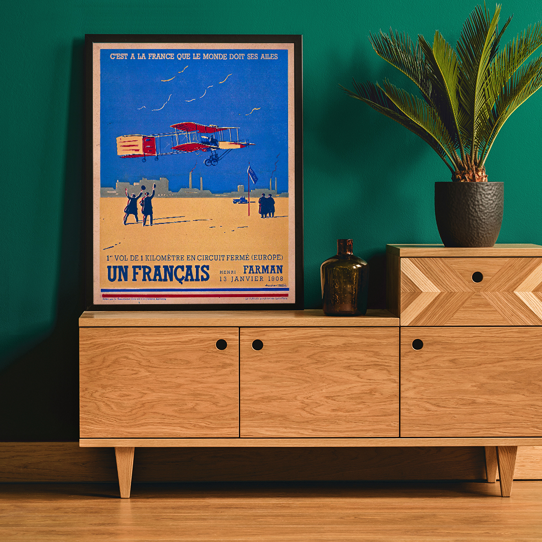 De plus, son graphisme s’inscrit dans l’esprit de l’Art nouveau. Les lignes fluides, les contrastes colorés et la représentation du biplan de Farman traduisent à la fois l’élan vers le futur et le prestige culturel français. Ainsi, l’affiche 1er vol 1 km France 1908 incarne à la fois un jalon technologique et une pièce artistique de valeur.