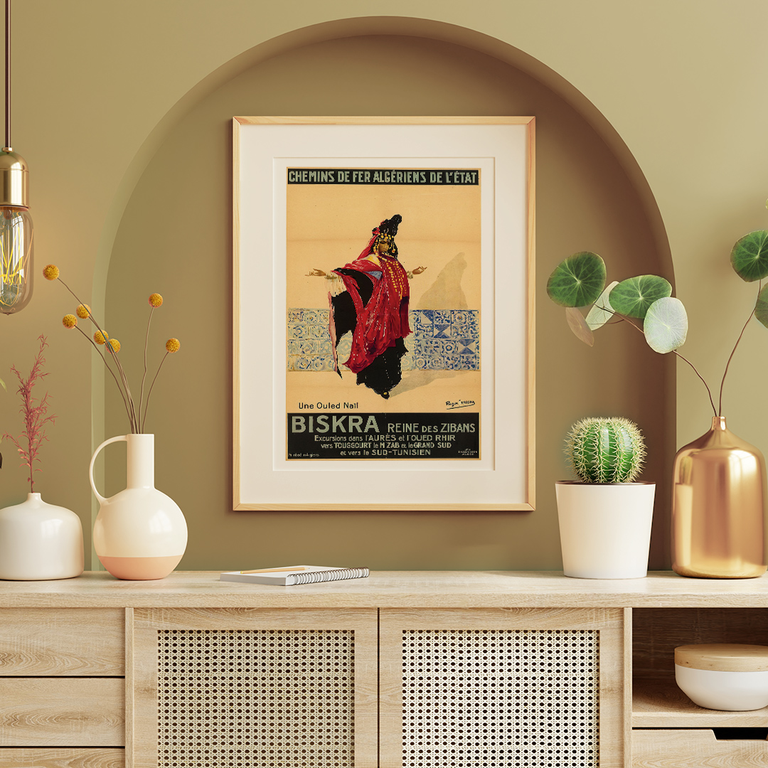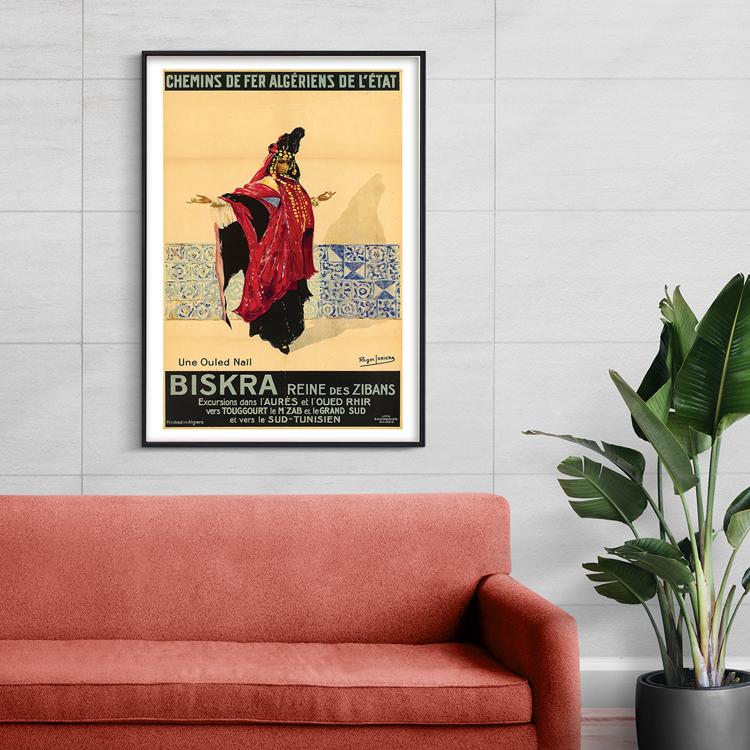 Revivez l’âge d’or du voyage ferroviaire avec cette superbe affiche ancienne des chemins de fer algériens, illustrant la région de Biskra, surnommée la « Reine des Zibans ». Véritable invitation à l’évasion, l’affiche met en scène la splendeur de Ouled Naïl, en bordure du Sahara, entre tradition, architecture et paysages arides baignés de lumière.