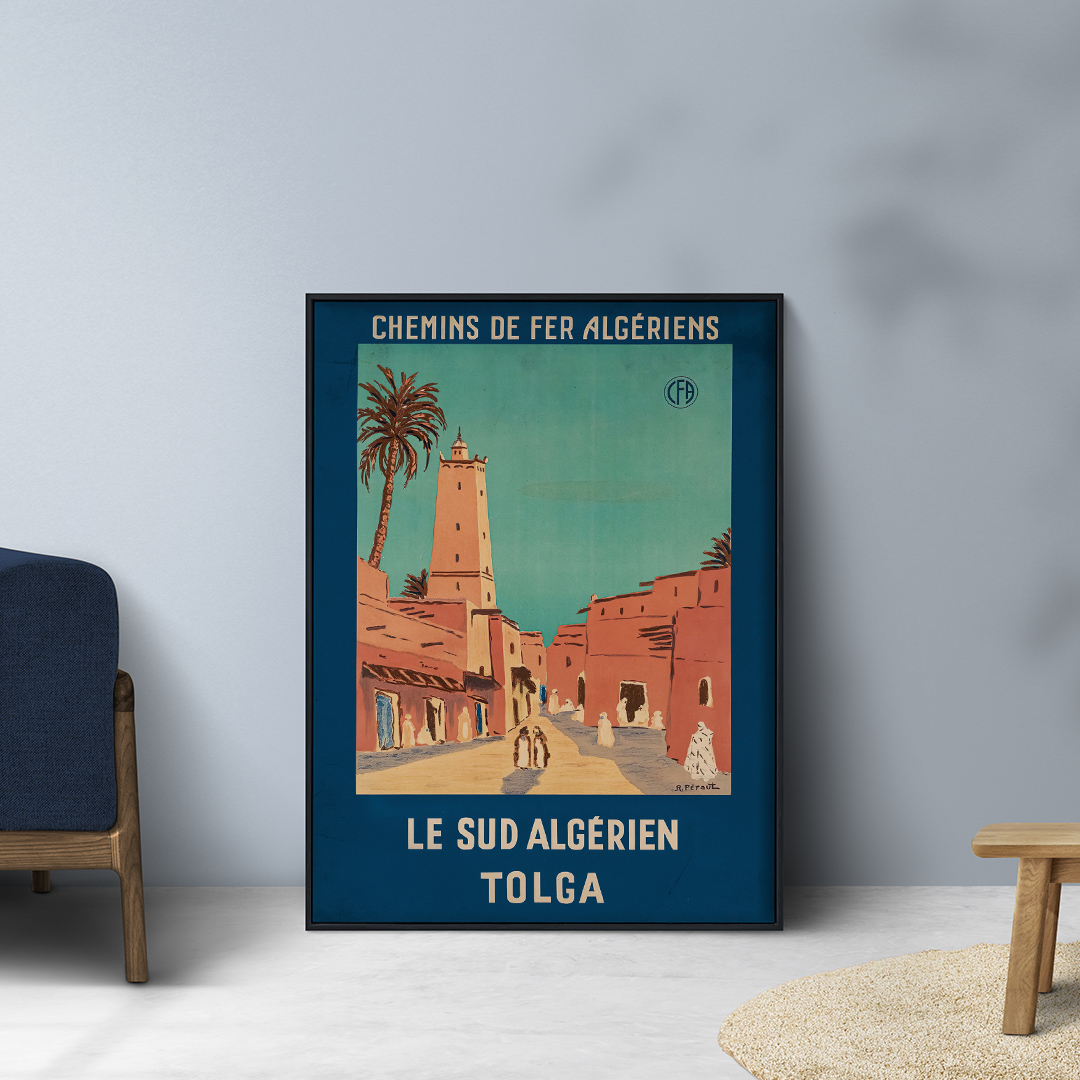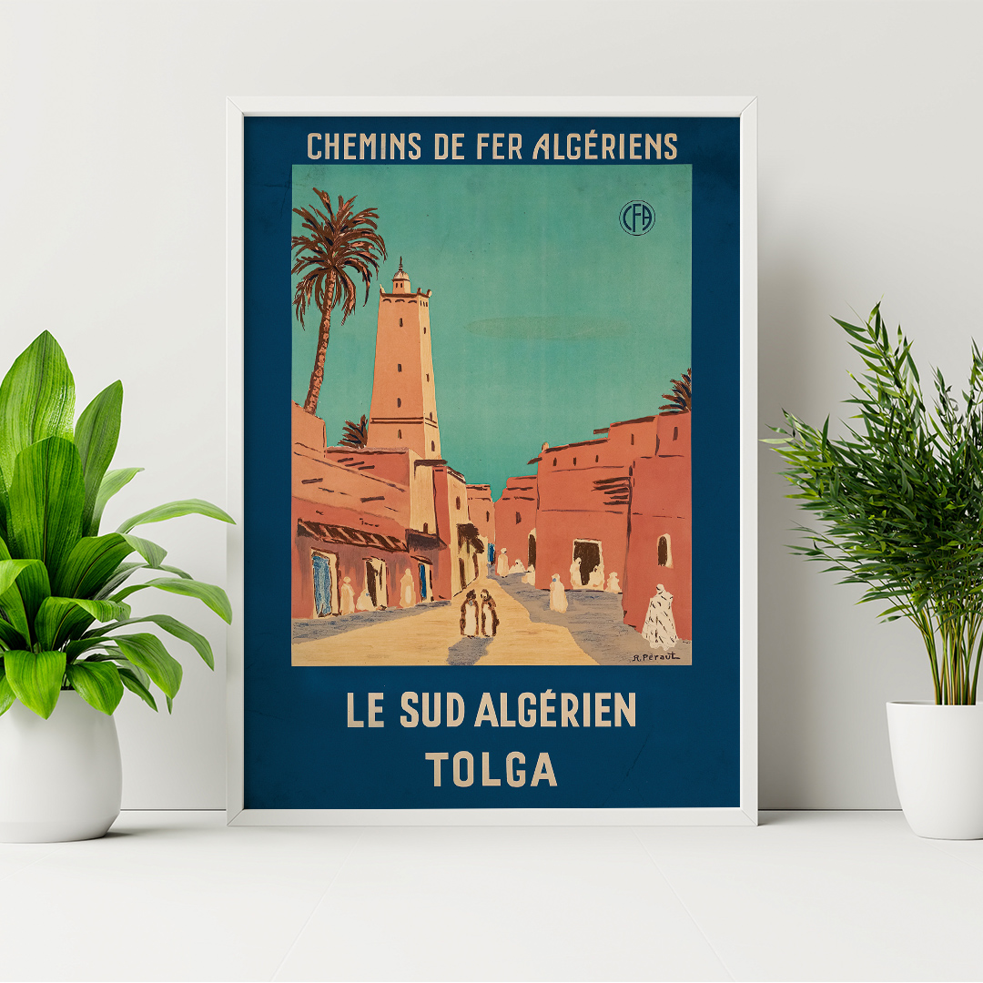 Découvrez toute la magie du désert et la richesse du patrimoine algérien avec cette superbe affiche ferroviaire ancienne intitulée « Le Sud Algérien – Tolga », signée par l’artiste R. Péraut. Éditée au début du XXe siècle pour les chemins de fer algériens, cette œuvre emblématique invitait les voyageurs à l’évasion à travers les palmeraies luxuriantes et les paysages envoûtants du Sud.