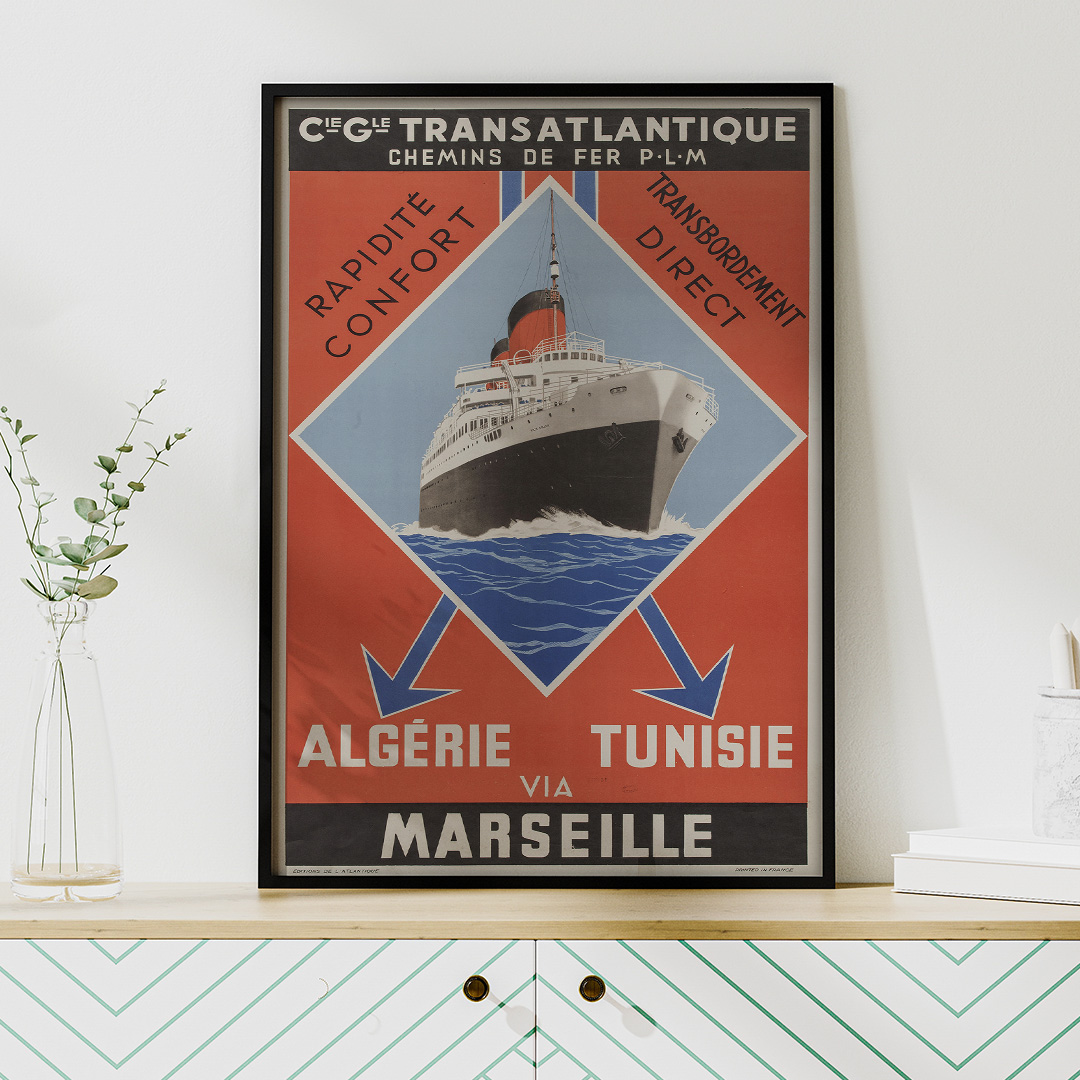 D’abord, cette Affiche vintage Transatlantique faisait la promotion des liaisons maritimes rapides. Elle représentait le lien entre la France et l’Afrique du Nord. Par ailleurs, le design Art Déco met en avant un paquebot majestueux. Ce navire est le symbole du confort. la Compagnie Générale Transatlantique et les Chemins de fer
