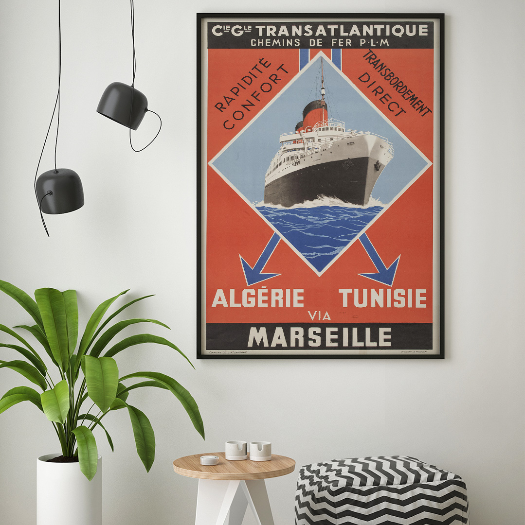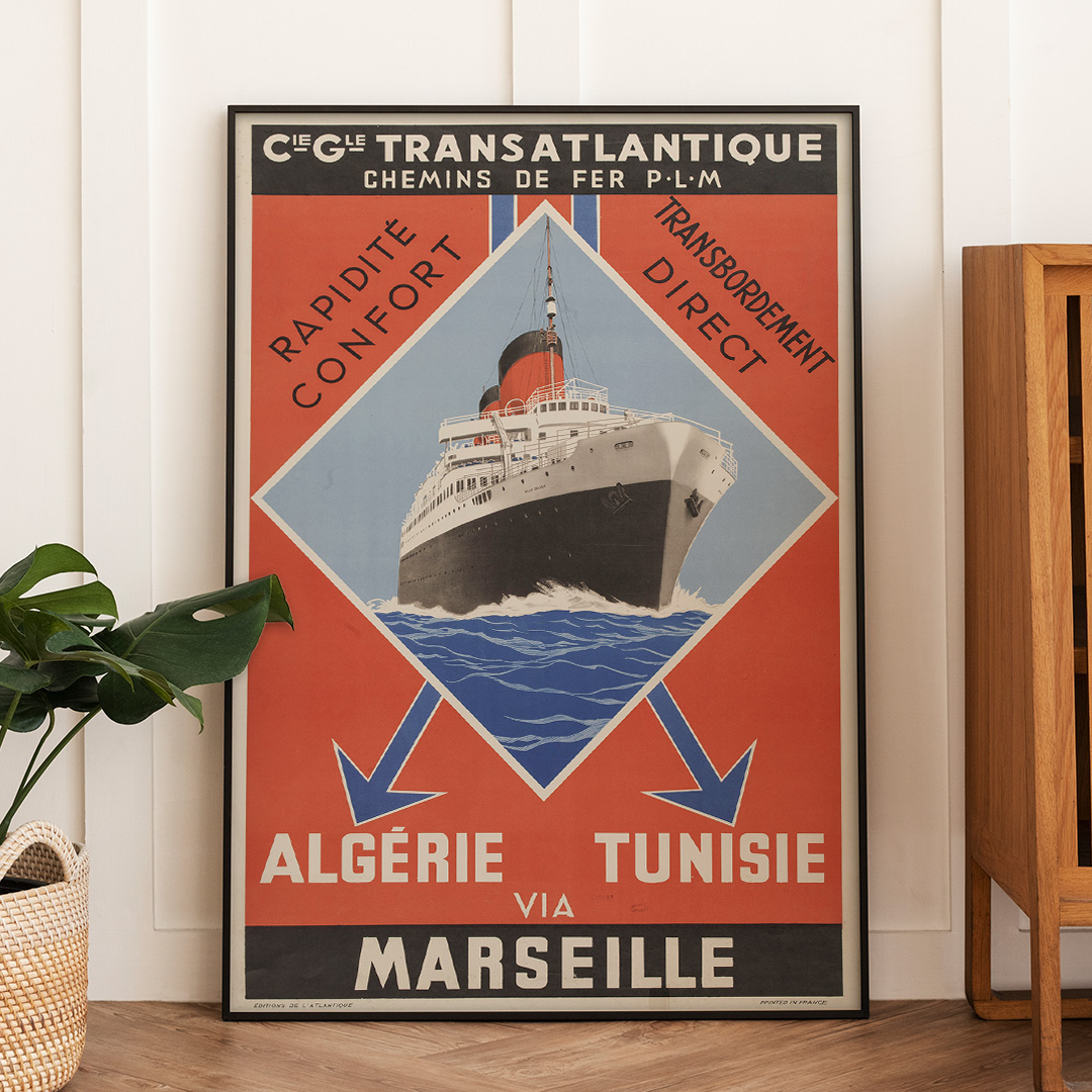 Découvrez l’Affiche vintage Transatlantique – Algérie, Tunisie via Marseille 1930. En effet, cette œuvre est une pièce maîtresse pour votre décoration. Elle célèbre l’histoire du voyage en Méditerranée. De plus, ce visuel mythique capture l’élégance d’une époque révolue.