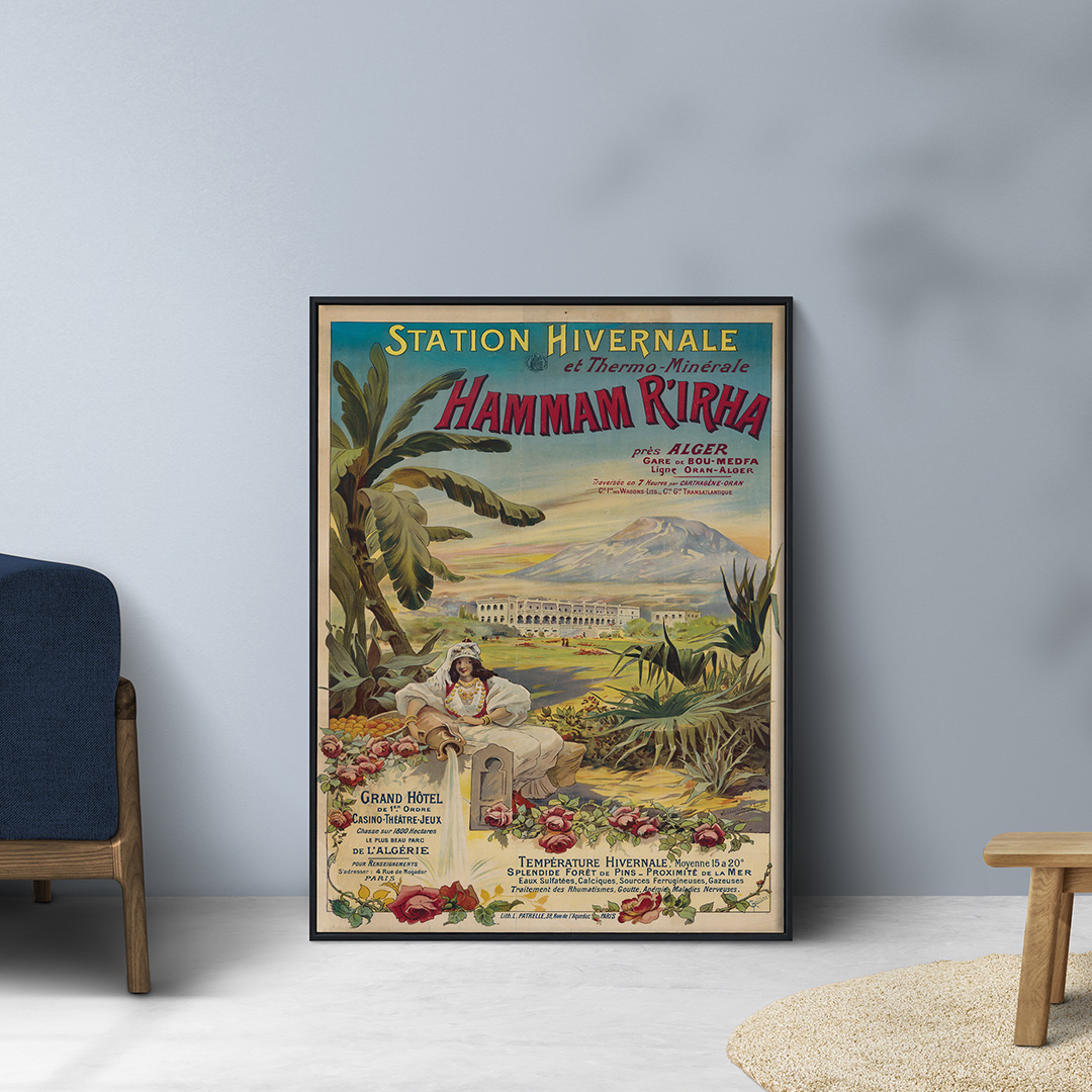 Redécouvrez l’élégance du patrimoine algérien à travers cette affiche Algérie hammam vintage, inspirée de la célèbre station thermo-minérale de Hammam R’Irha. Cette création du début du XXᵉ siècle illustre parfaitement l’atmosphère de détente et de raffinement qui régnait dans les stations thermales d’Algérie.