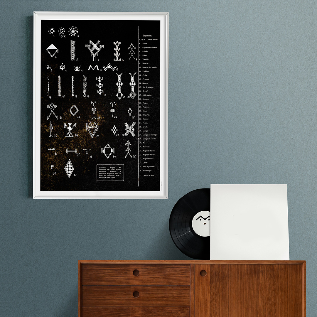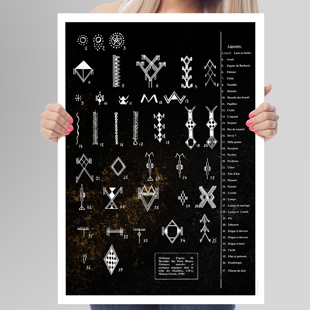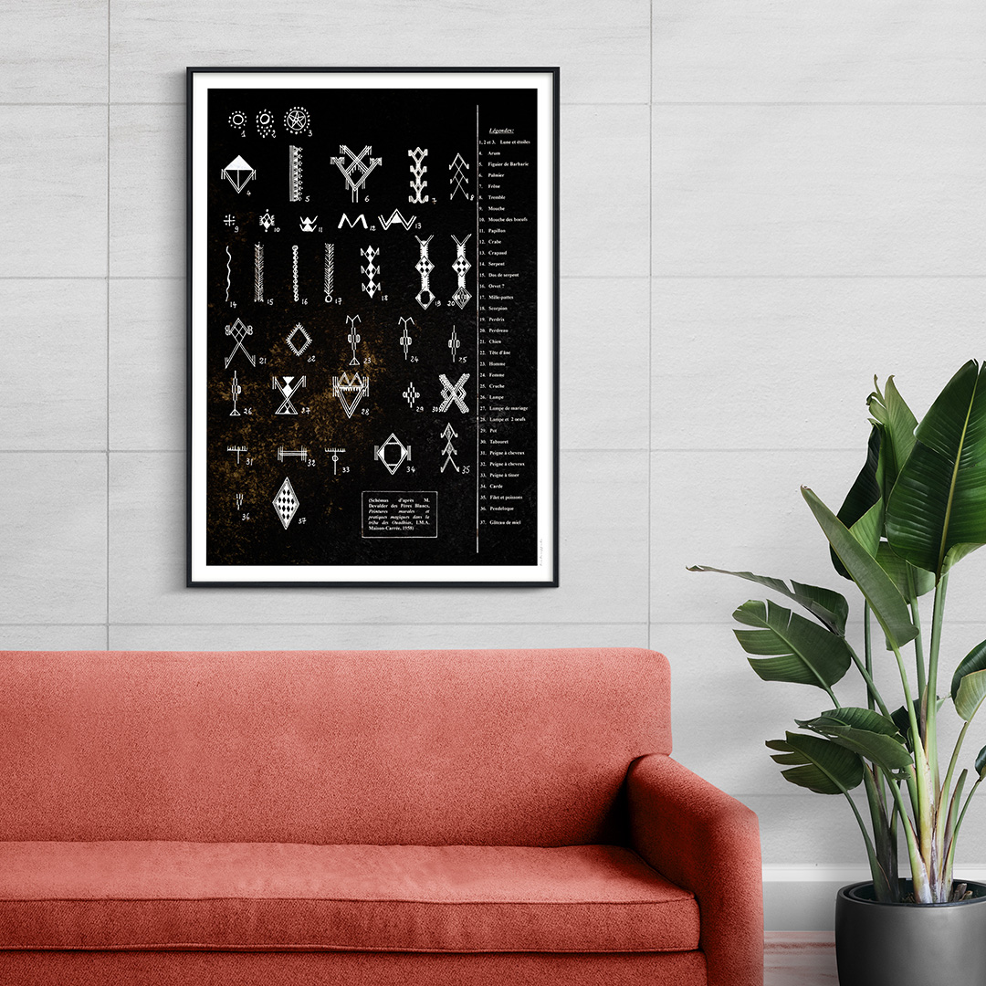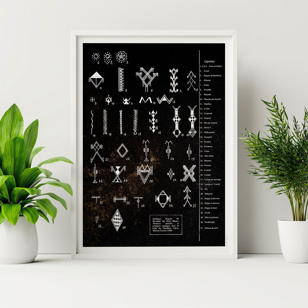Plongez dans l’univers mystérieux et fascinant des tableaux berbères décoratifs avec cette œuvre unique mêlant esthétique traditionnelle et dimension éducative. Inspiré des tatouages ancestraux, de la poterie kabyle et des gravures rupestres, ce tableau met en valeur les symboles amazighs (berbères) tout en offrant leurs significations en français. Un art mural qui allie beauté et transmission culturelle.