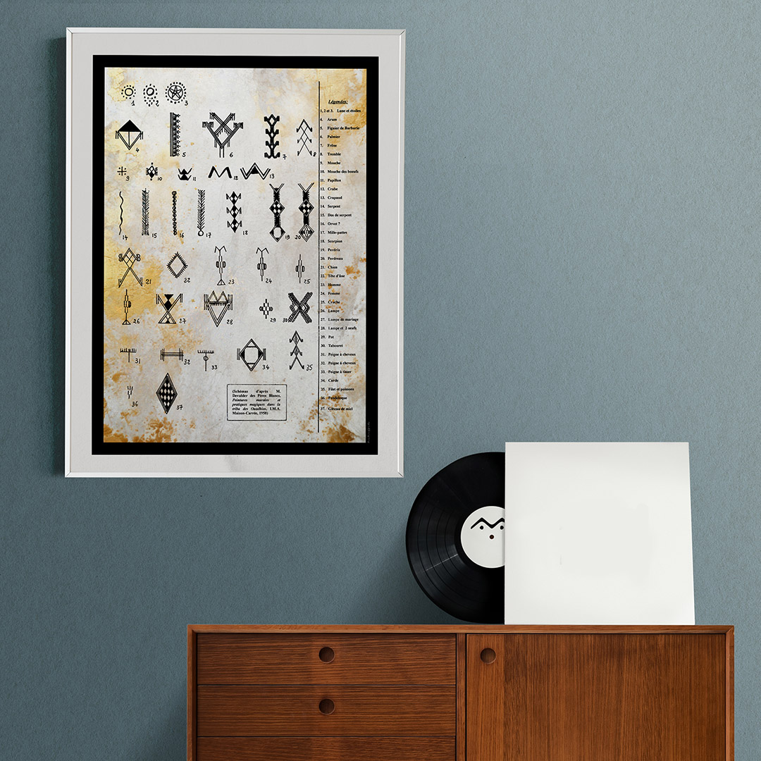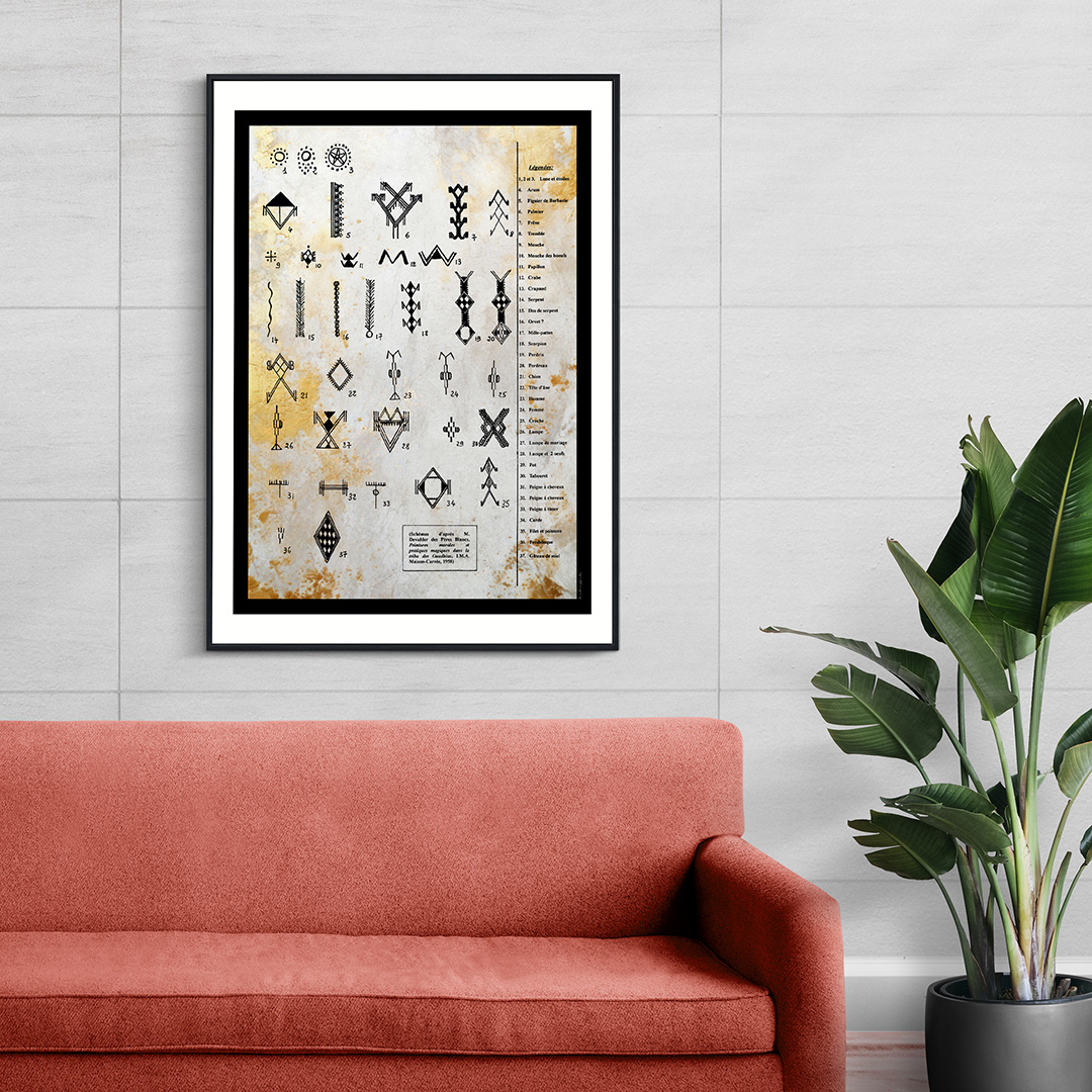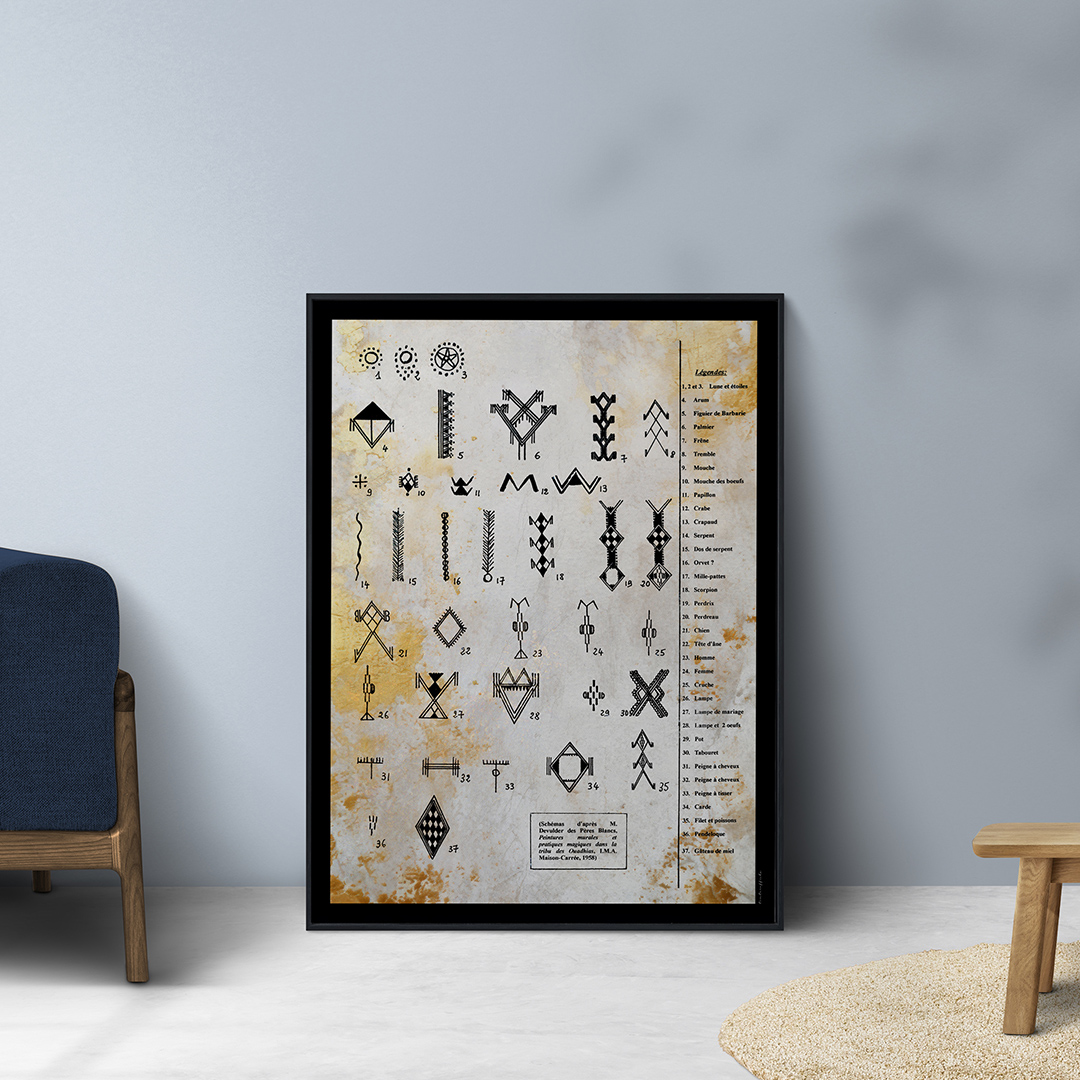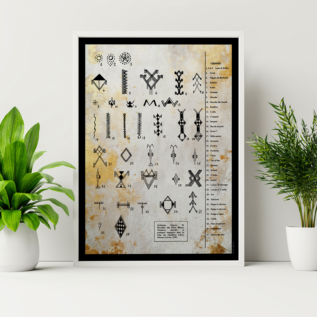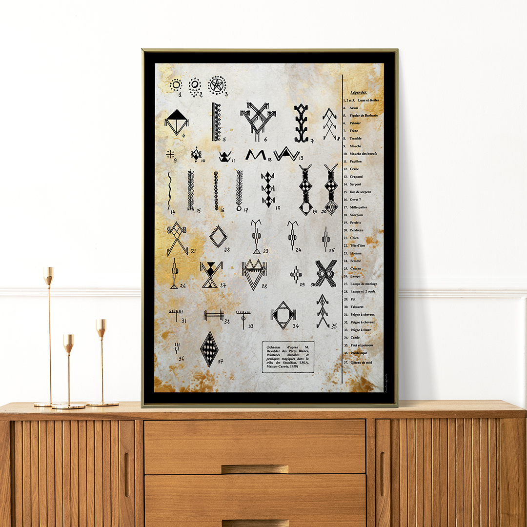 Plongez dans l’univers mystérieux et fascinant des tableaux berbères décoratifs avec cette œuvre unique mêlant esthétique traditionnelle et dimension éducative. Inspiré des tatouages ancestraux, de la poterie kabyle et des gravures rupestres, ce tableau met en valeur les symboles amazighs (berbères) tout en offrant leurs significations en français. Un art mural qui allie beauté et transmission culturelle.