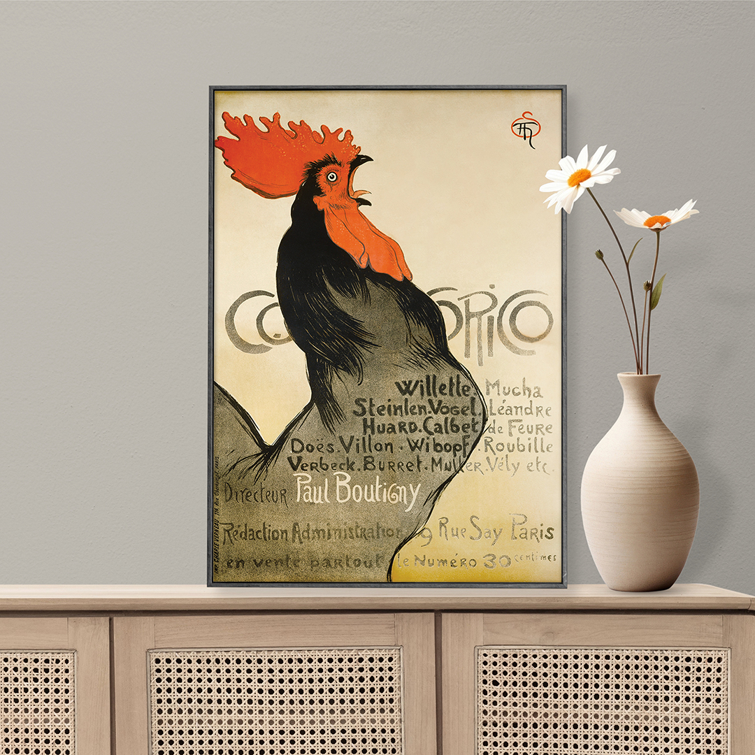 Le coq représenté sur l’affiche vintage art Cocorico est plus qu’un simple animal. Il incarne l’allégorie de la France : fierté, vitalité et créativité. Grâce à son style fluide et décoratif, Steinlen inscrit cette lithographie dans le courant de l’Art nouveau, mouvement majeur de la fin du XIXe siècle.