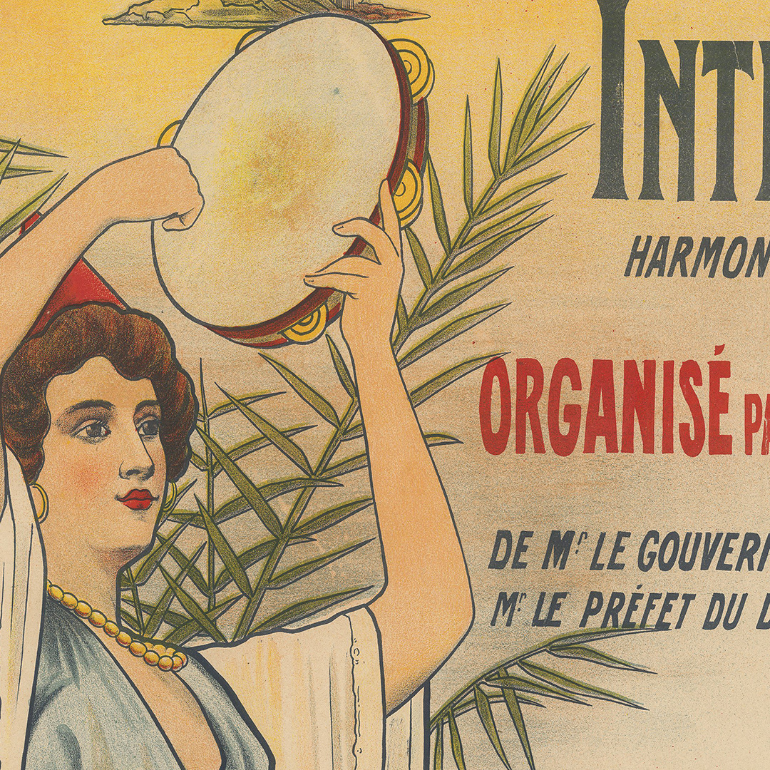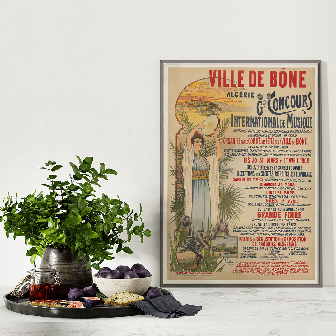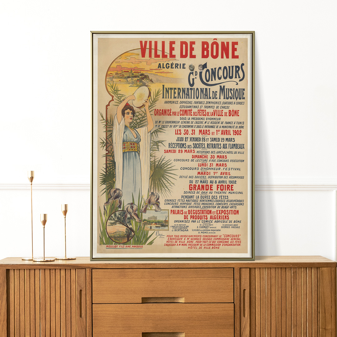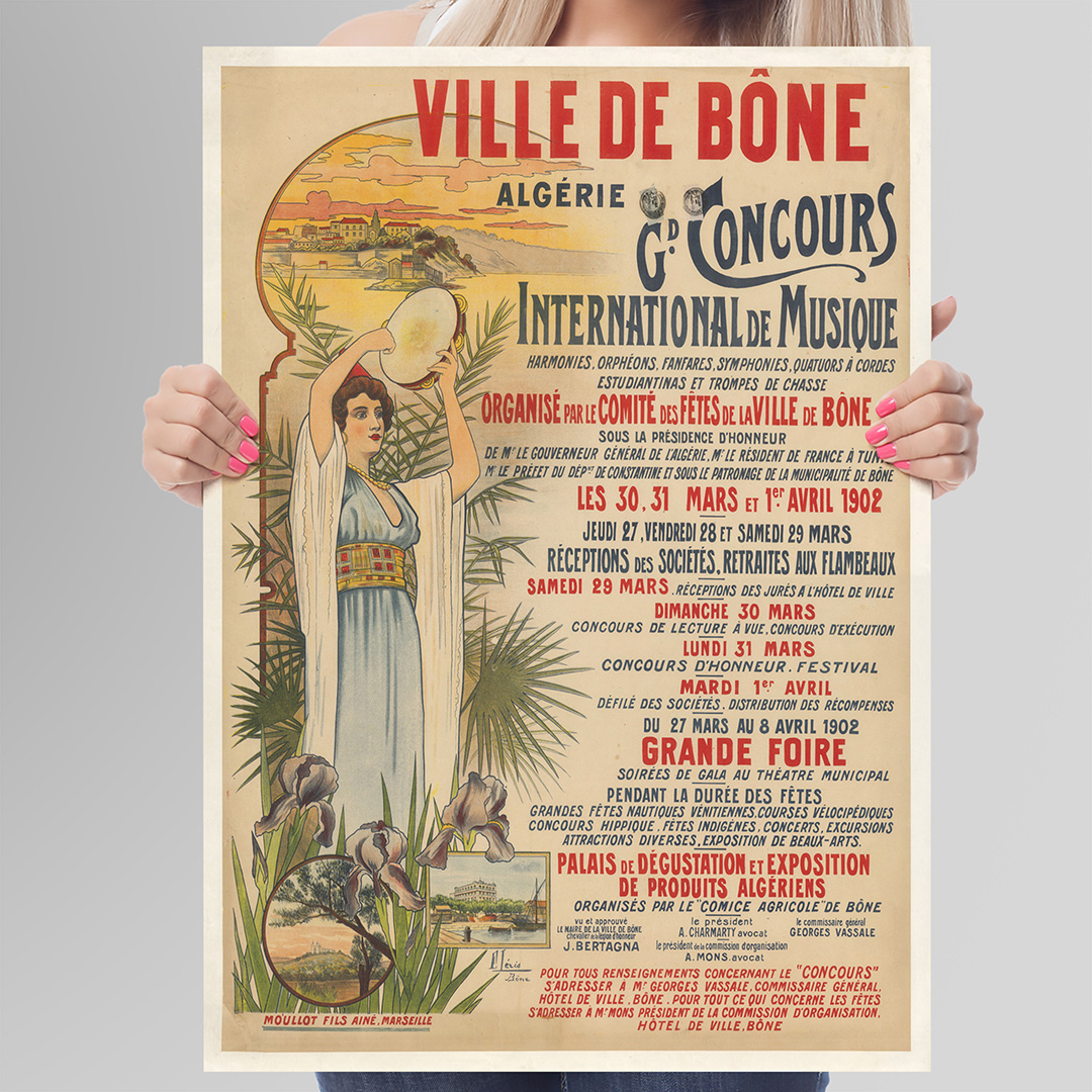L’affiche Algérie vintage Ville de Bône — Grand Concours International de Musique (1902) est une œuvre emblématique de la Belle Époque. Elle rend hommage à un grand événement culturel organisé à Bône, aujourd’hui Annaba, en 1902.